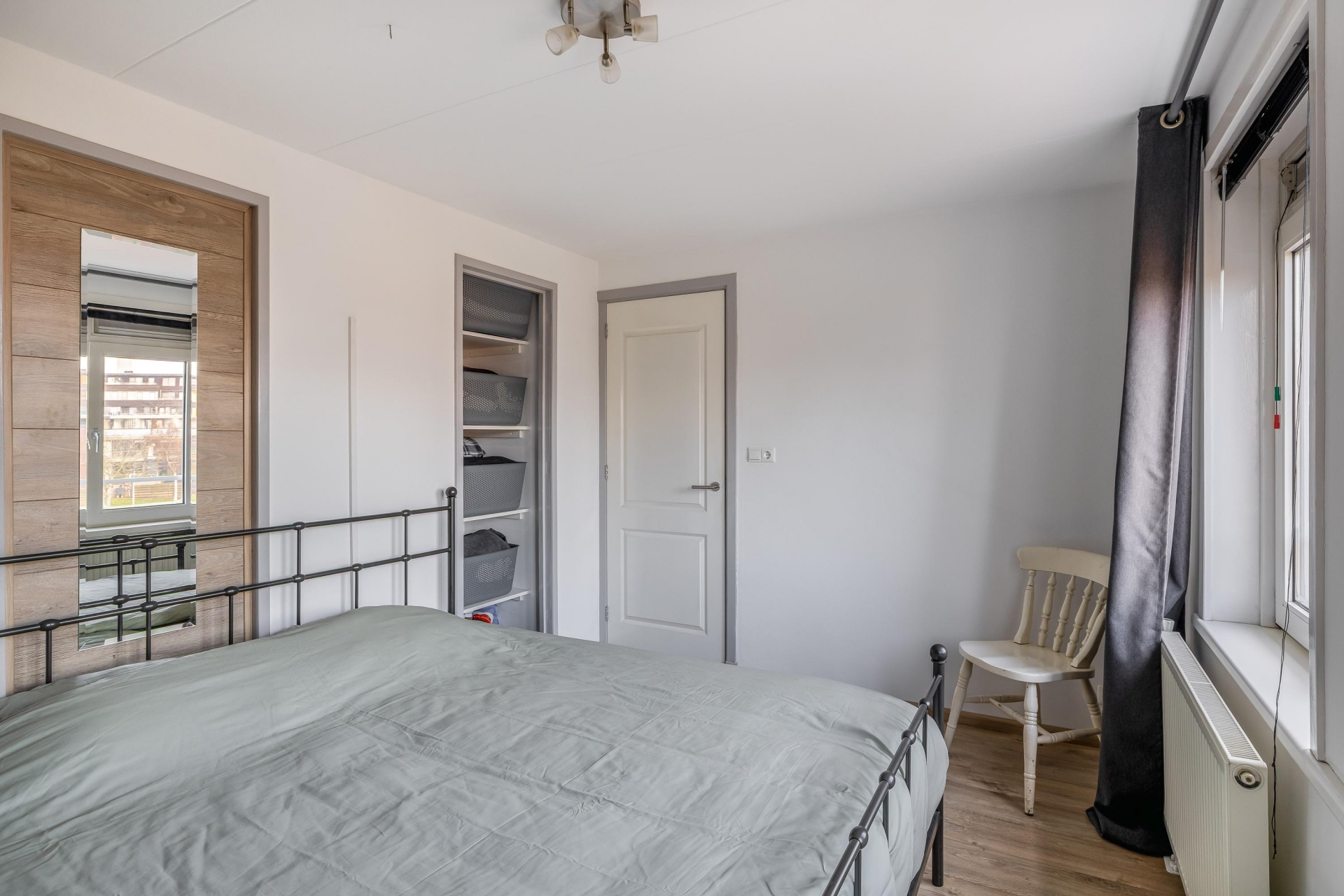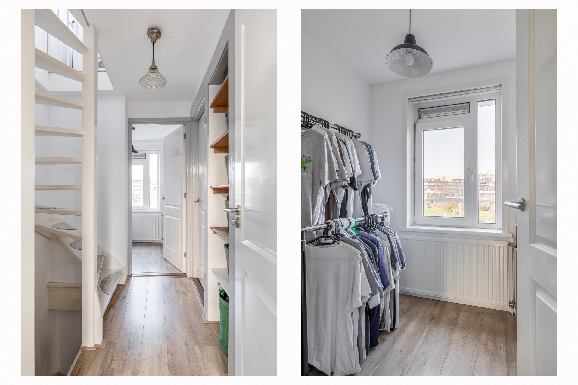De eerste verdieping vormt het hart van de woning. Hier vind je de royale doorzon woonkamer, met grote raampartijen en een prachtig uitzicht aan de voorzijde. Aan de achterzijde heb je toegang tot een balkon over de volle breedte van het huis, een fijne plek om buiten te zitten. De functionele keuken ligt aan de achterzijde en is praktisch ingericht. Verder beschikt deze verdieping over een apart toilet en een extra kamer aan de voorzijde. Deze is perfect in te zetten als werkkamer, hobbyruimte of compacte logeerkamer.