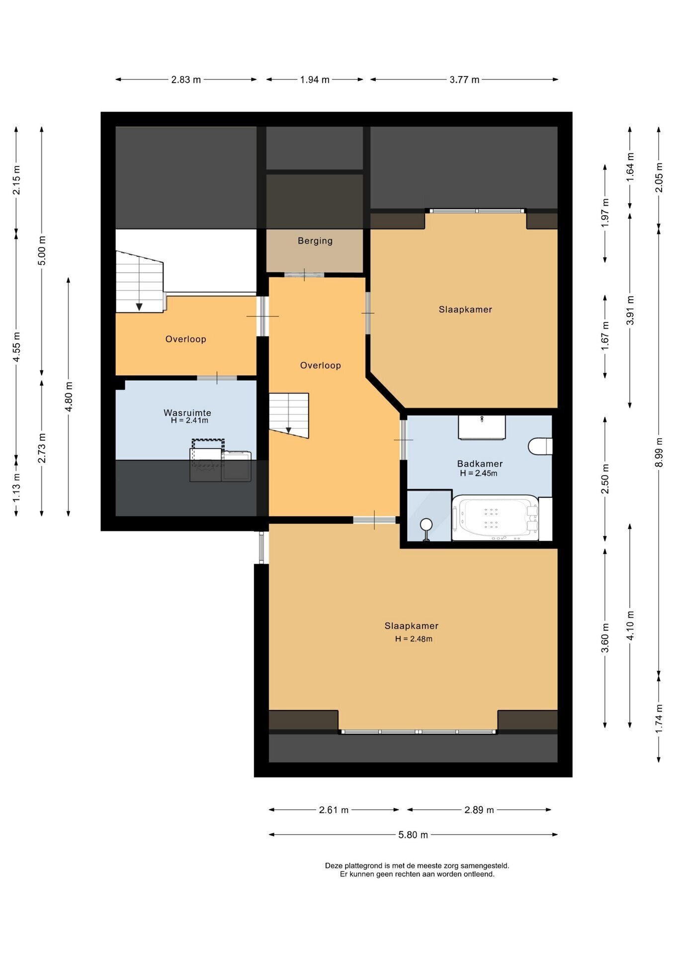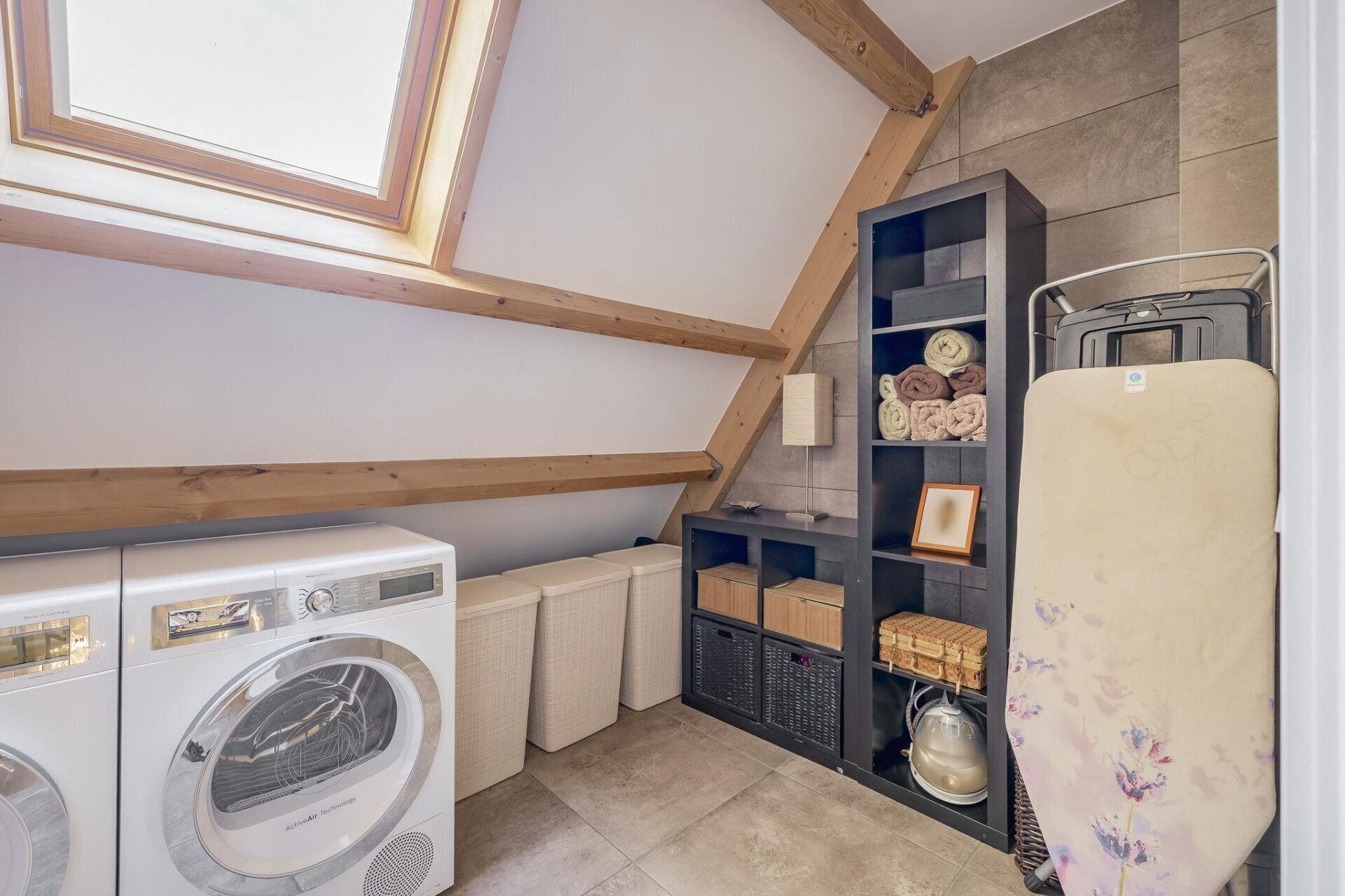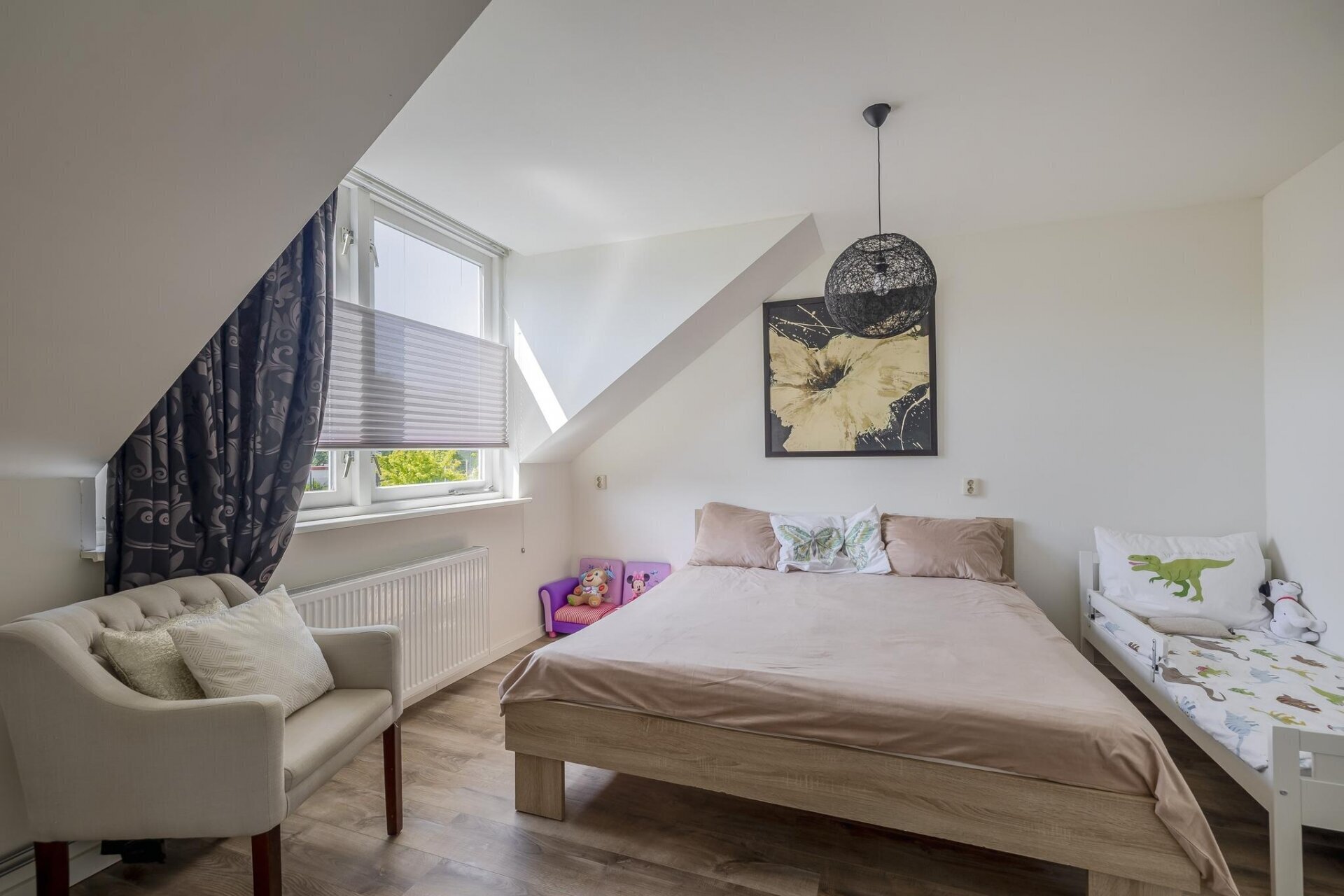 Op de verdiepingen vind je meerdere slaapkamers, waarvan de grootste zich op de eerste etage bevindt. In totaal telt het woondeel vier kamers, dus plek genoeg voor een gezin, een thuiskantoor of logeerkamer. De zolderverdieping is bereikbaar via een vaste trap en biedt nog extra mogelijkheden voor bijvoorbeeld een hobbyruimte of opslag.