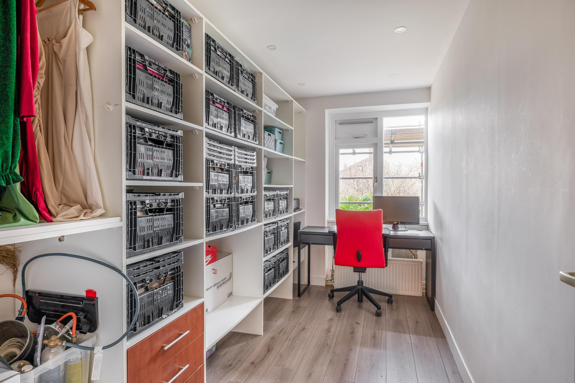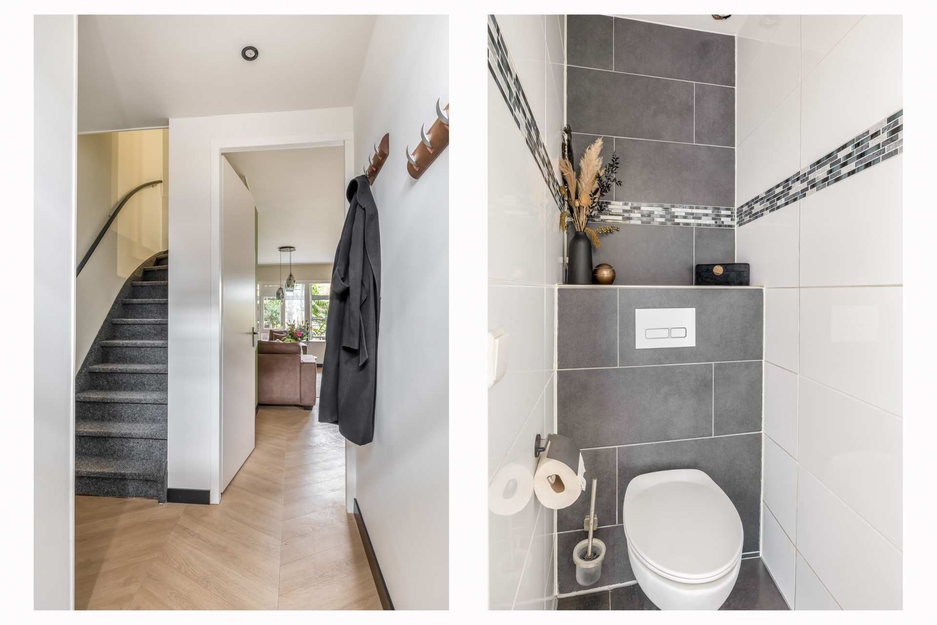 Stap binnen in een ruime en lichte woonkamer met een moderne en open uitstraling. Dankzij de grote raampartijen valt er veel daglicht naar binnen, wat samen met de vloerverwarming zorgt voor een aangename basis op de begane grond. De woonkamer biedt voldoende plek voor een gezellige zithoek én een royale eethoek voor dagelijks gebruik of etentjes met vrienden en familie. Vanuit de woonkamer heb je direct zicht en toegang tot de achtertuin; een prettige verbinding tussen binnen en buiten.