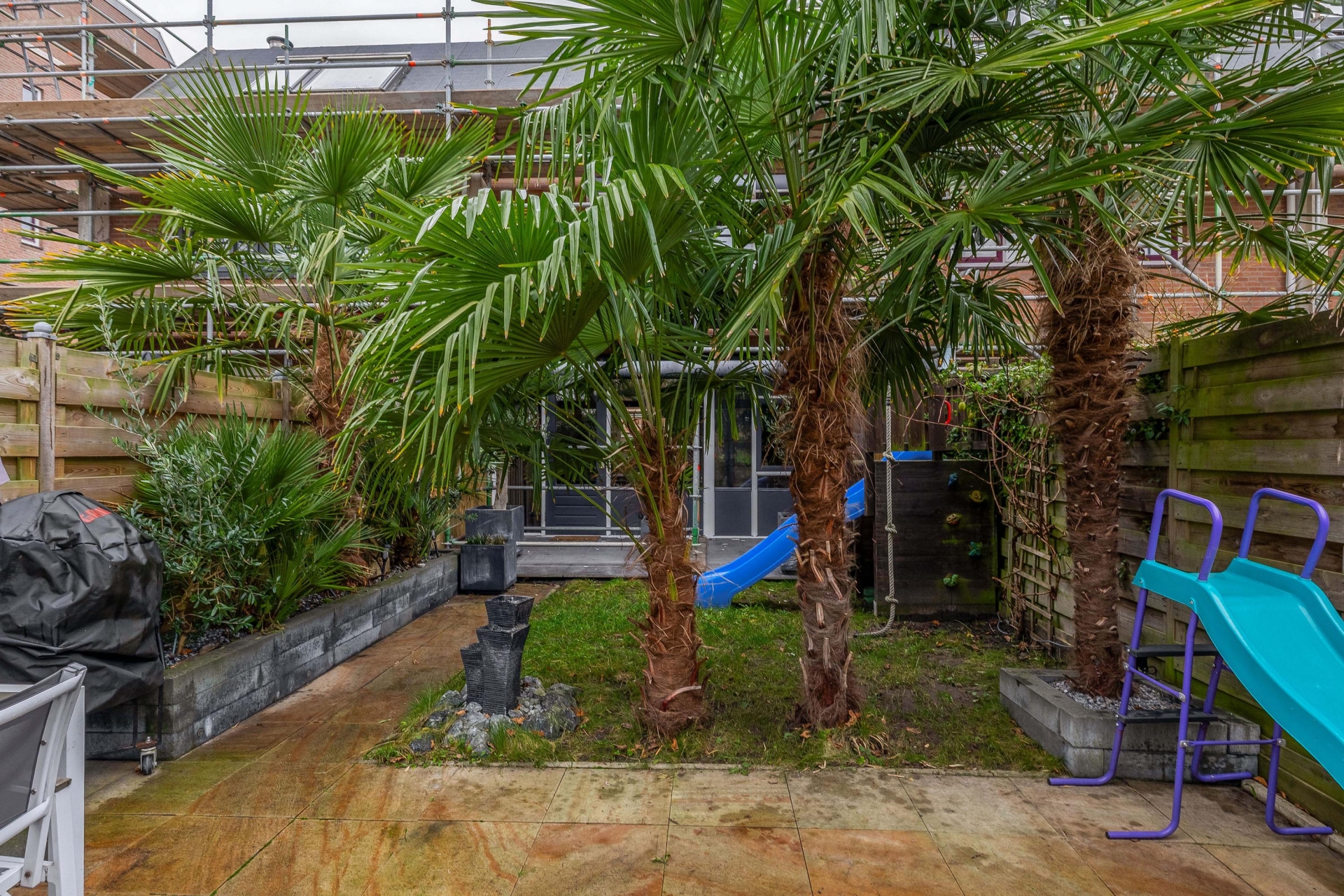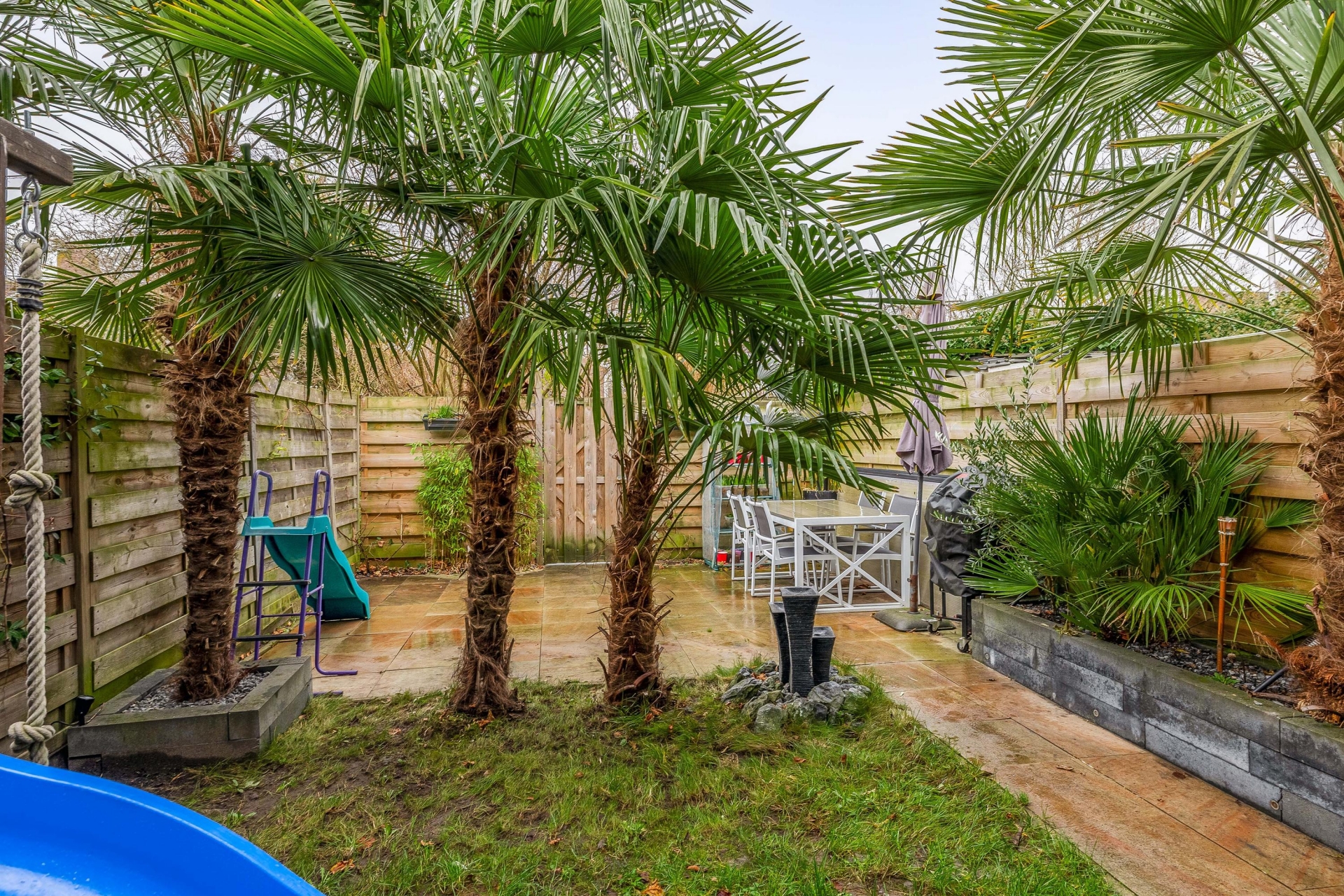 De achtertuin, gelegen op het oosten, is een echte eyecatcher. Dankzij de fraaie palmbomen krijgt de tuin direct een unieke sfeer. Er is een betegeld terras onder een overkapping, ideaal voor lange zomerse dagen en gezellige barbecues. Het overige tuinonderdeel biedt plek voor groen en speelruimte, met voldoende privacy en een eigen achterom.