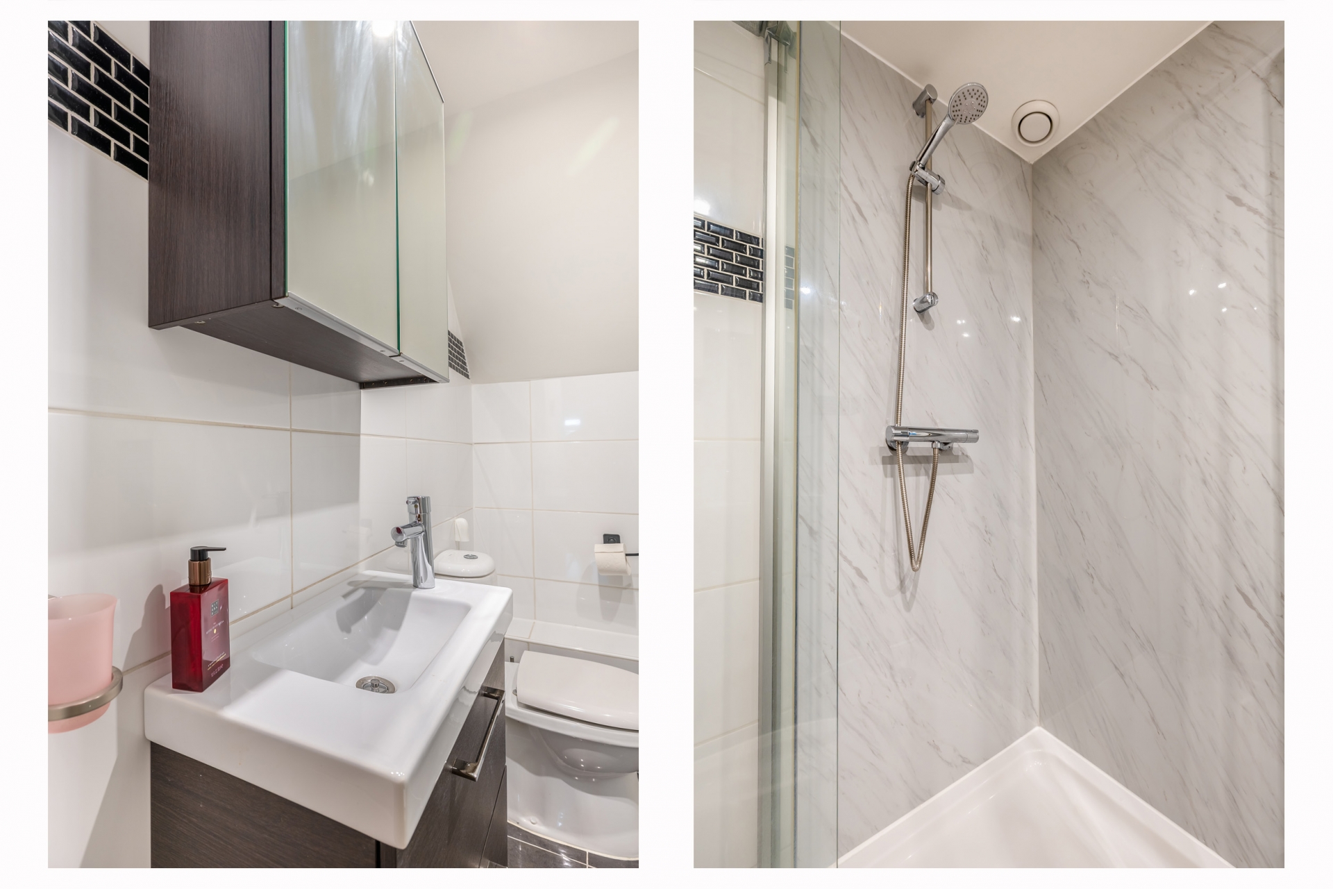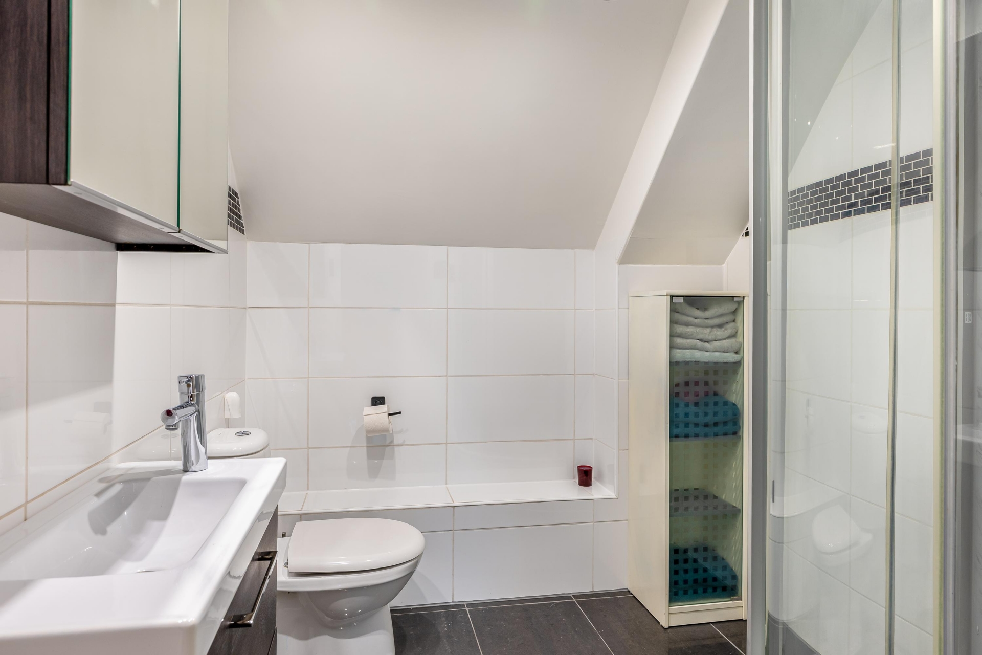 De badkamer is strak en modern. Voorzien van een douchecabine, wastafelmeubel en tweede toilet.