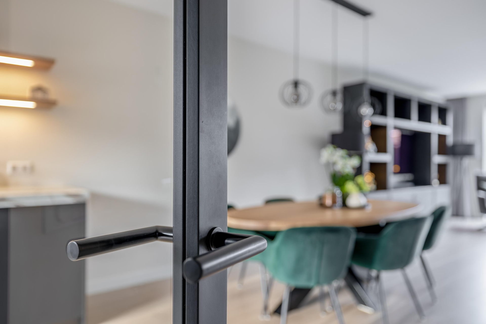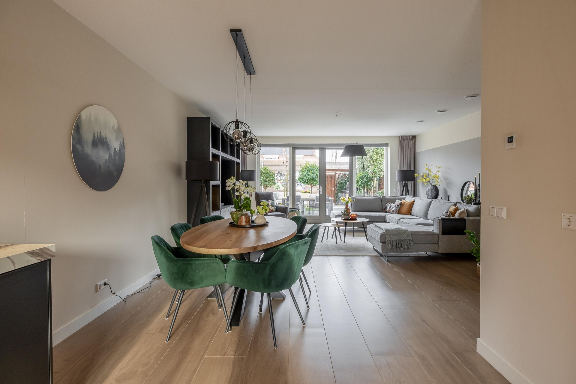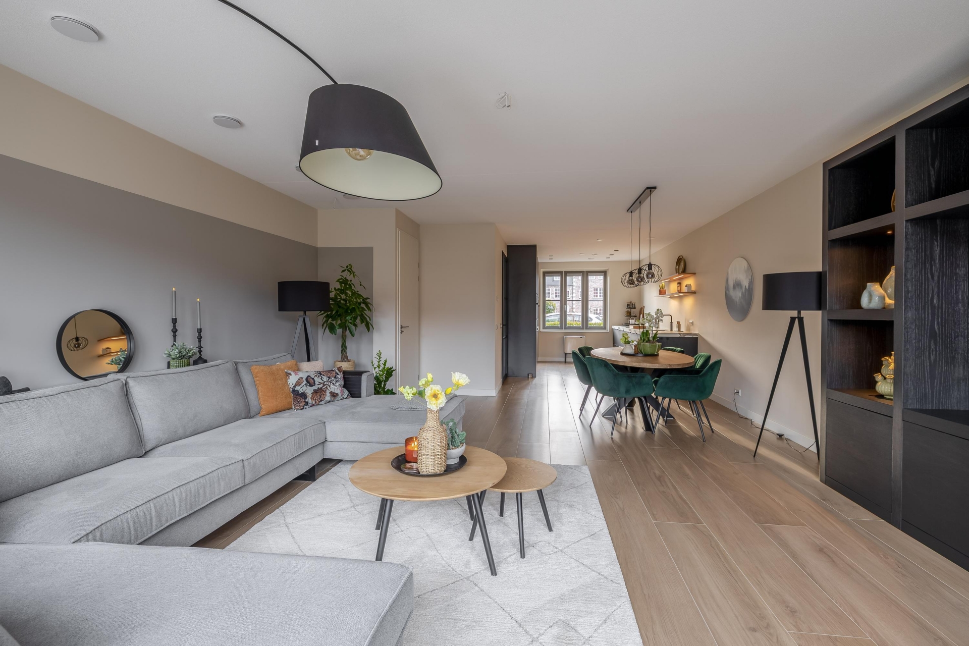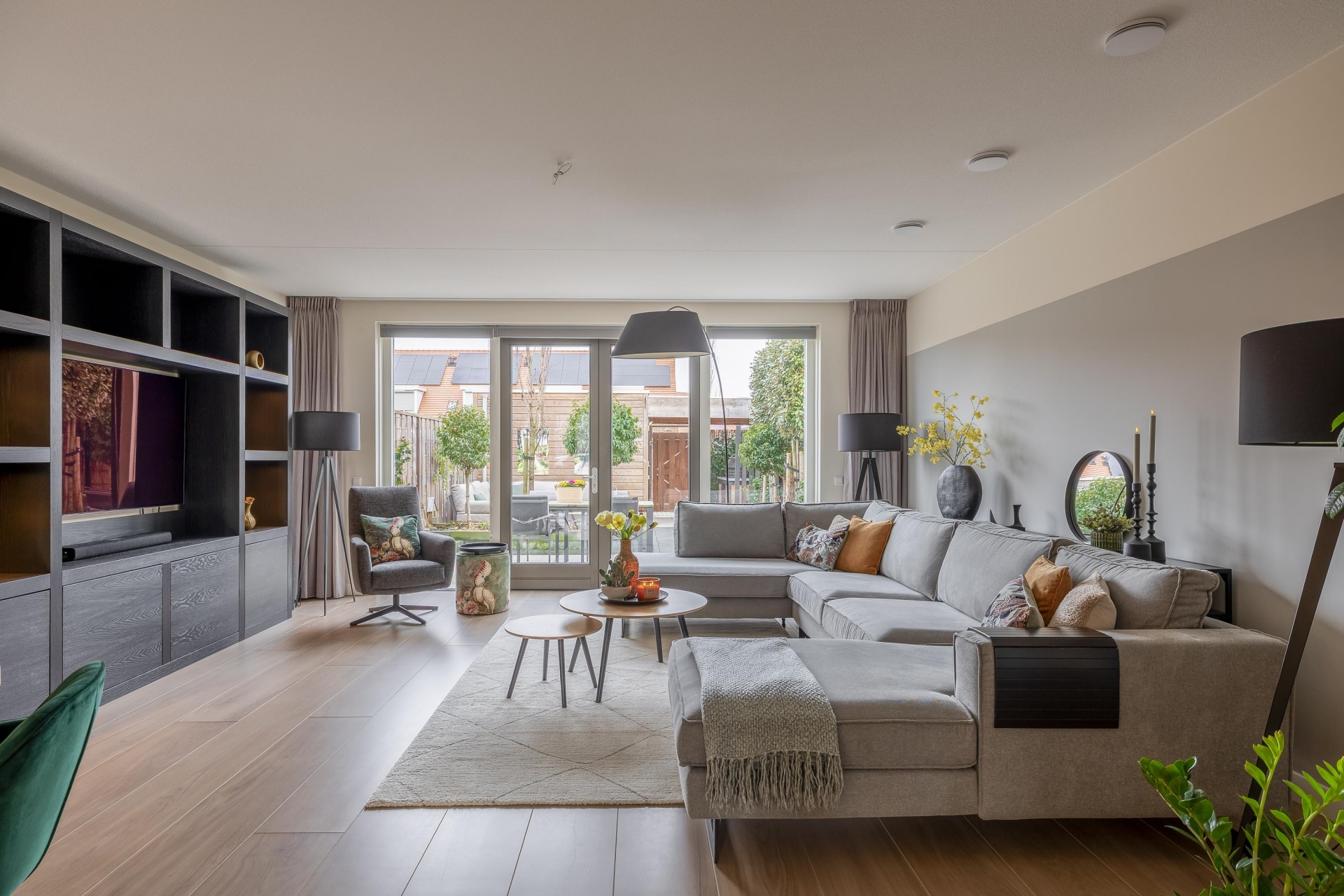 De woonkamer is riant, tuingericht en heerlijk licht dankzij de brede glazen pui met dubbele openslaande deuren aan de achterzijde. De strakke wandafwerking en de mooie vloerafwerking vallen direct op. Er is volop ruimte voor een royale zithoek en een grote eettafel. De openslaande deuren verbinden binnen direct met buiten, waardoor de tuin echt een verlengstuk van de leefruimte wordt.