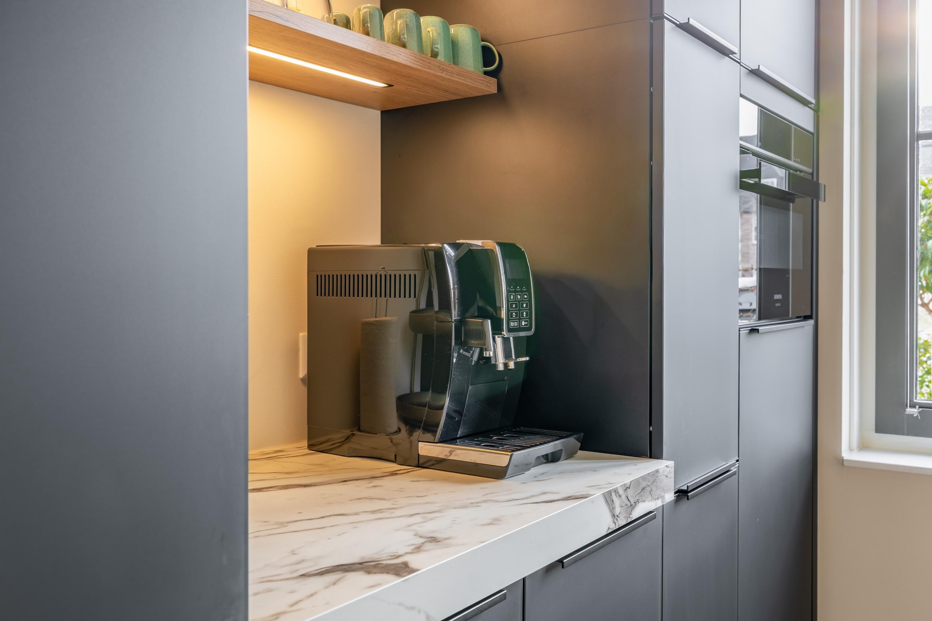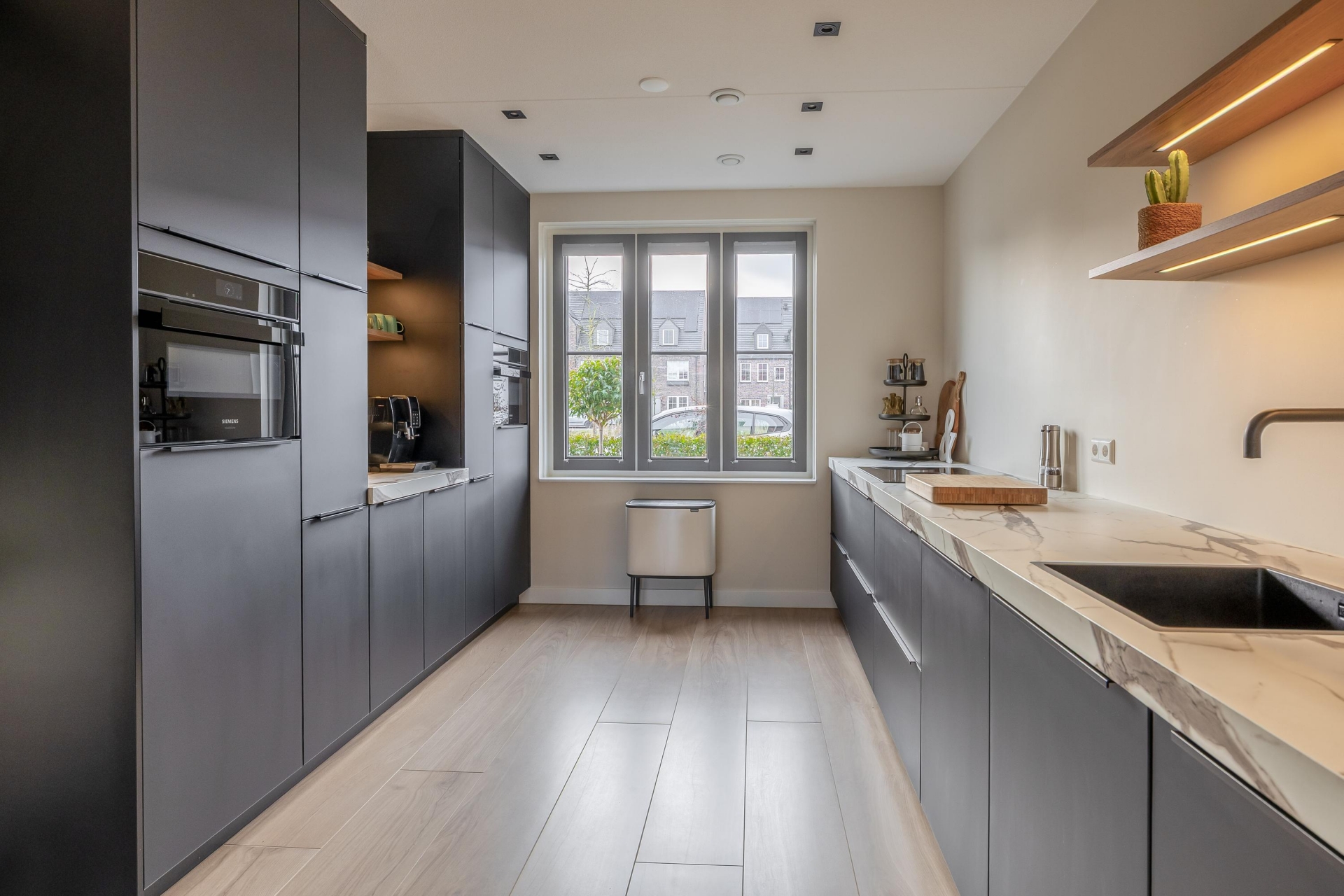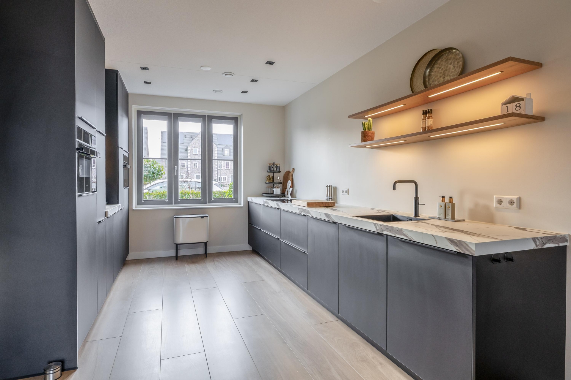 Aan de voorzijde is de luxe keuken gesitueerd. Deze keuken in parallel opstelling met zwarte fronten en een marmerlook werkblad geeft direct een stijlvolle uitstraling, een echte eyecatcher! Uiteraard is de keuken voorzien van alle benodigde luxe inbouwapparatuur. Hier kook je met gemak voor een groot gezelschap!