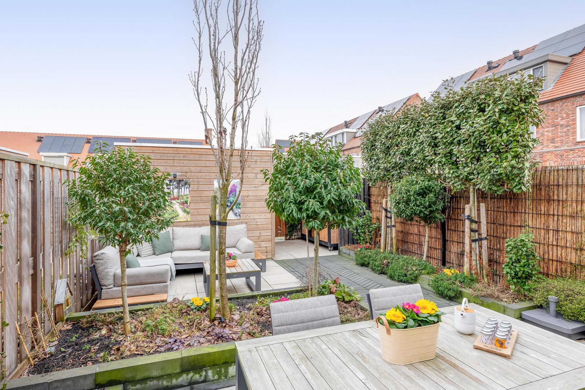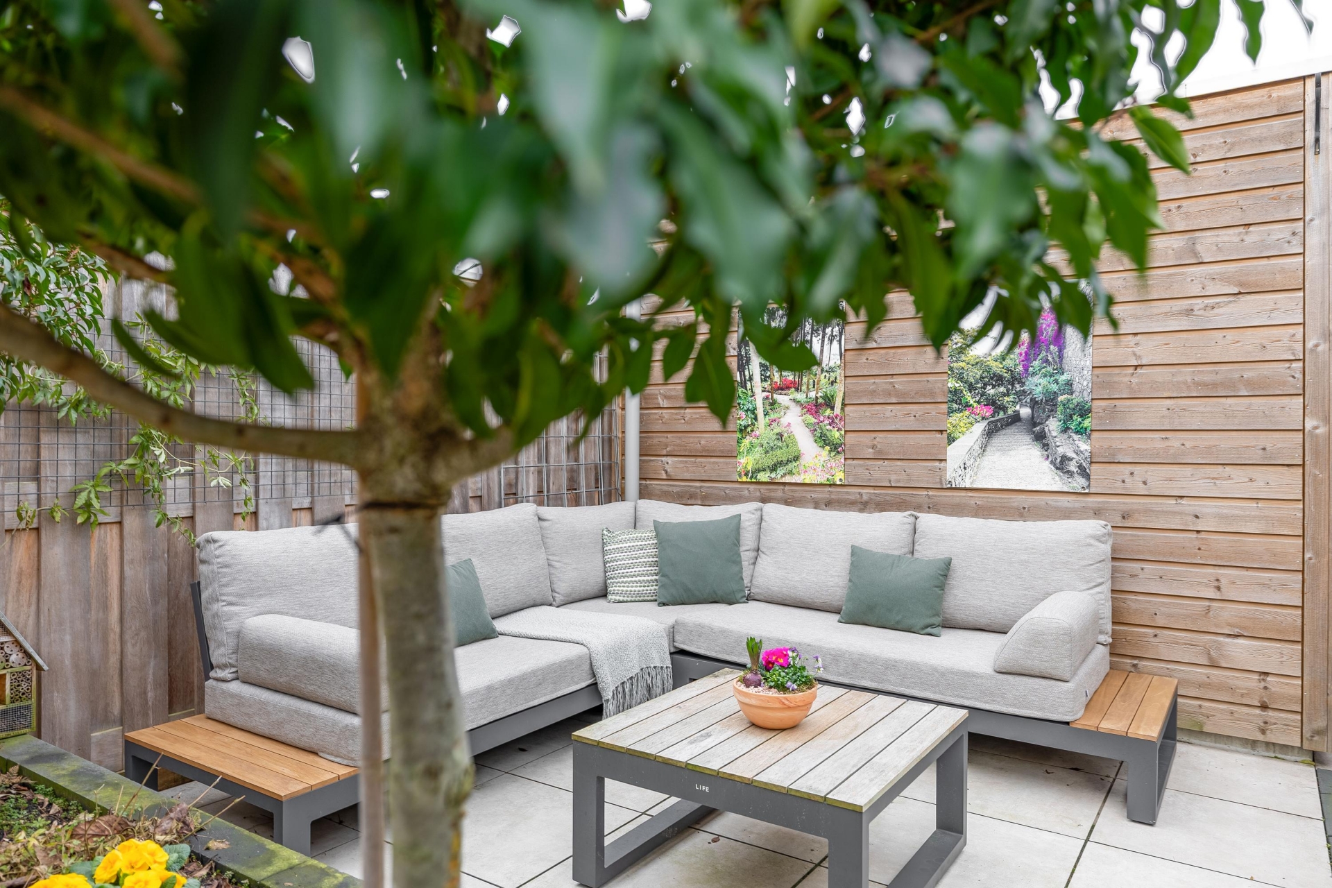 De diepe achtertuin is fraai aangelegd met mooie beplanting, twee terrassen, een border en een veranda naast de berging. Door de ligging op het noordwesten geniet je hier van de middag- en avondzon. Er is voldoende ruimte voor een loungehoek, een eettafel en speelruimte voor kinderen.