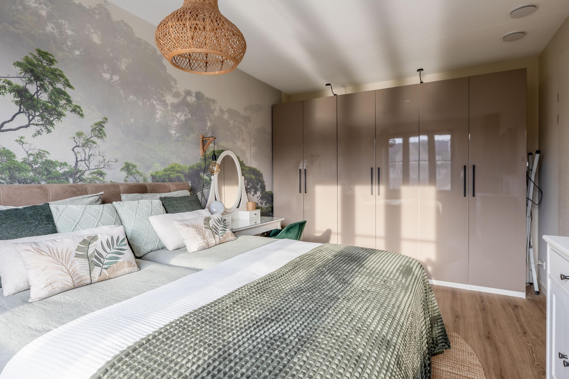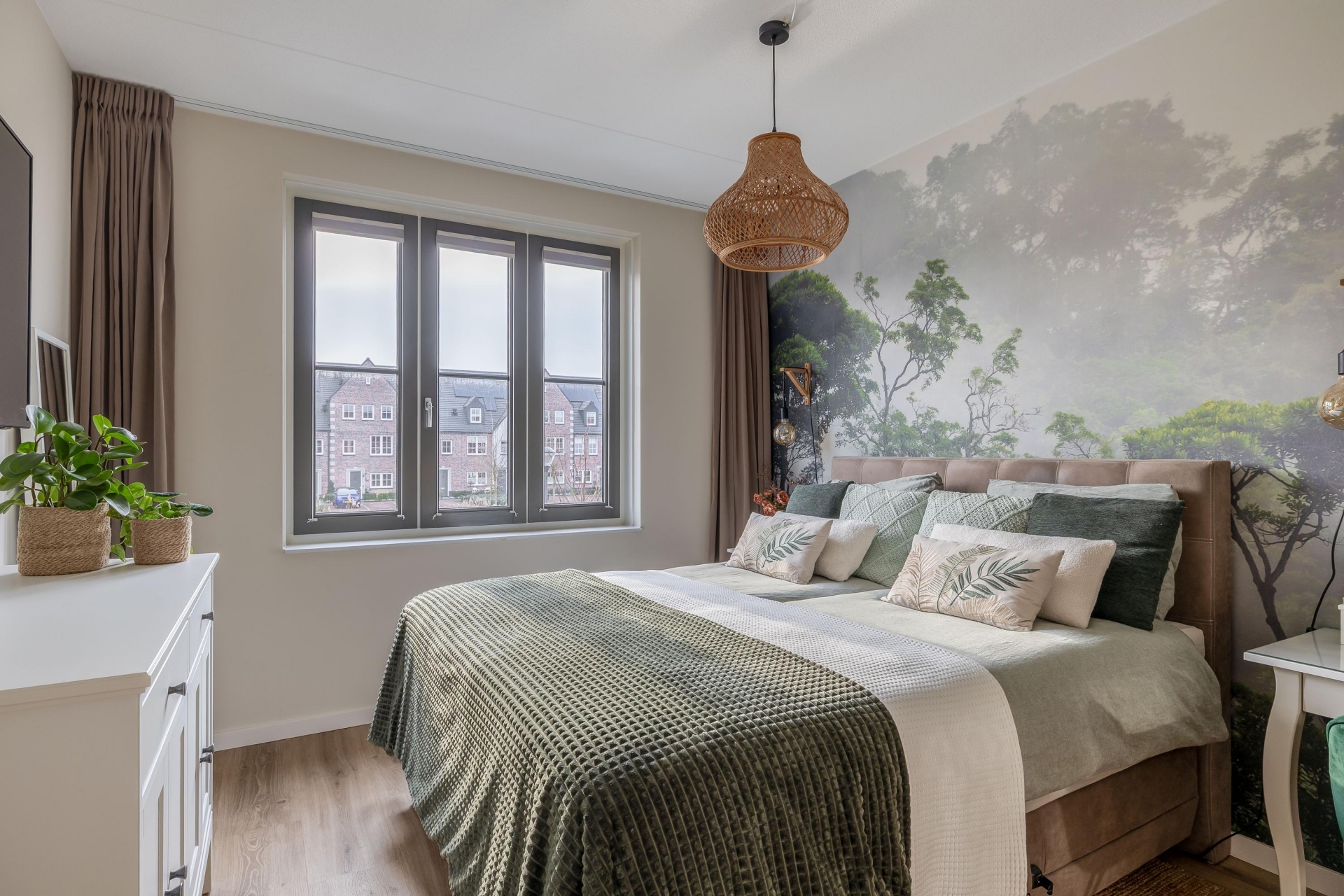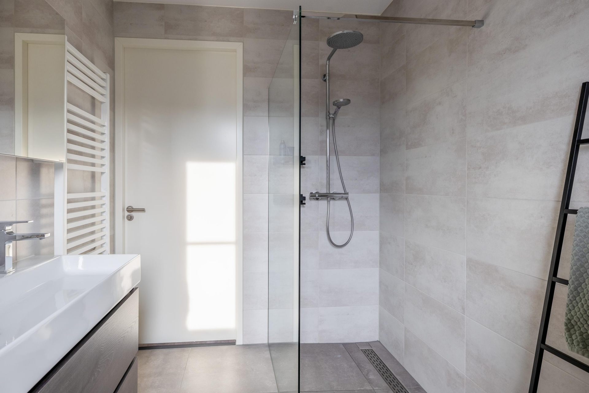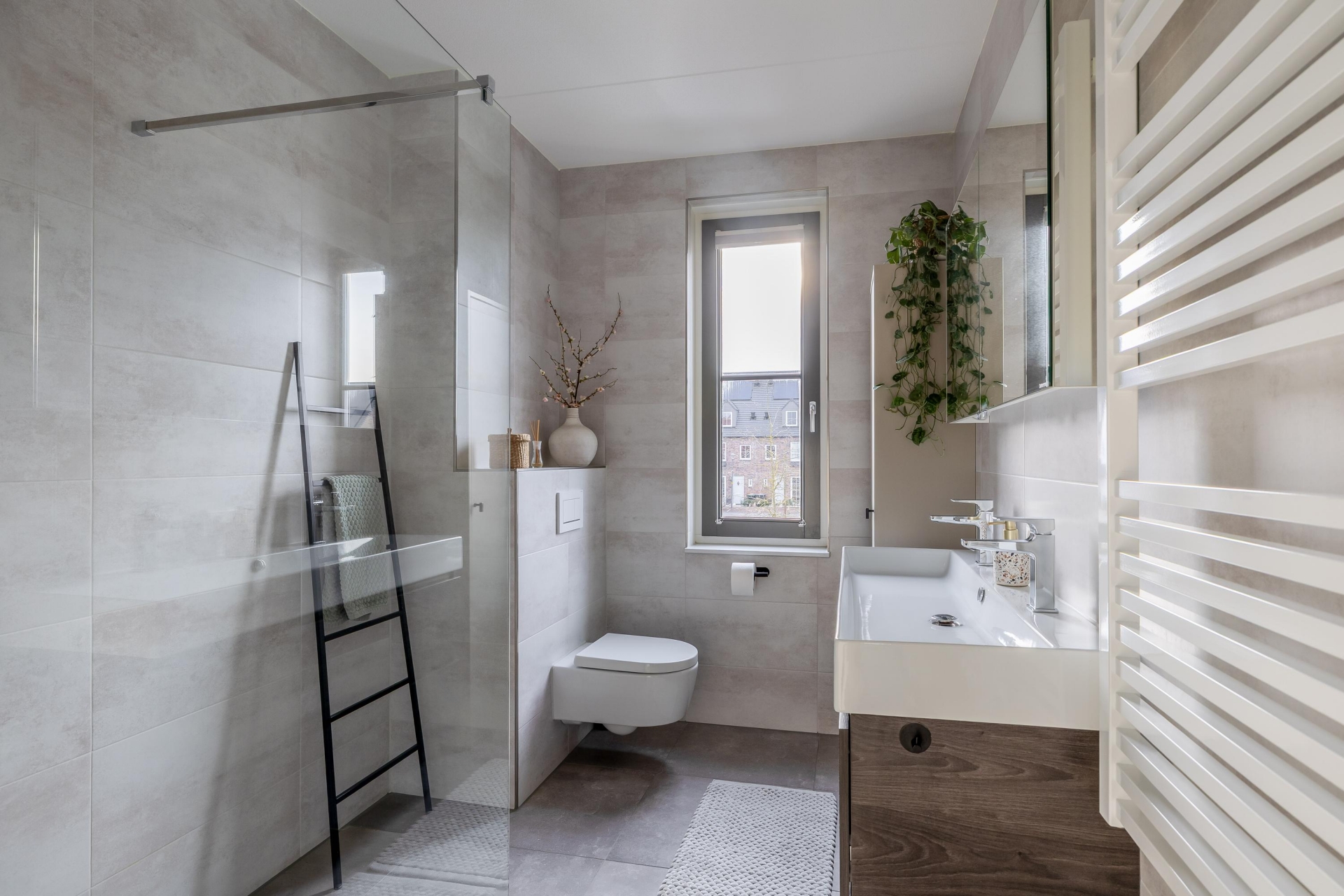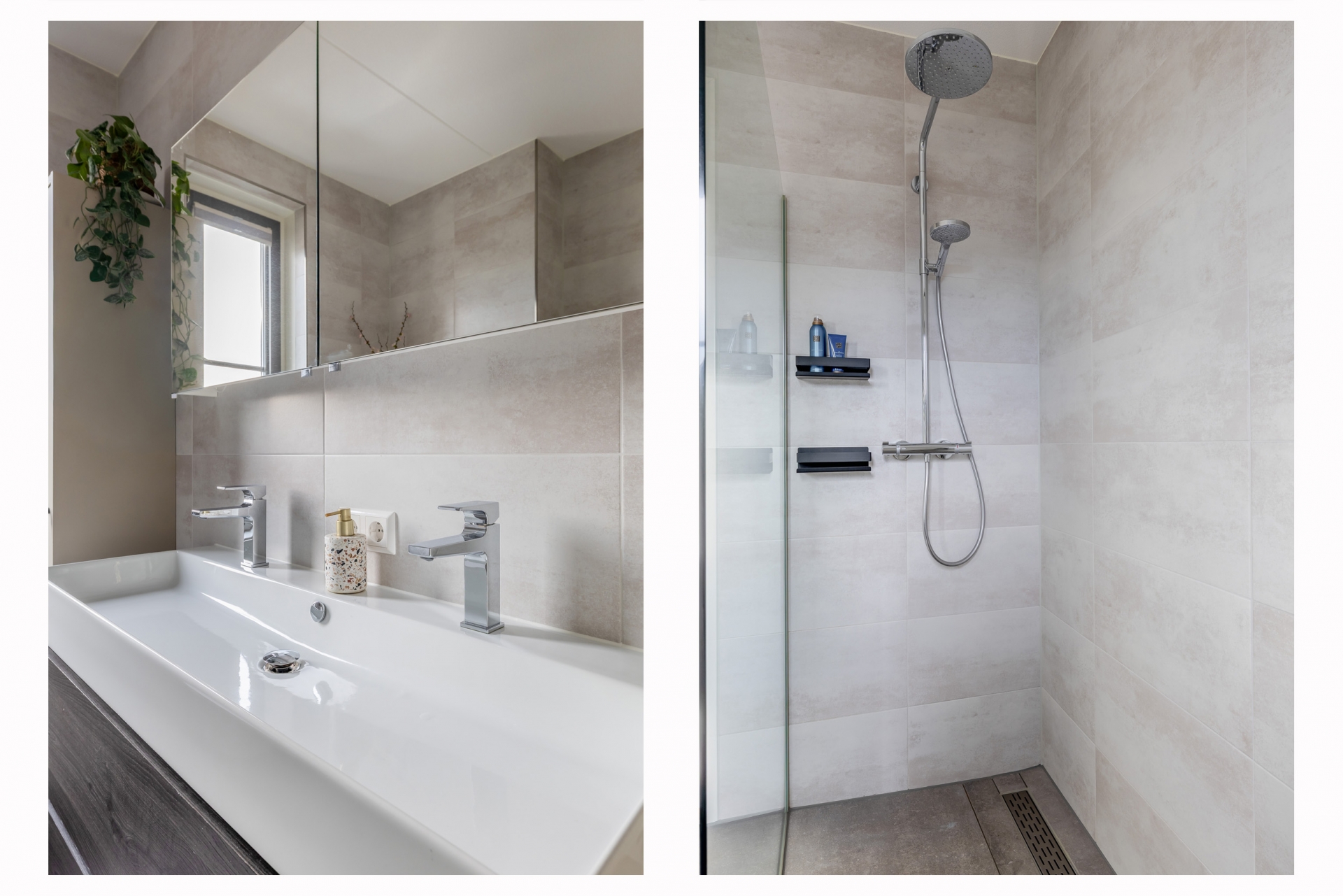 Op de eerste verdieping bevinden zich drie ruime slaapkamers en de eerste badkamer. De grootste slaapkamer biedt meer dan voldoende ruimte voor een kingsize bed en een grote kastenwand. De overige kamers zijn ideaal als kinderkamer, werkkamer of logeerkamer. De badkamer is strak en modern uitgevoerd met betonlook tegels, een royale inloopdouche met regendouche en een stijlvol wastafelmeubel. Alles is netjes afgewerkt en voelt als nieuw, wat ook logisch is bij een huis uit 2022.