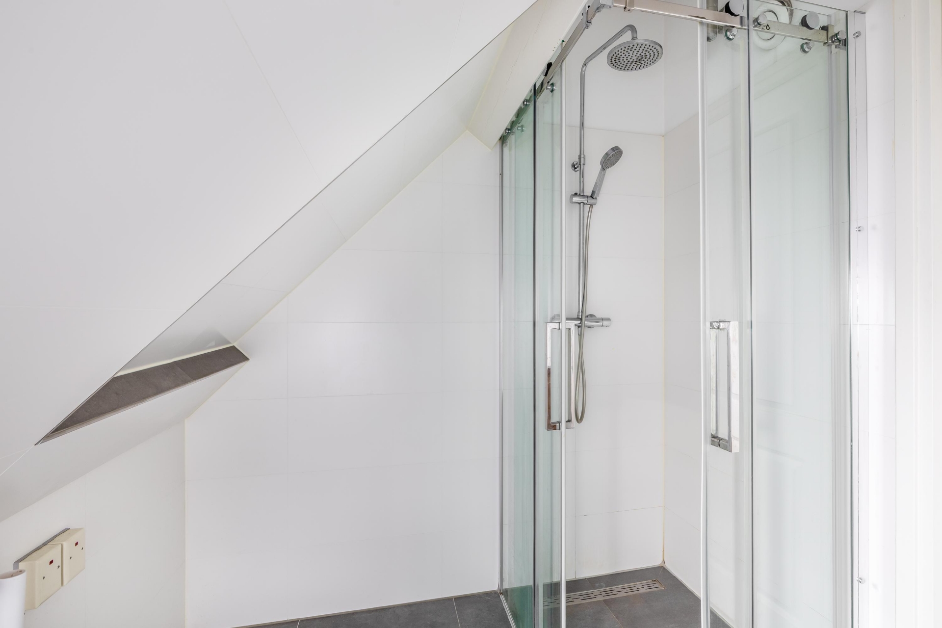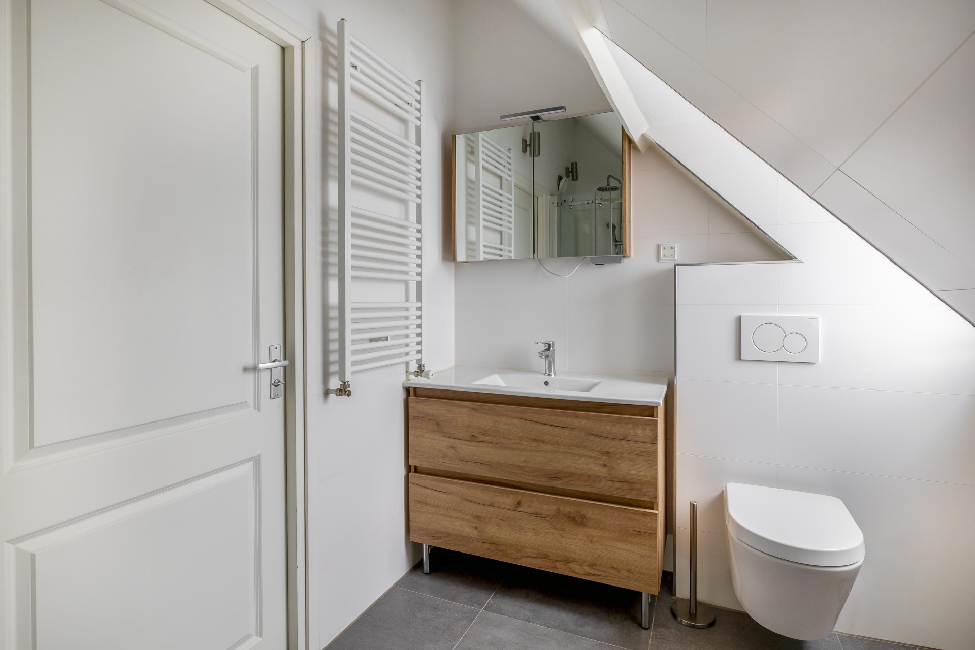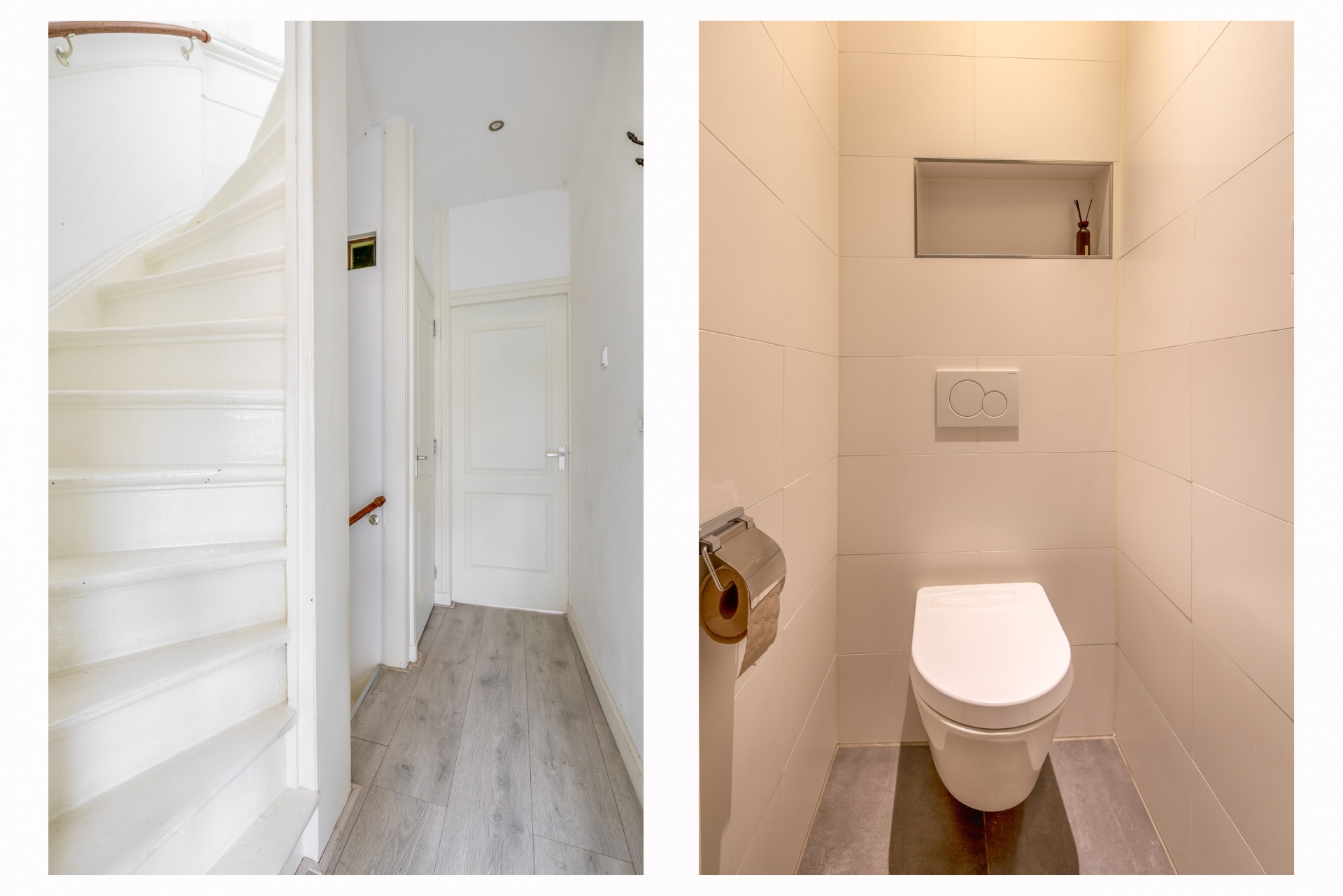 Op deze woonlaag vind je ook een separaat toilet en een praktische trapkast. De combinatie van lichte vloeren, witte wanden en hoge plafonds draagt bij aan het gevoel van ruimte.