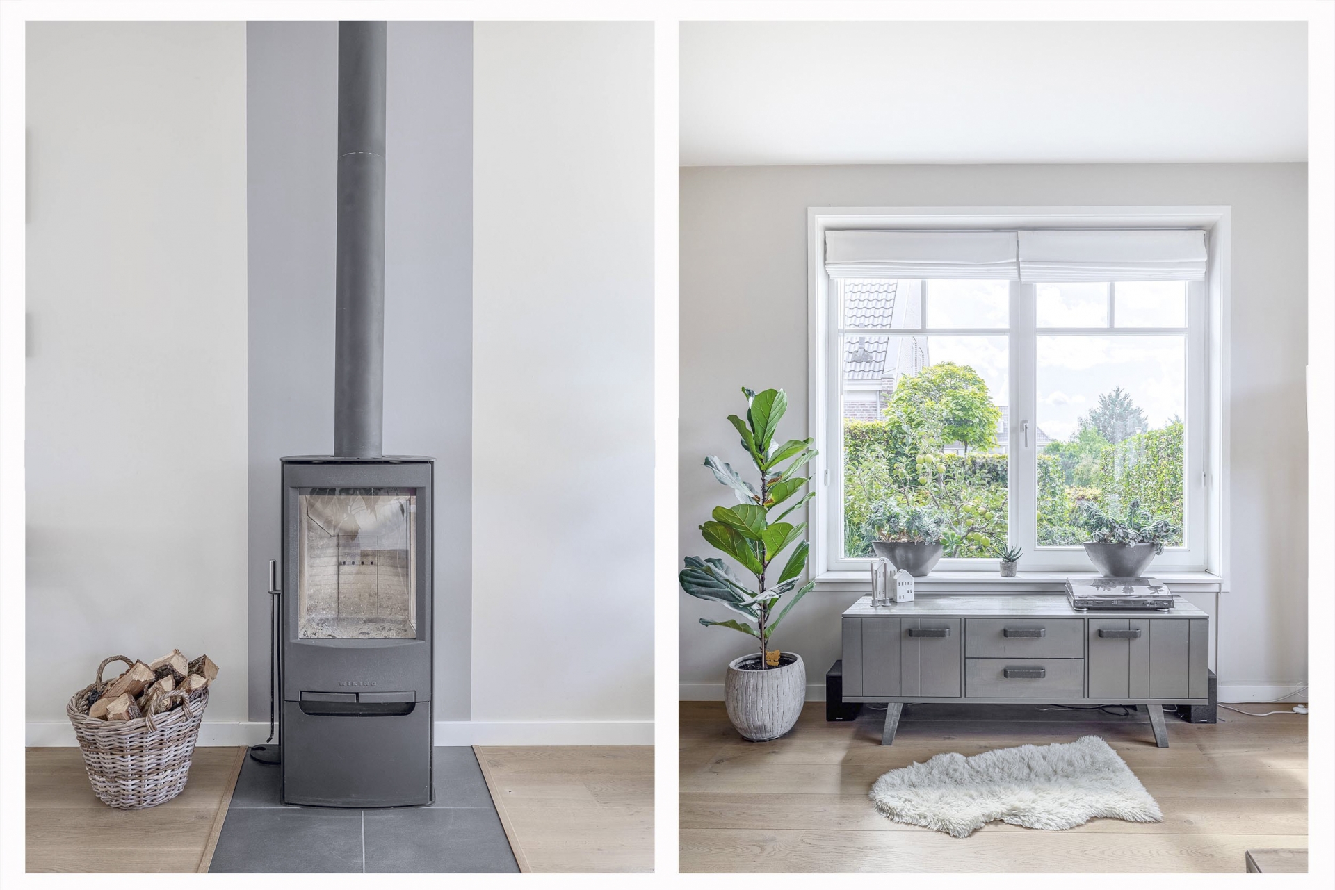 Wat direct opvalt als je binnenkomt? De ruimte en het licht. De woonkamer aan de voorzijde strekt zich uit over de volledige breedte van het huis en is ingericht met grote raampartijen aan meerdere zijden. Hierdoor komt het daglicht van alle kanten naar binnen. De eikenhouten vloer, strak gestucte wanden en warme kleuraccenten zorgen voor een huiselijke en moderne sfeer.