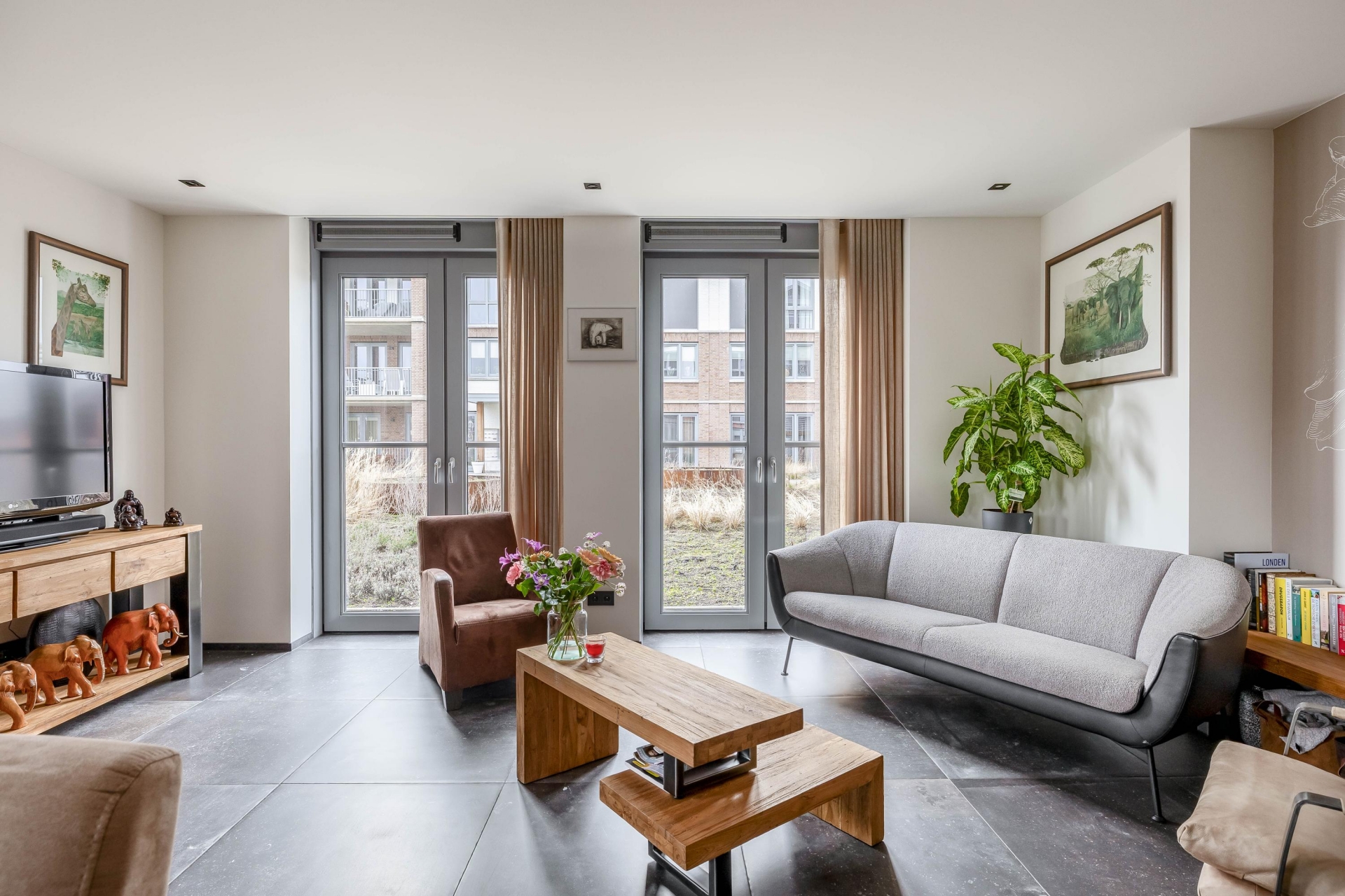 De woonkamer is royaal opgezet en opvallend licht dankzij de grote raampartijen en dubbele deuren naar het terras. De hoge ramen met HR+++ glas zorgen niet alleen voor veel daglicht, maar ook voor uitstekende isolatie. De strakke keramische tegelvloer met vloerverwarming (door het hele appartement) geeft een moderne en rustige basis. De indeling is praktisch en comfortabel. Er is veel ruimte voor een royale eettafel én een ruime zithoek. De huidige opstelling laat mooi zien hoe je hier gezellig kunt tafelen met vrienden of rustig kunt genieten van een goed boek met uitzicht naar buiten.