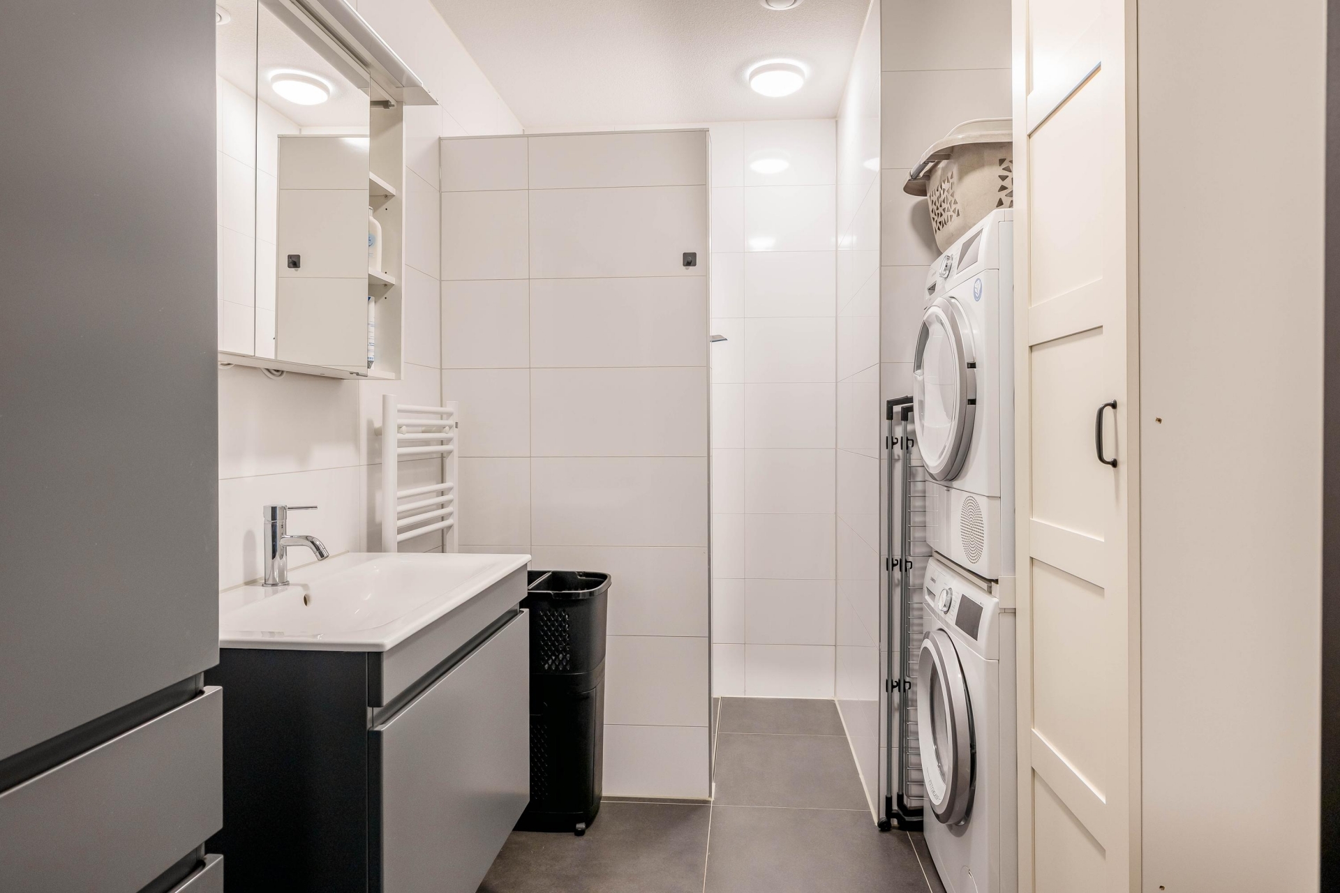 De badkamer is modern en volledig betegeld in lichte tinten. Voorzien van een ruime inloopdouche, tweede toilet, strak wastafelmeubel en wasmachine- en drogeraansluiting. Alles is nieuw en fris, precies wat je verwacht bij een appartement uit 2024. Daarnaast is er een separaat toilet aanwezig. Ook hier zie je de zorgvuldige afwerking.