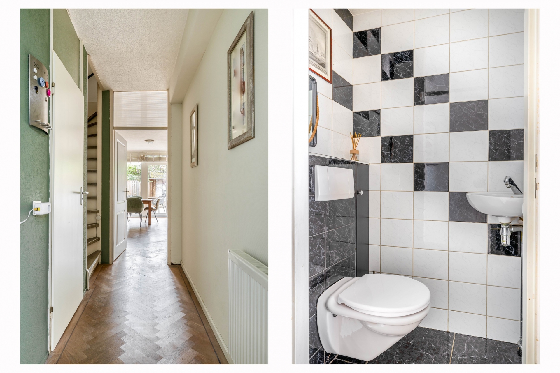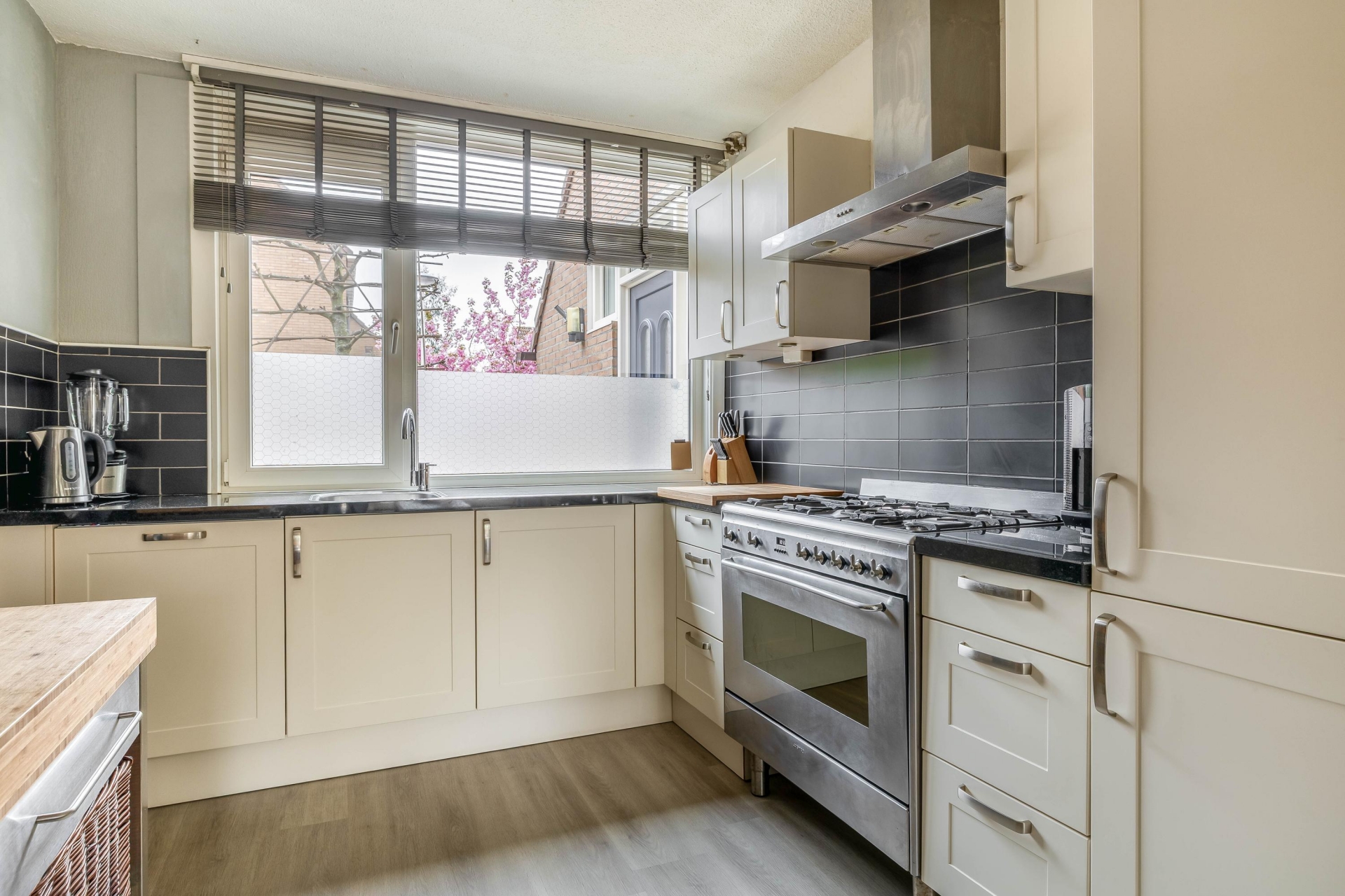 De keuken bevindt zich aan de voorzijde en is praktisch ingedeeld in een hoekopstelling. Hier heb je voldoende werkruimte en kastruimte, terwijl je tegelijkertijd leuk contact houdt met de straatzijde. De indeling van de begane grond is logisch en efficiënt, met daarnaast een hal, toilet en een handige inpandige berging aan de voorzijde.
