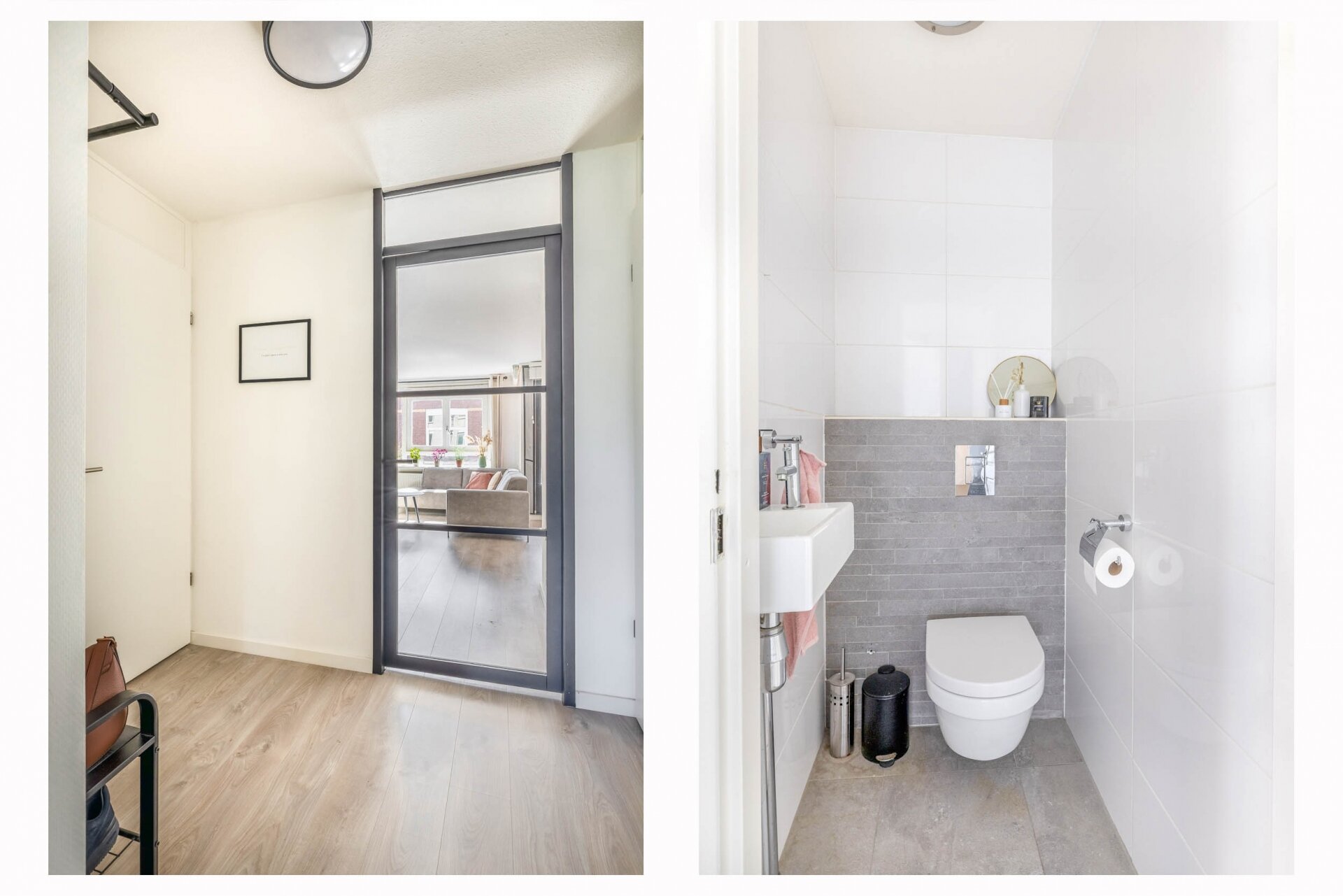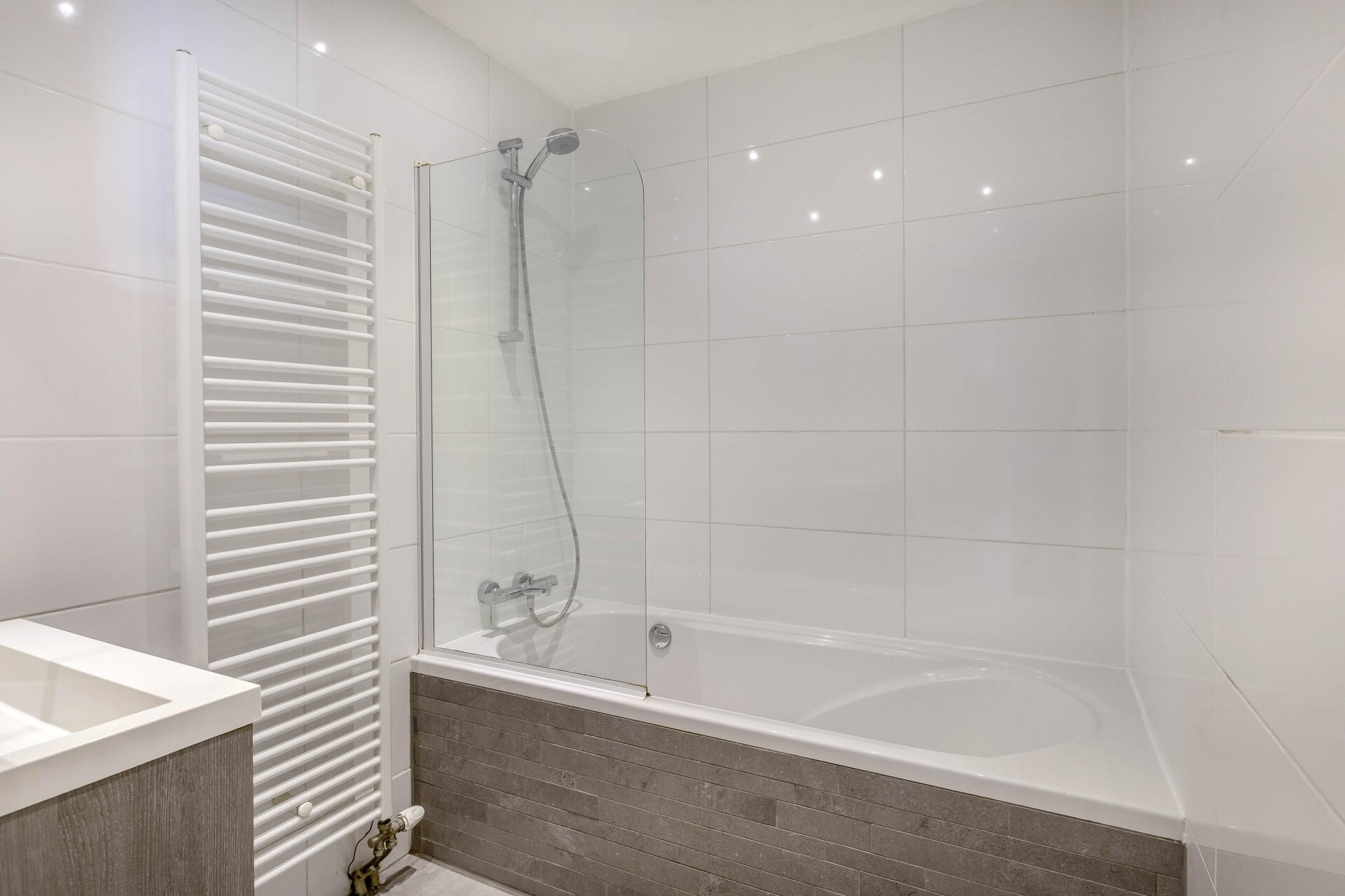 De badkamer is fris en modern ingericht met witte en lichtgrijze tegels, een ligbad met douche, een wastafelmeubel en een radiator. Het toilet met fonteintje bevindt zich apart. Daarnaast heb je een praktische wasruimte en extra berging in de woning.