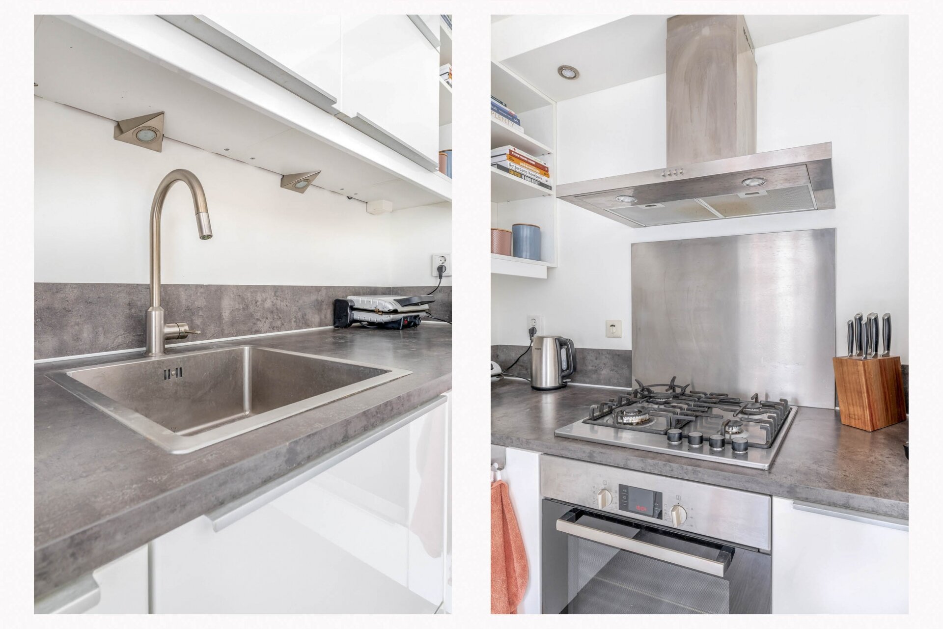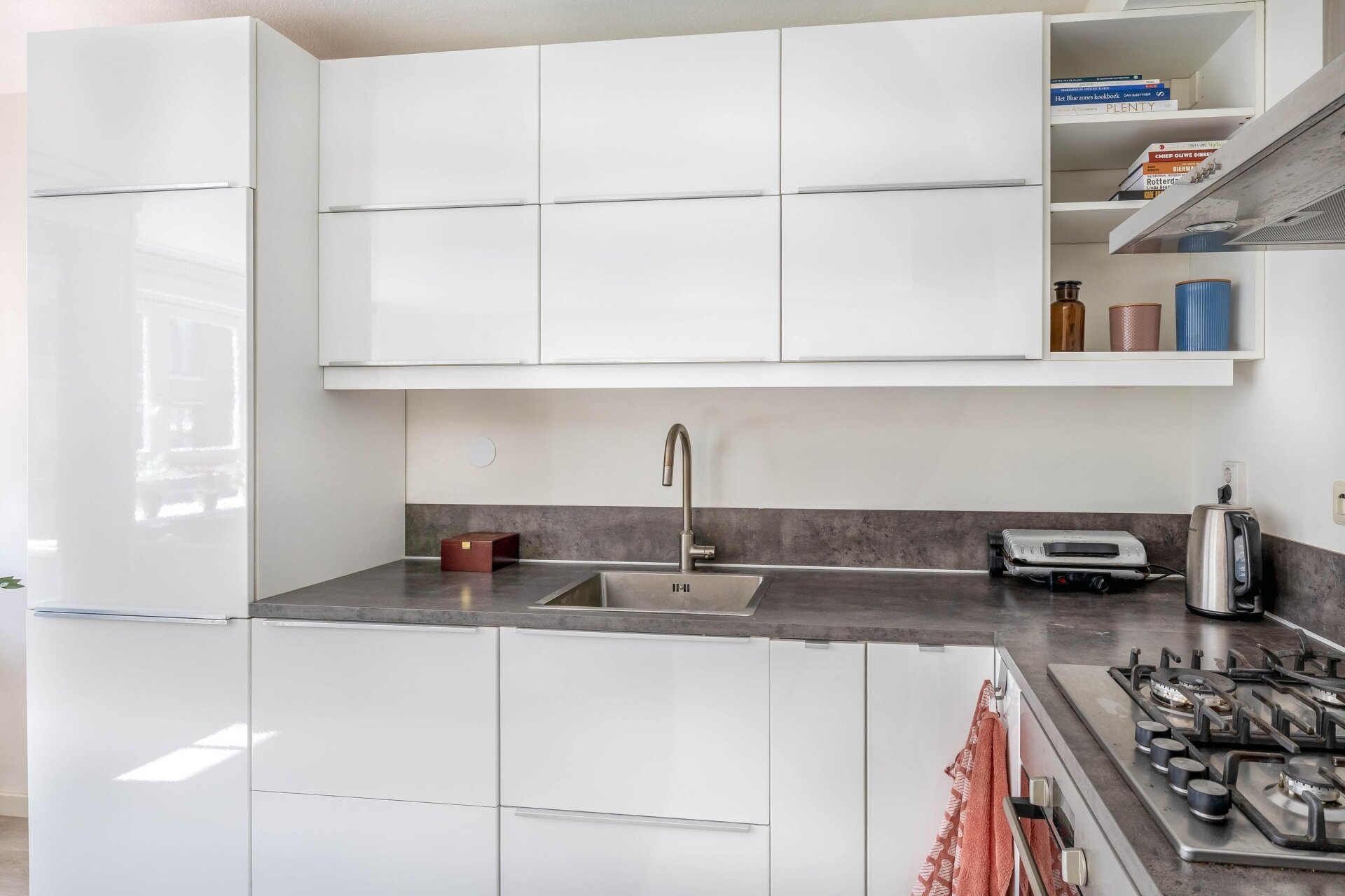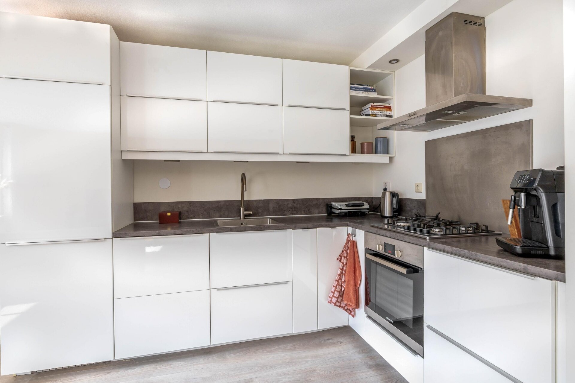 De keuken in hoekopstelling is strak afgewerkt met hoogglans witte fronten en een stoer betonlook aanrechtblad. Inbouwspots zorgen voor extra sfeer. Natuurlijk is de keuken compleet uitgerust met een vaatwasser, oven, koel-vriescombinatie, rvs afzuigkap en een 4-pitsgaskookplaat.