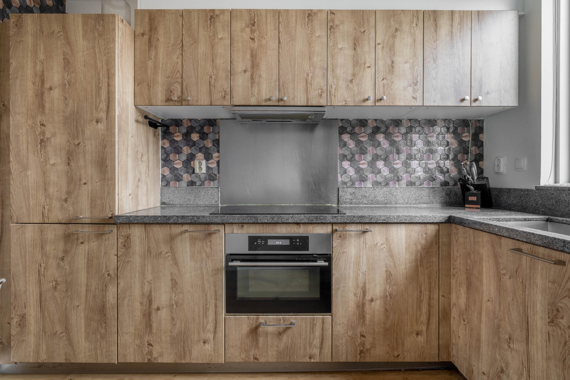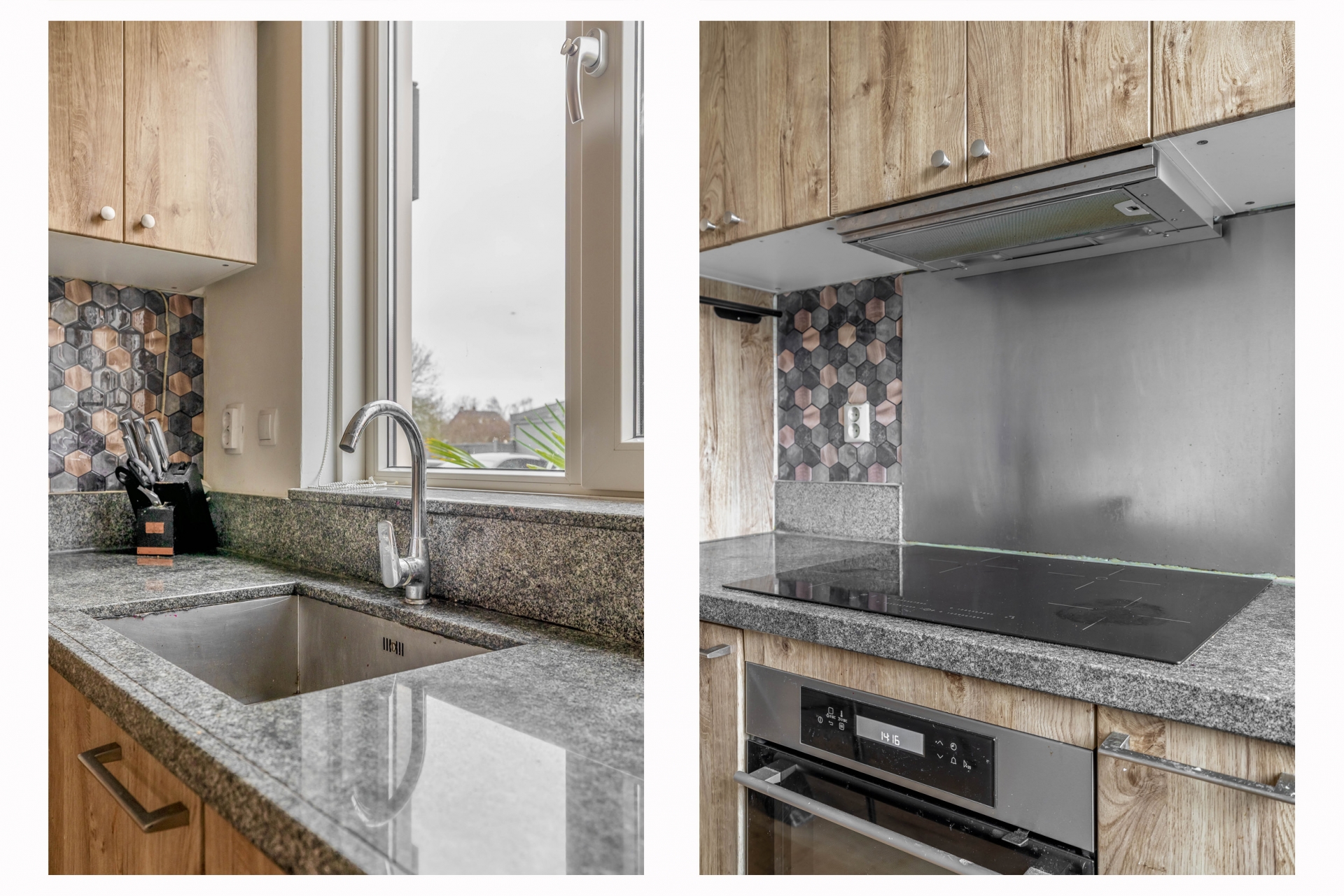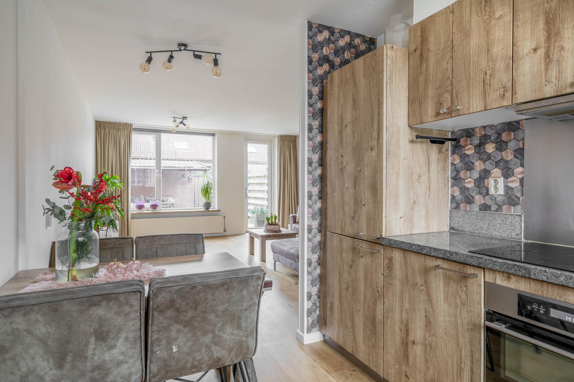 De begane grond is een heerlijke leefruimte waar alles samenkomt. De woonkamer is tuingericht en dankzij de grote ramen en deur naar buiten komt het daglicht hier volop binnen. De warme houten vloer (geschuurd en afgewerkt met skyltlak) geeft direct sfeer. Aan de voorzijde vind je de open keuken, uitgevoerd in warme houttinten en voorzien van een moderne uitstraling door de gewrapte fronten. De keuken is uitgerust met een nieuwe vaatwasser, combi-oven, inductiekookplaat en voldoende opbergruimte. Een leuke extra: de eethoek staat in verbinding met zowel de keuken als de woonkamer, wat zorgt voor een open en gezellige indeling.