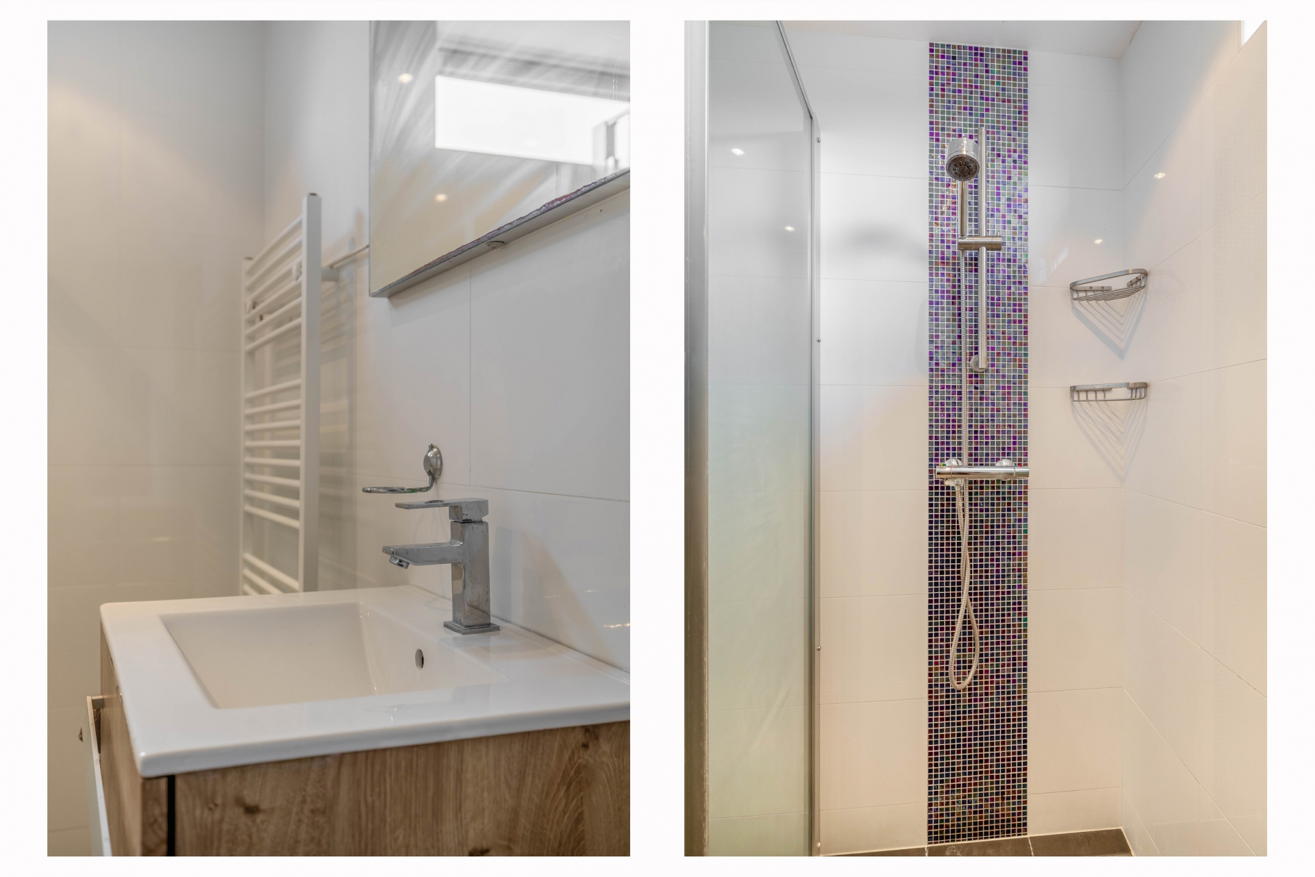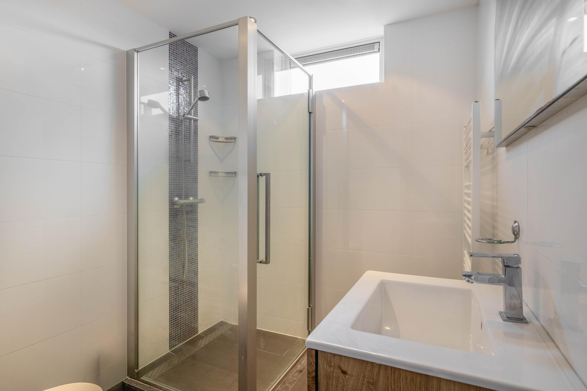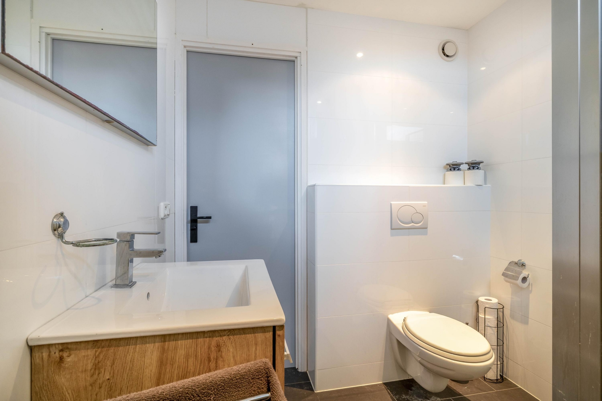 De badkamer is praktisch ingericht met een douche, wastafel en toilet. Daarnaast is er op de begane grond een separaat toilet.