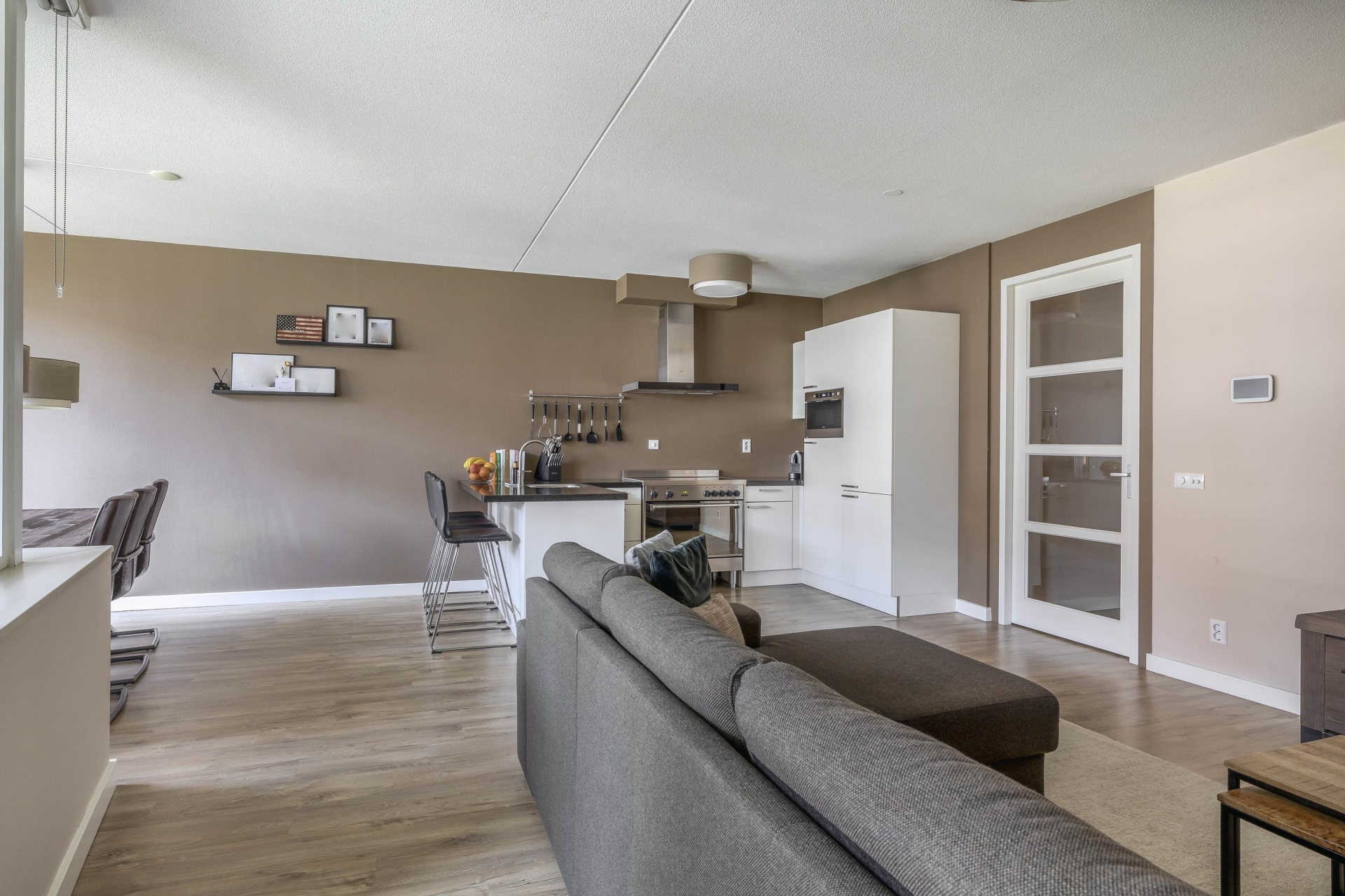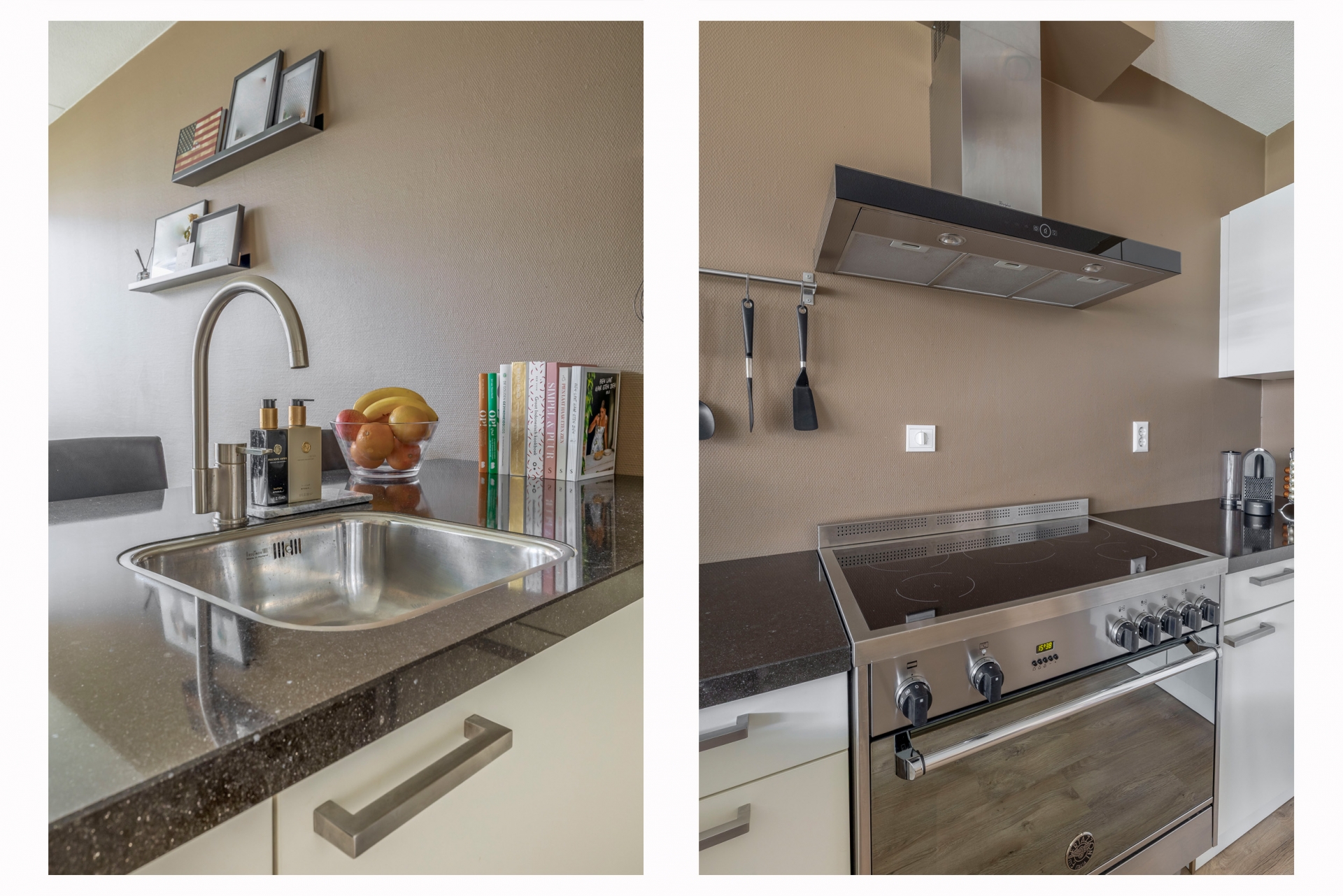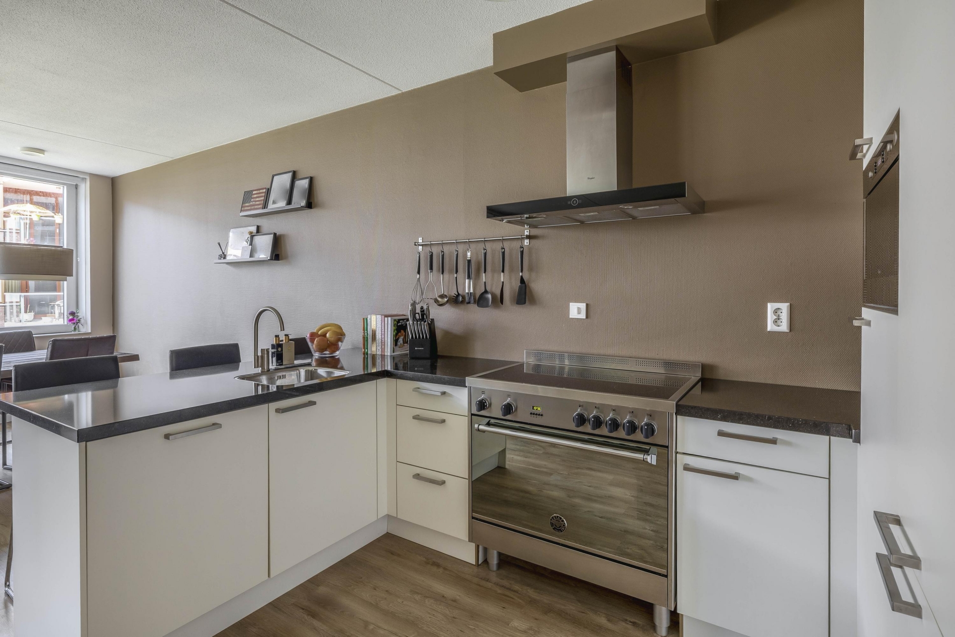 APPARTEMENT: Je komt het appartement binnen in een nette, ruime hal die toegang geeft tot alle ruimtes in huis. De lichte en ruime woonkamer vormt het hart van het appartement. Dankzij de open keuken blijf je altijd in contact met de rest van het gezin of jouw gasten. De moderne keuken is uitgevoerd in een neutrale kleurstelling en compleet ingericht met onder andere een strak elektrisch inductie fornuis met zeer ruime oven van het merk Bertazzoni. De keuken is verder voorzien van een afzuigkap, magnetron, vaatwasser en ruime spoelbak. Het composieten aanrechtblad loopt bewust verder door dan de onderliggende kasten zodat er gezellig aan de bar gegeten kan worden. De keuken bevat alles wat je nodig hebt voor dagelijks gemak én sfeervol koken. De huidige bewoners hebben het appartement verduurzaamd en zijn afgestapt van koken op gas. Dit is gerealiseerd door een 3-Fasen aansluiting in de meterkast. De badkamer is modern en ruim; voorzien van een inloopdouche en dubbel wastafelmeubel. Het aparte toilet met fonteintje is praktisch geplaatst in de hal.