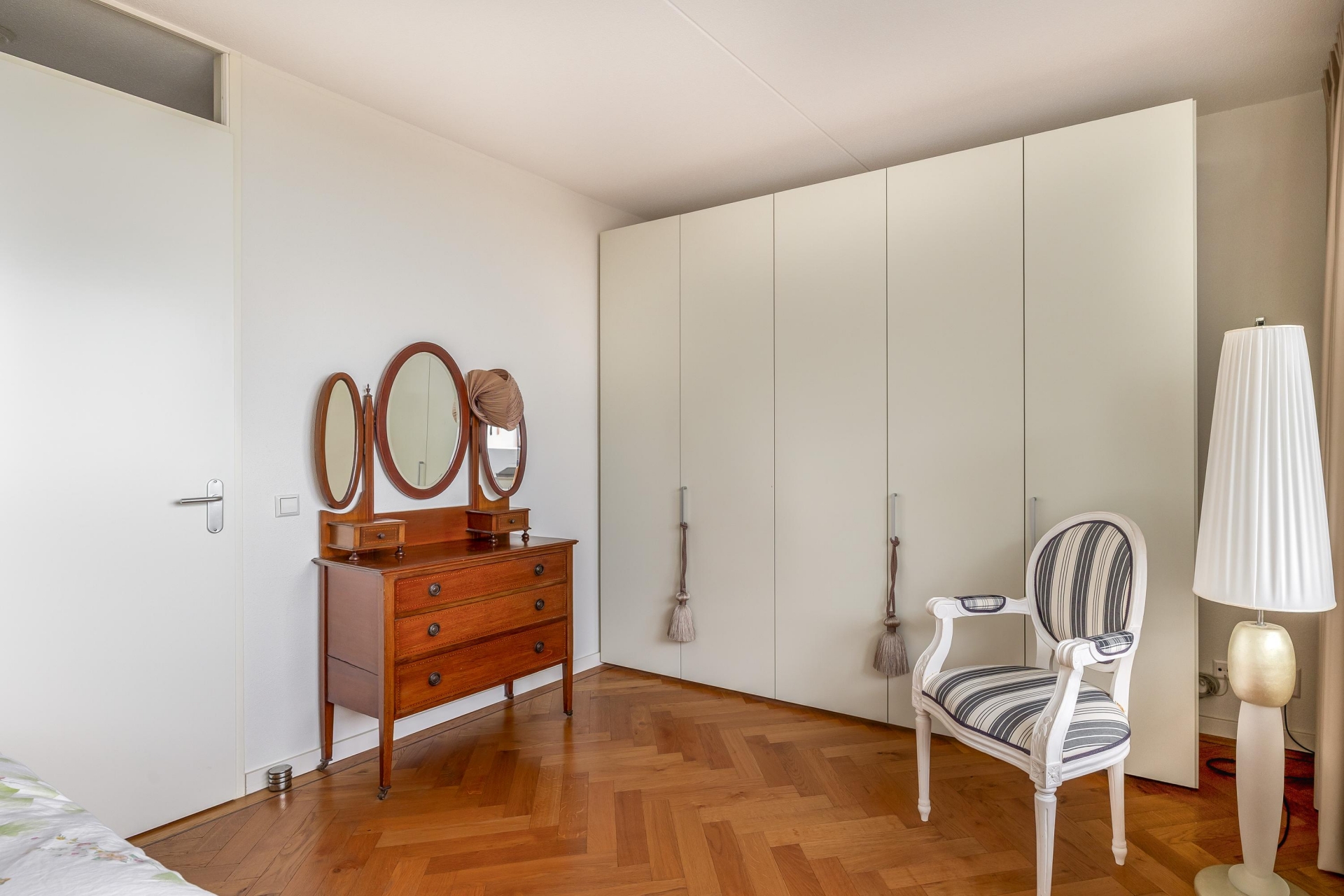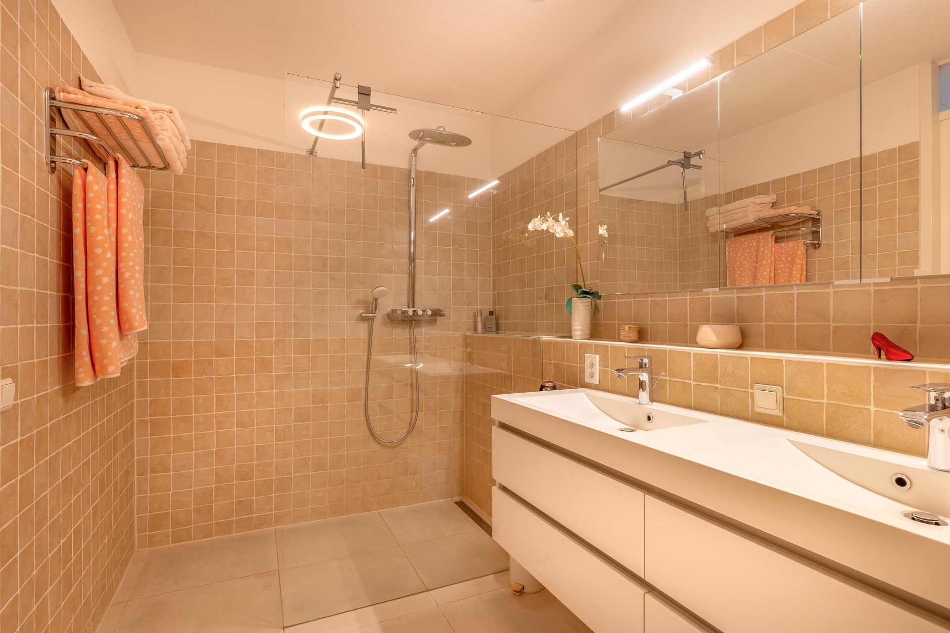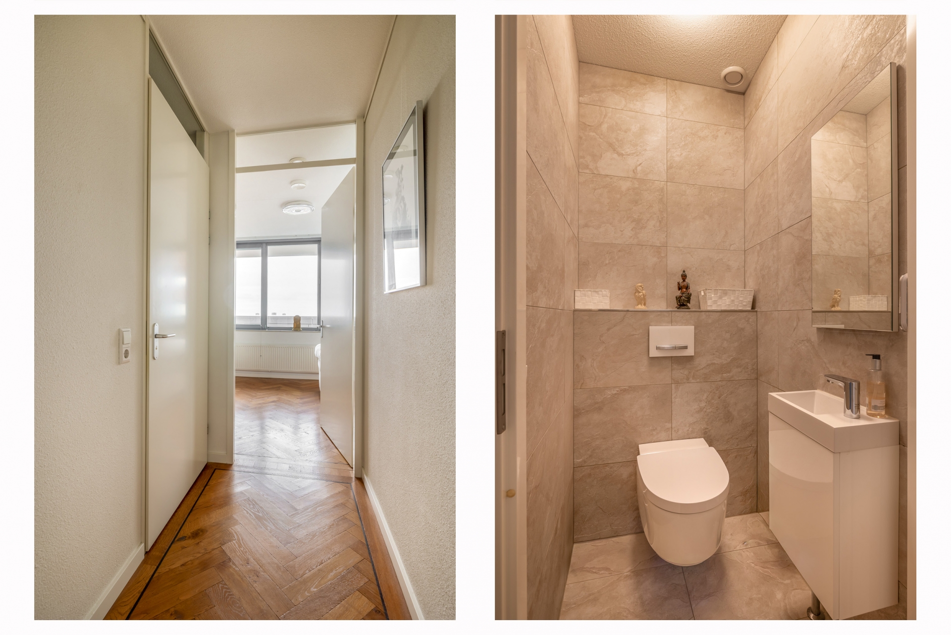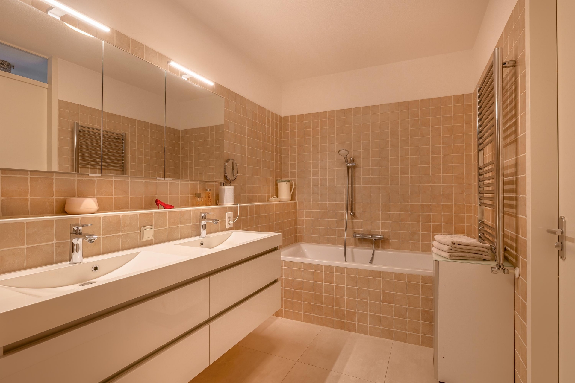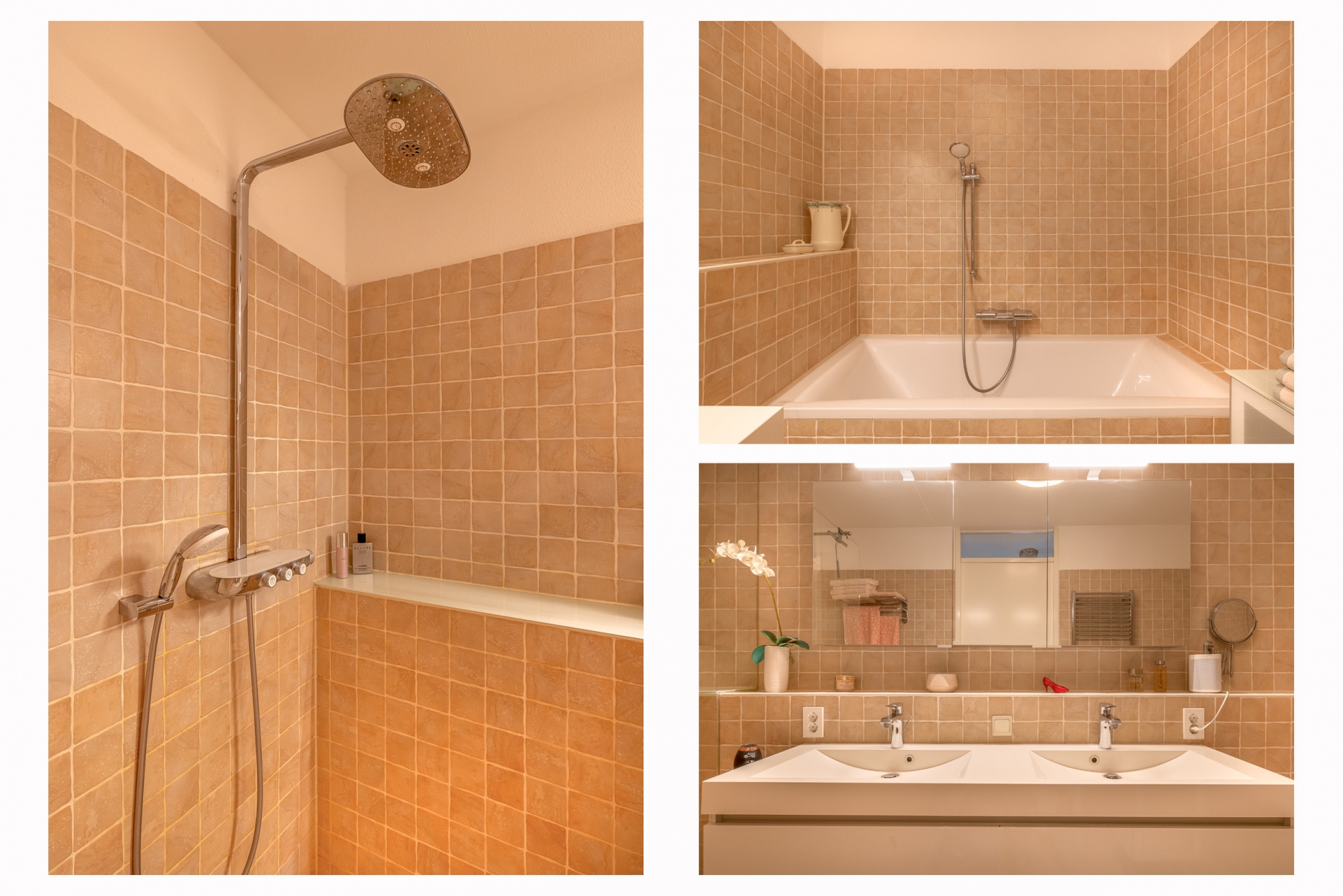 Vanuit een tussenportaal is nog de 3e slaapkamer, de badkamer en separaat het toilet toegankelijk. De badkamer is volledig betegeld en voorzien van een ligbad, royale inloopdouche en een dubbele wastafel met meubel. Het gehele appartement, m.u.v. de natte ruimtes, is voorzien van een fraaie visgraat parketvloer.