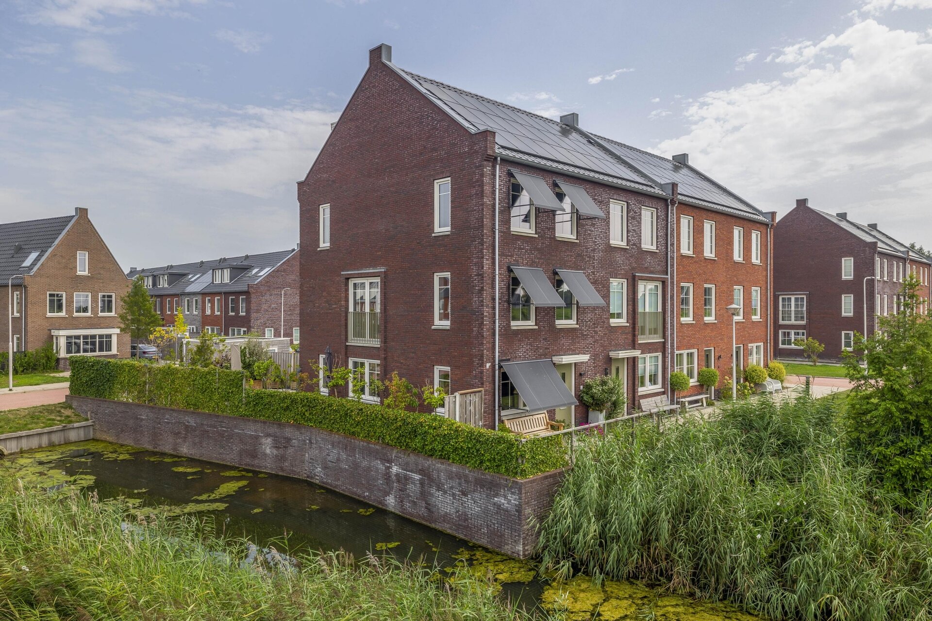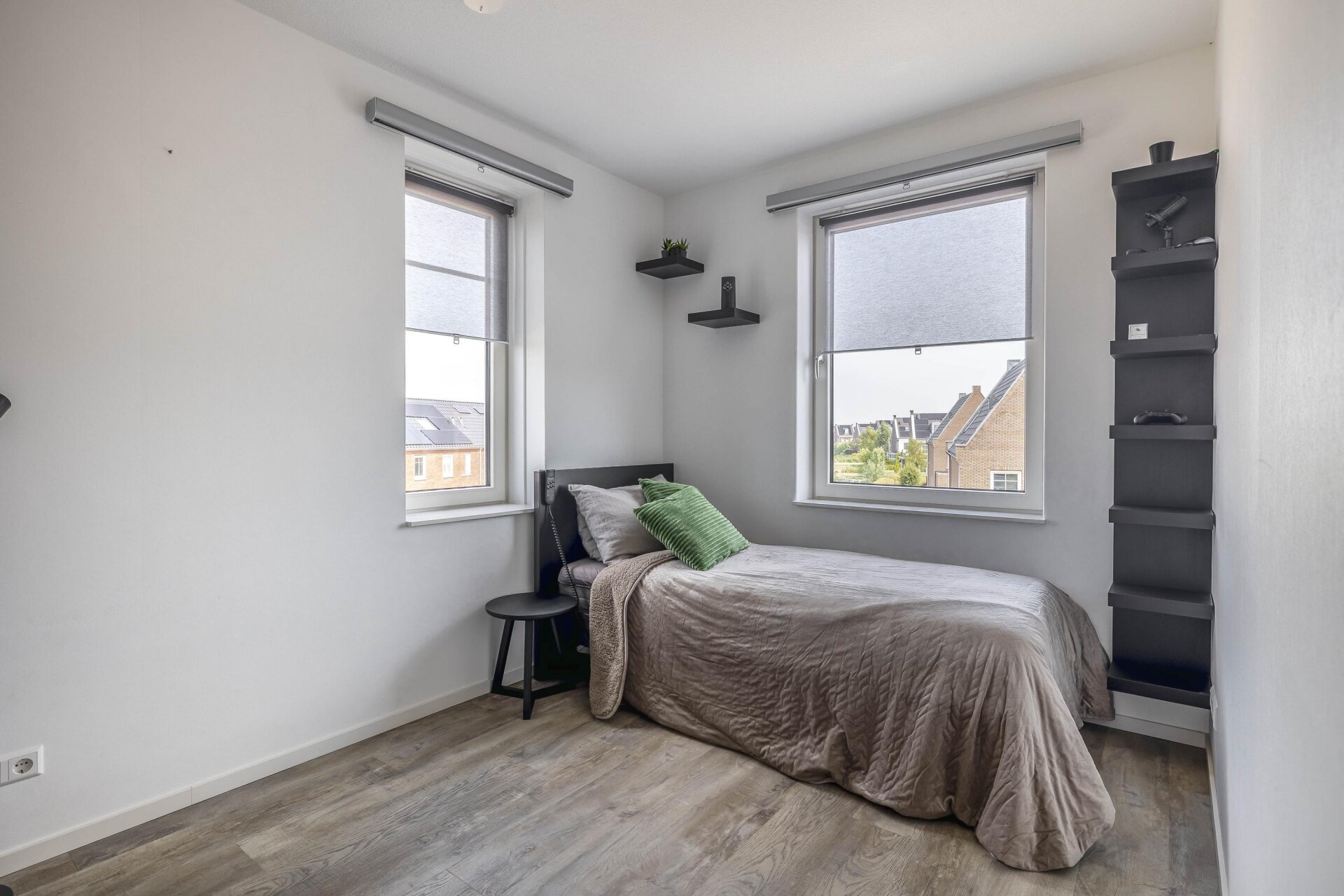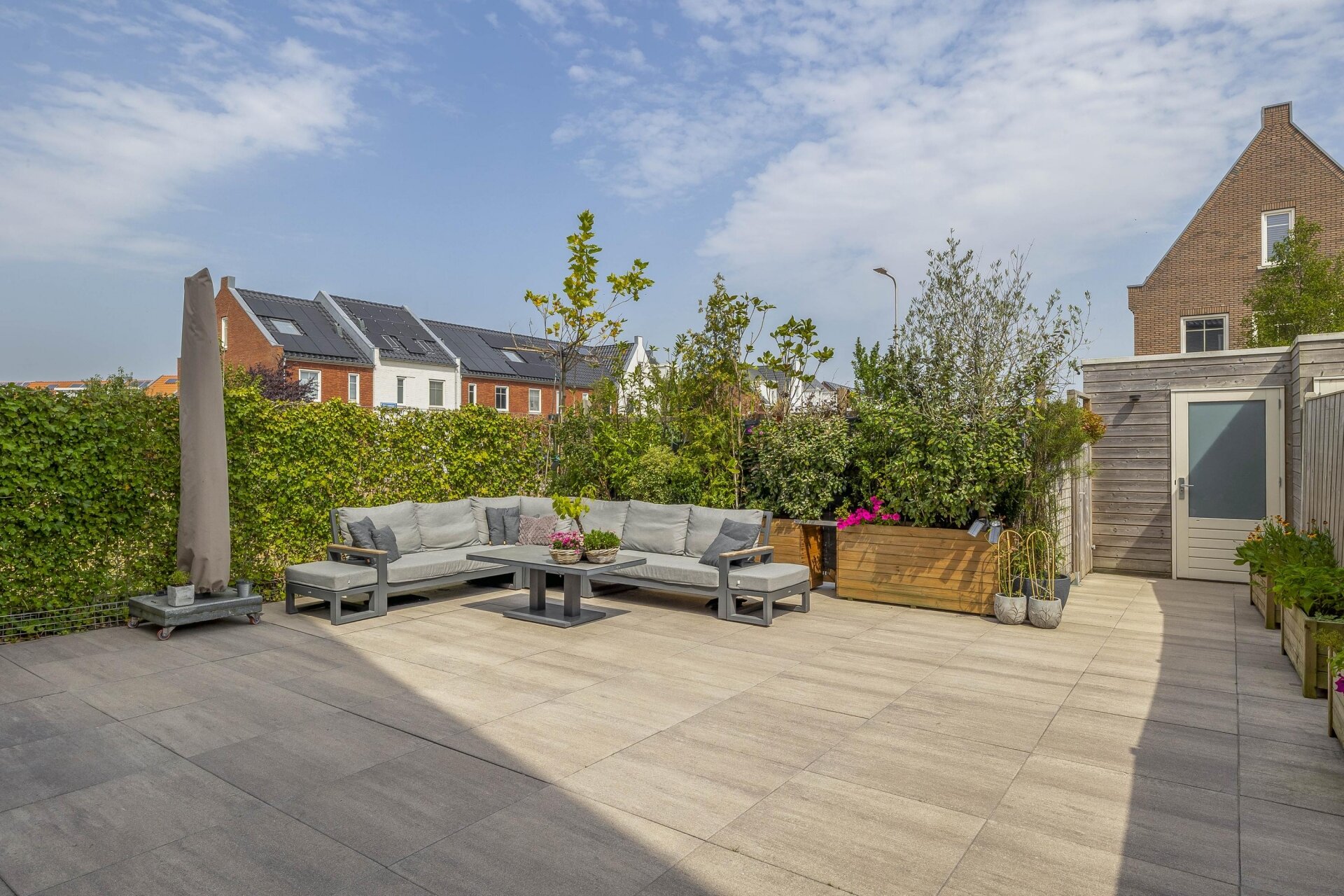 - Zonwering d.m.v. solar uitvalschermen aan voorzijde woning en zonnescherm achterzijde woning;
