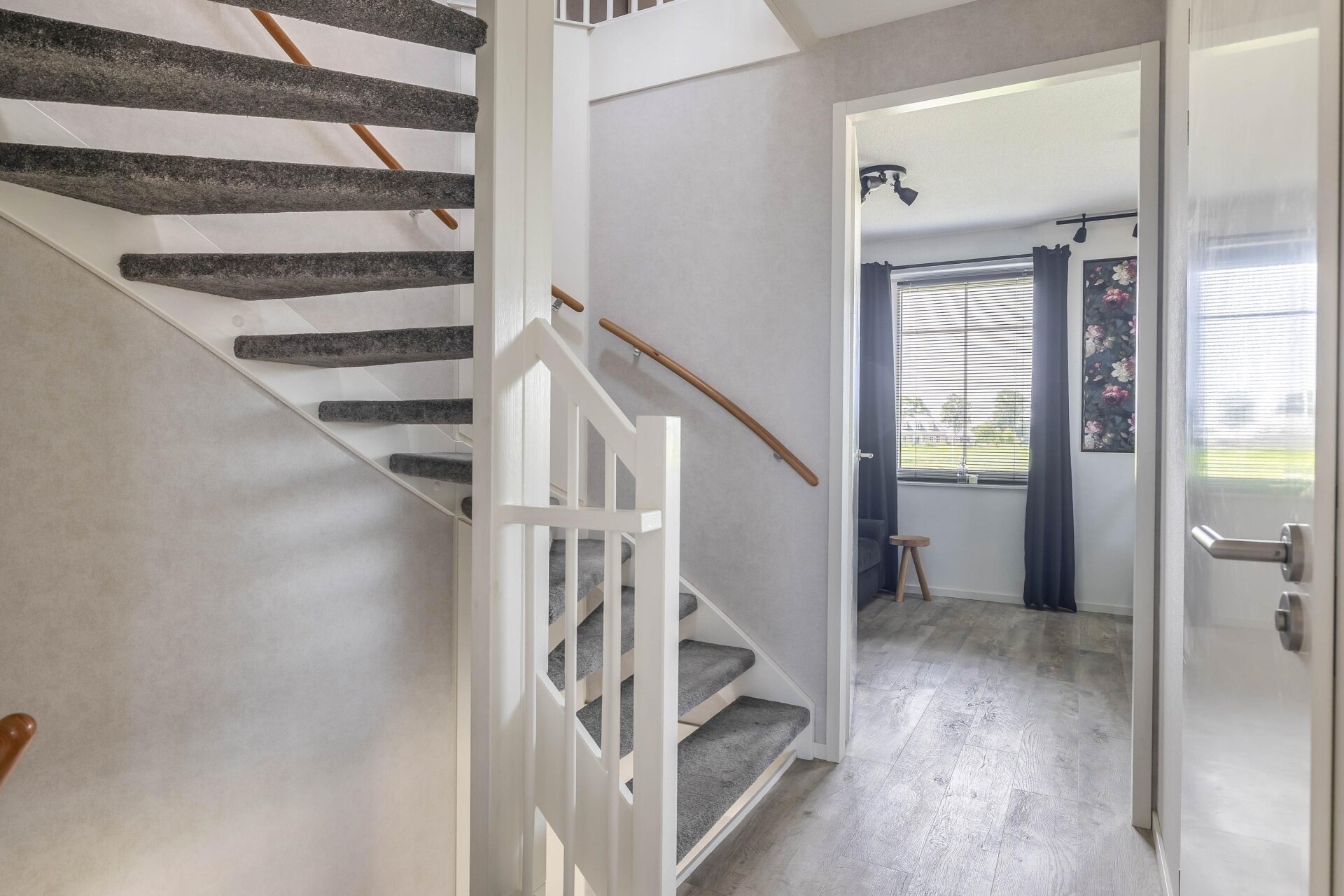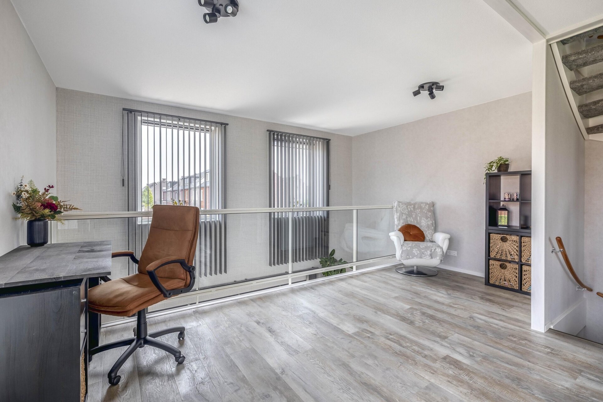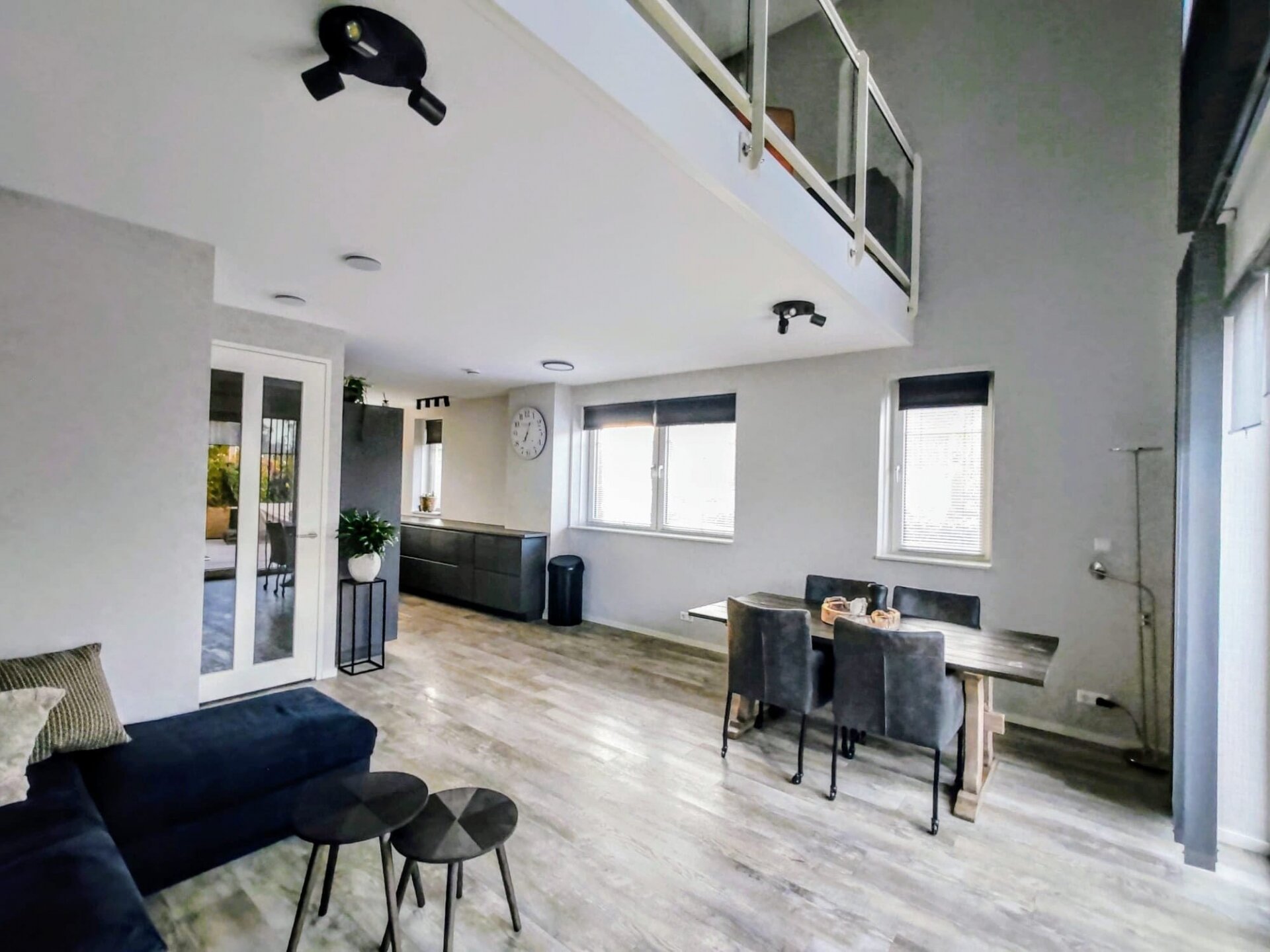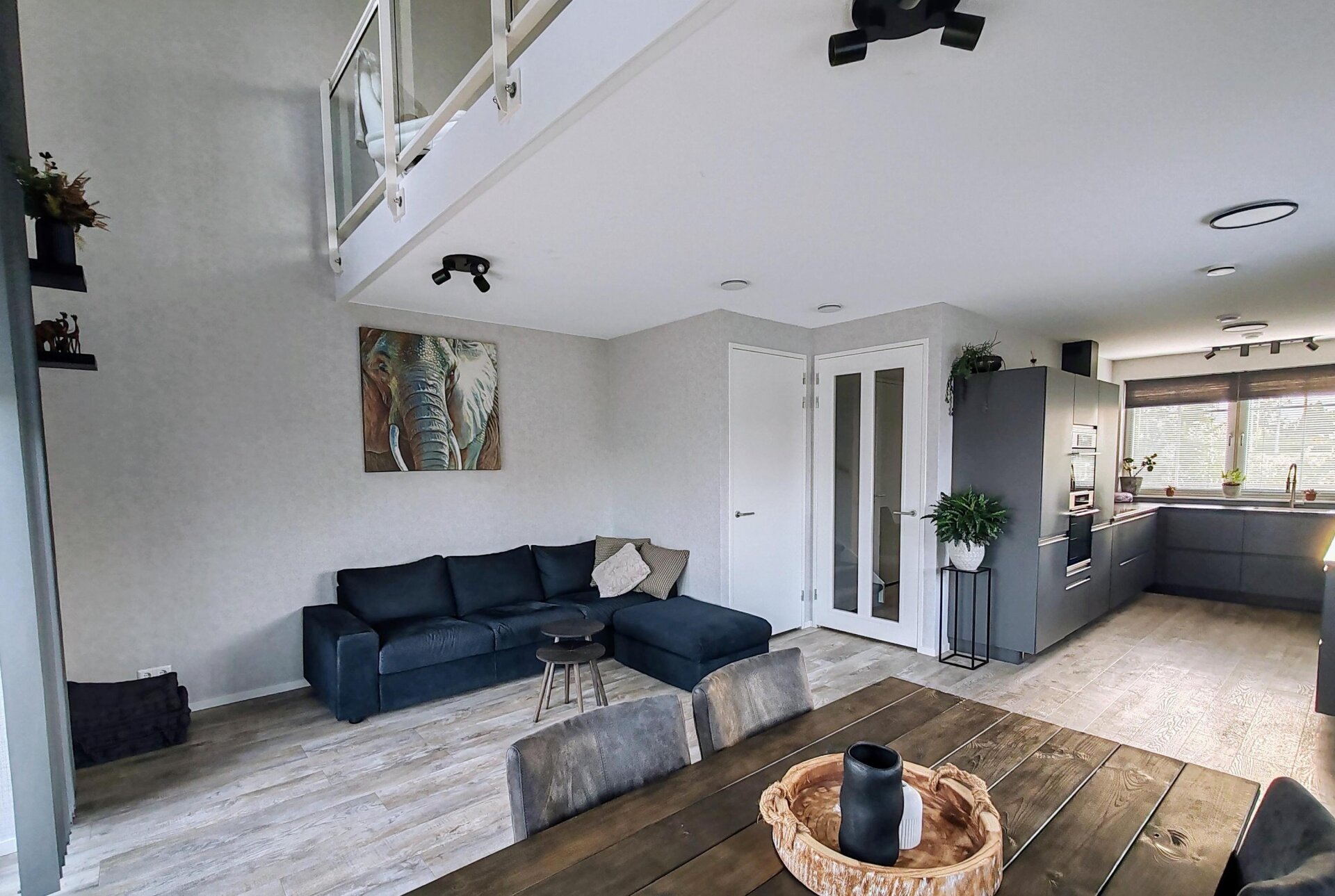 Vanuit de woonkamer is er een directe verbinding met de ruime en lichte woonkamer op de eerste verdieping door de woningbrede vide, die zorgt voor extra lichtinval en een ruimtelijk gevoel.