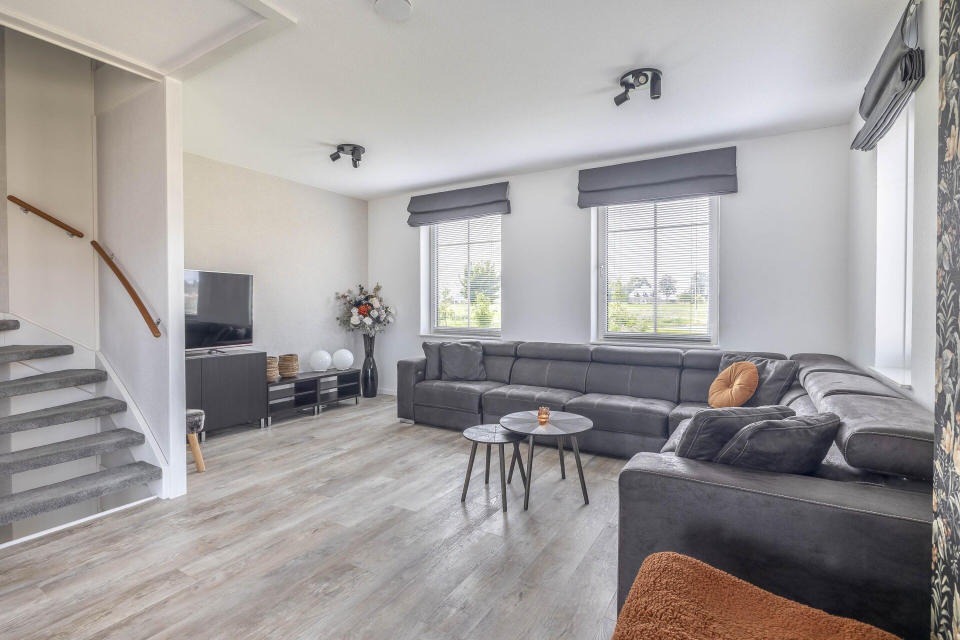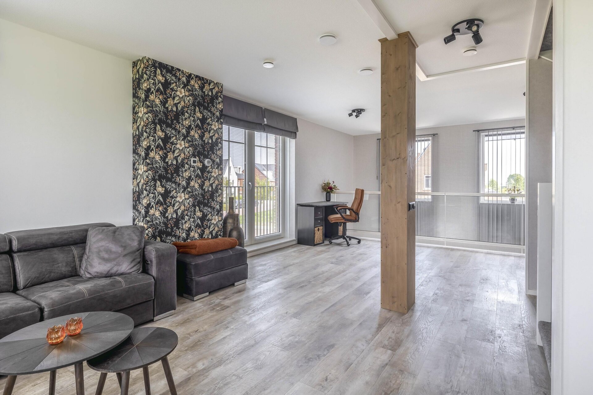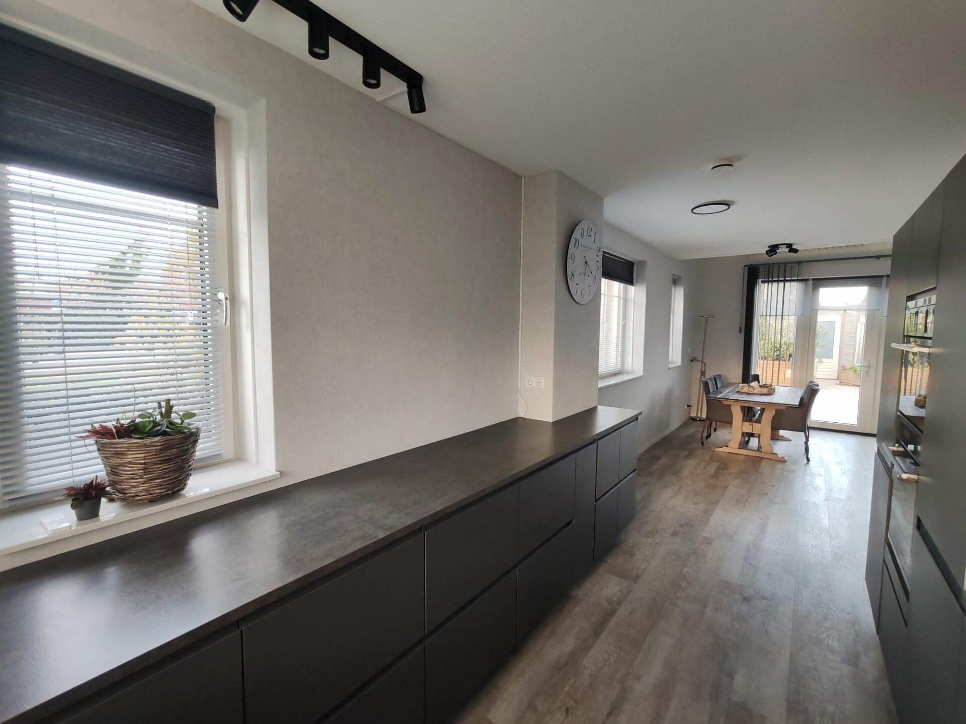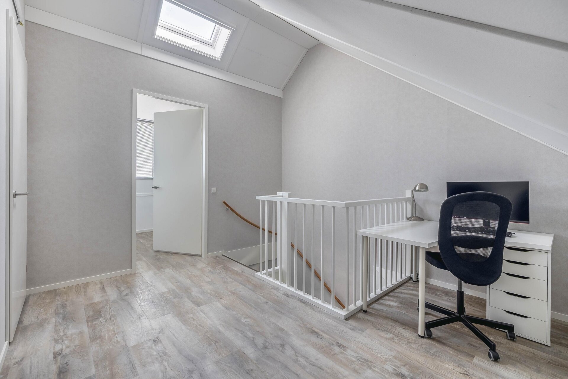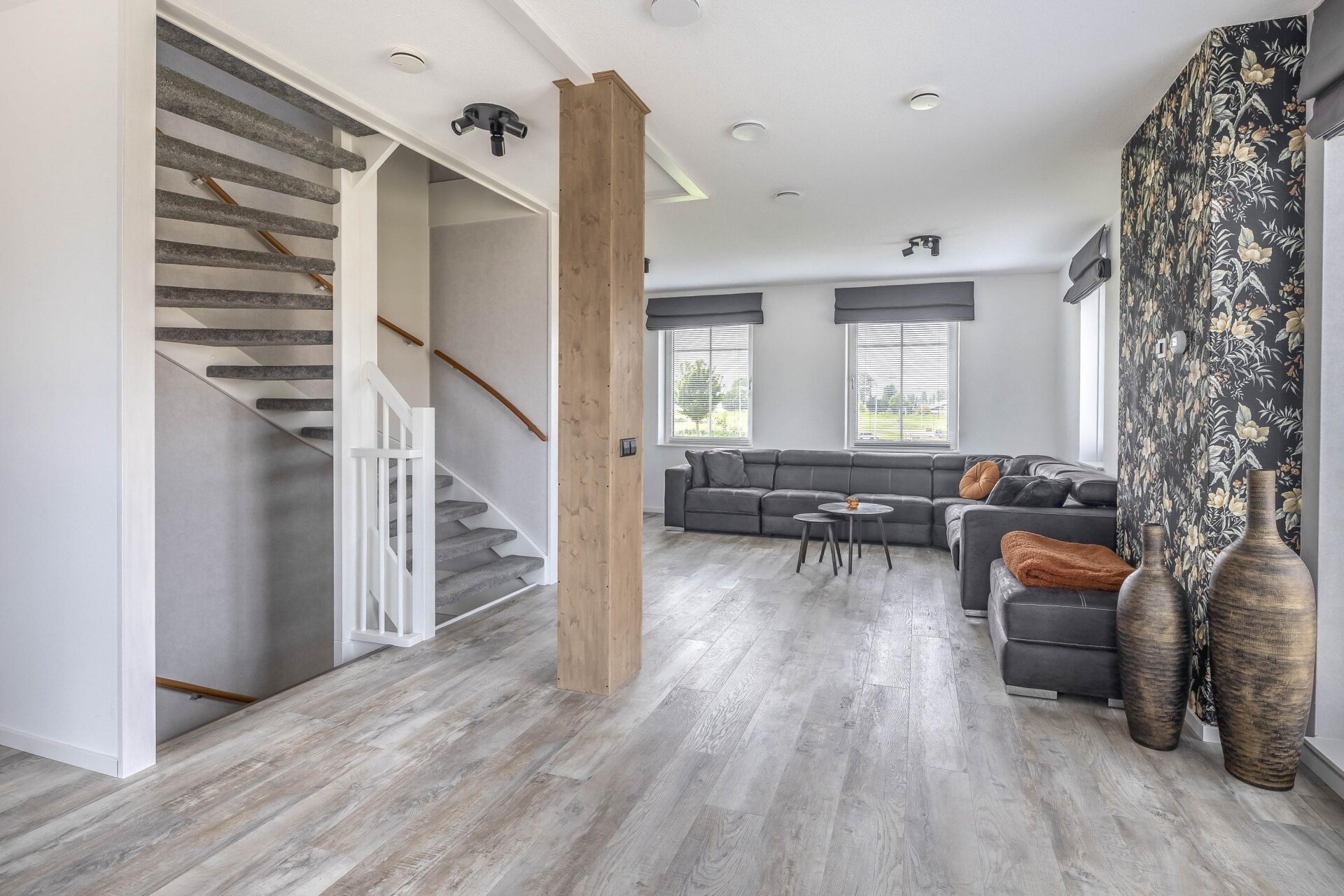 Vanuit de woonkamer is er een directe verbinding met de ruime en lichte woonkamer op de eerste verdieping door de woningbrede vide, die zorgt voor extra lichtinval en een ruimtelijk gevoel.