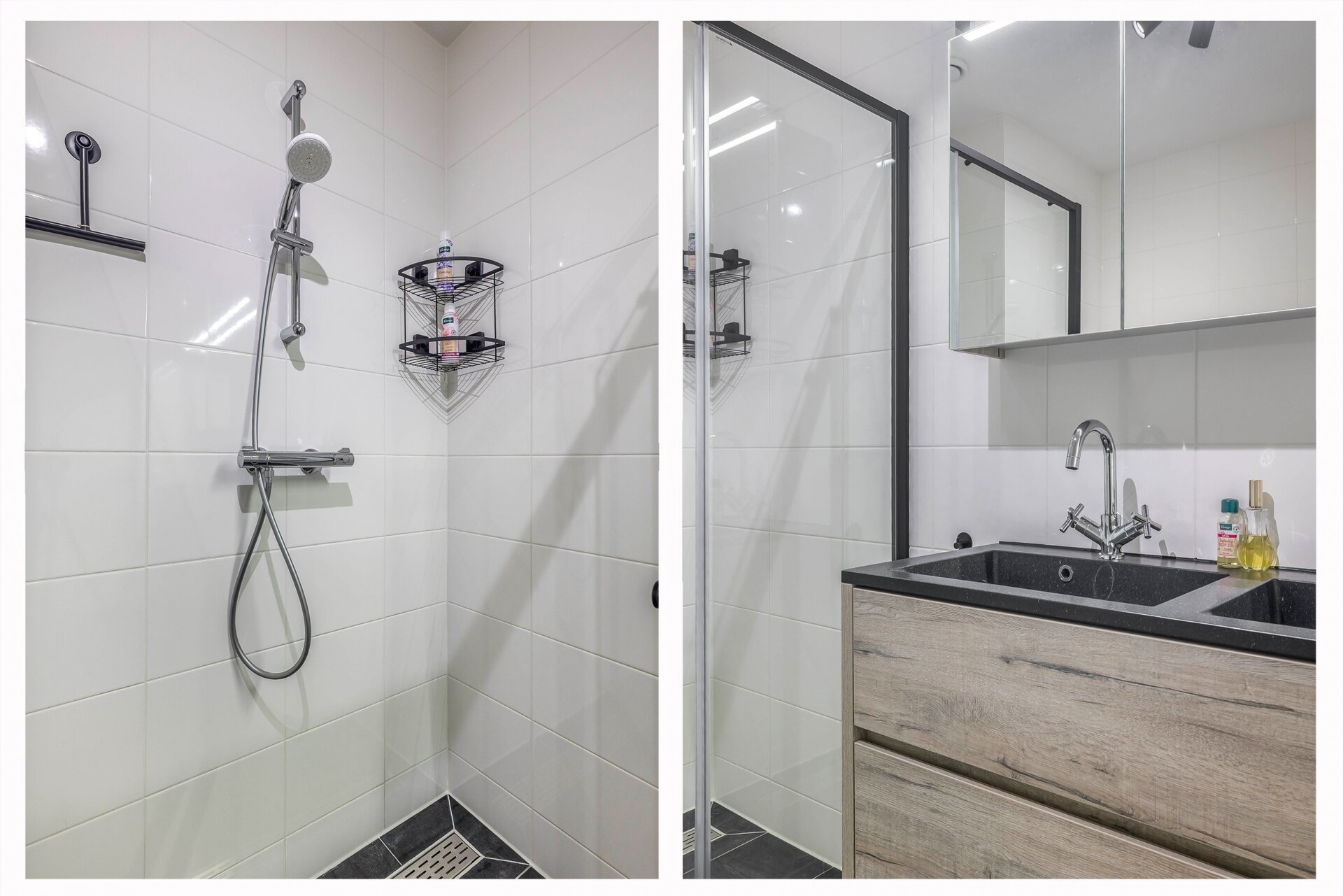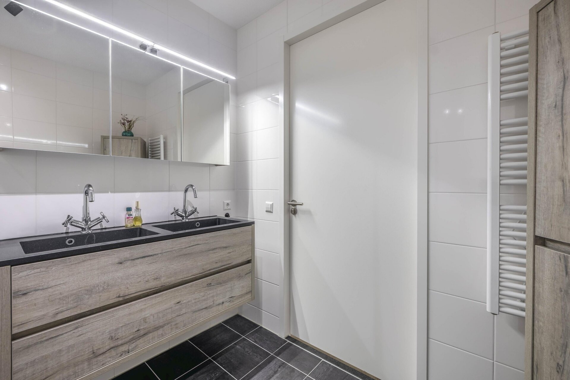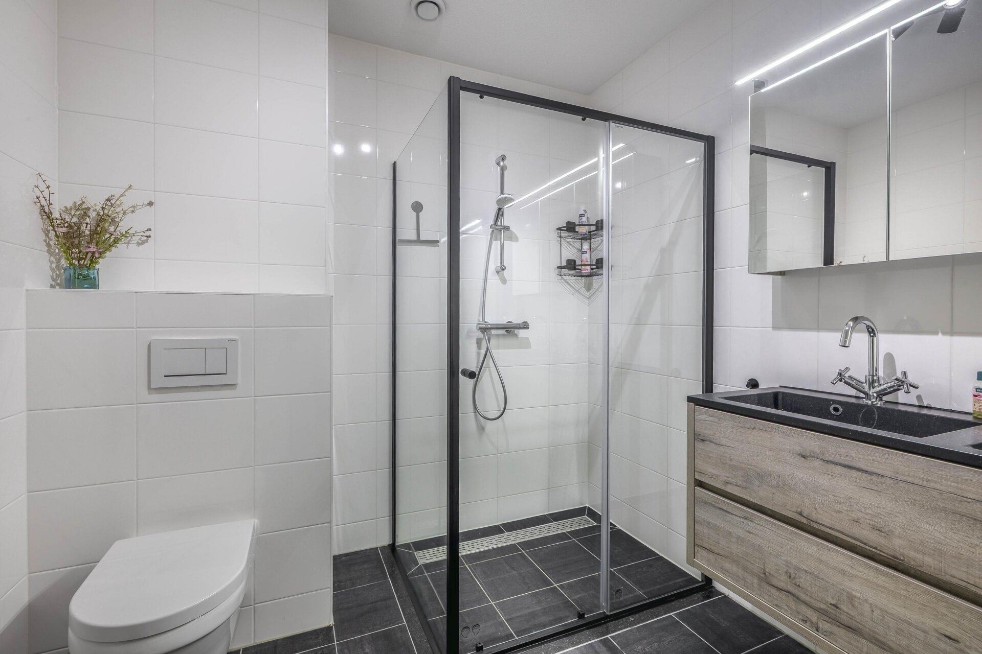 De badkamer is geheel betegeld en voorzien van een modern dubbel wastafelmeubel, een toilet en een comfortabele douche.
