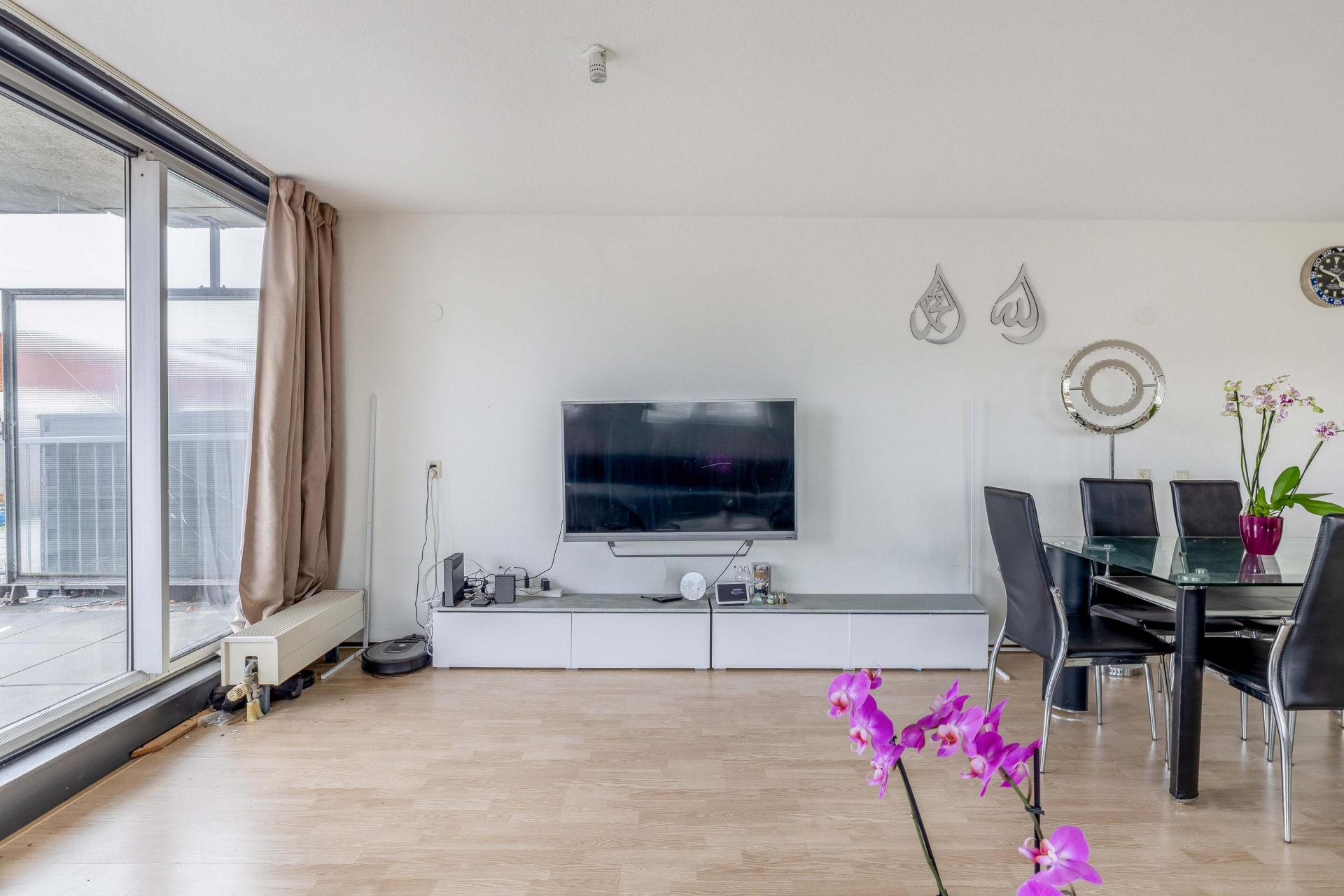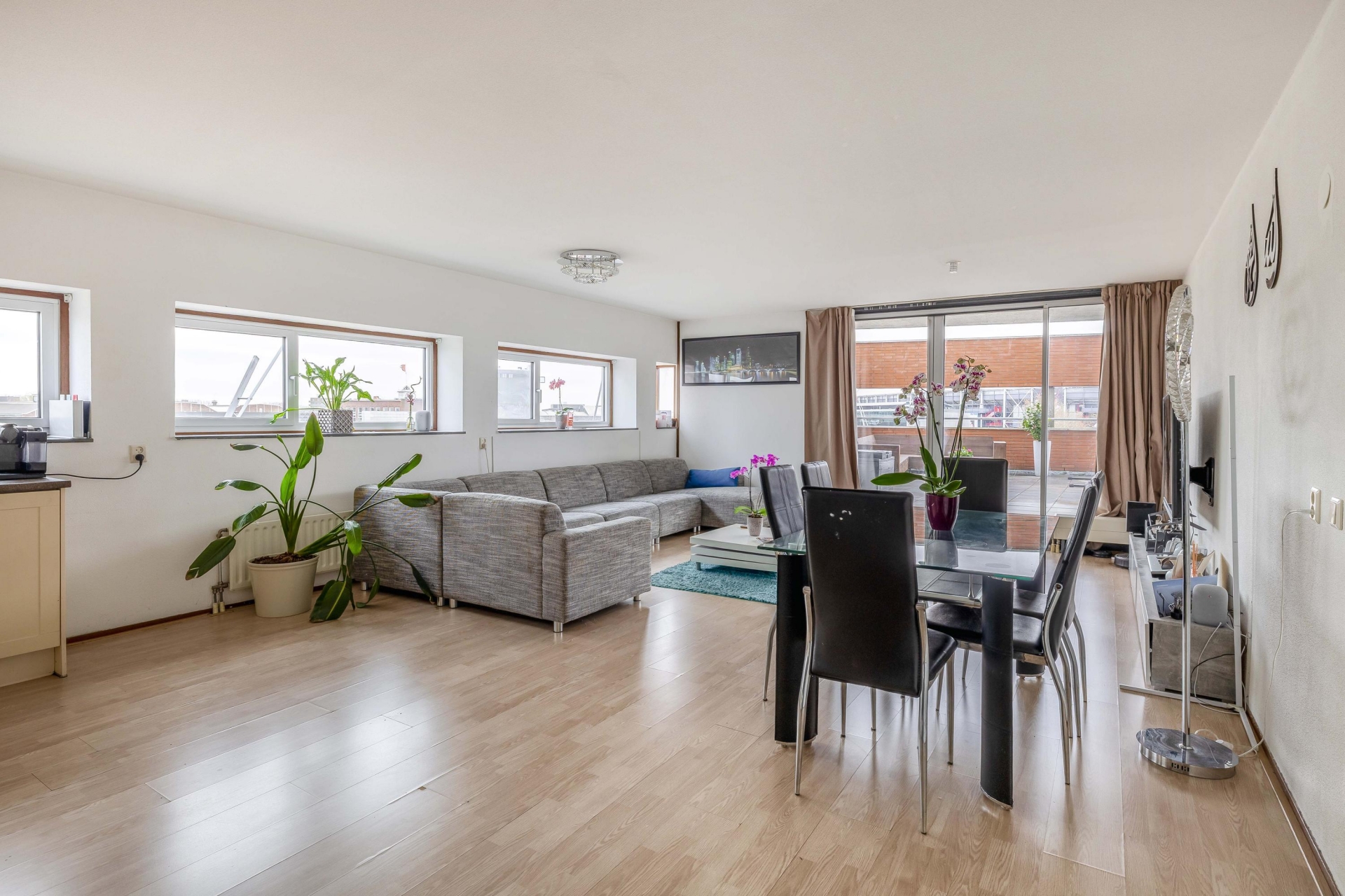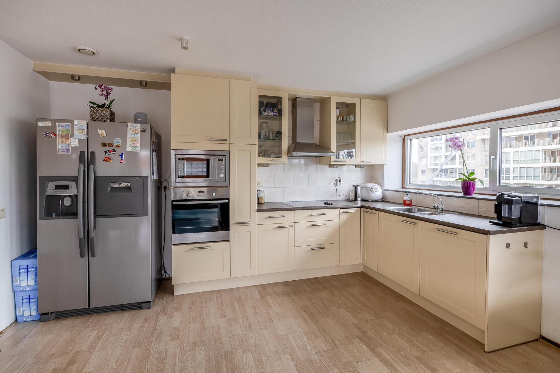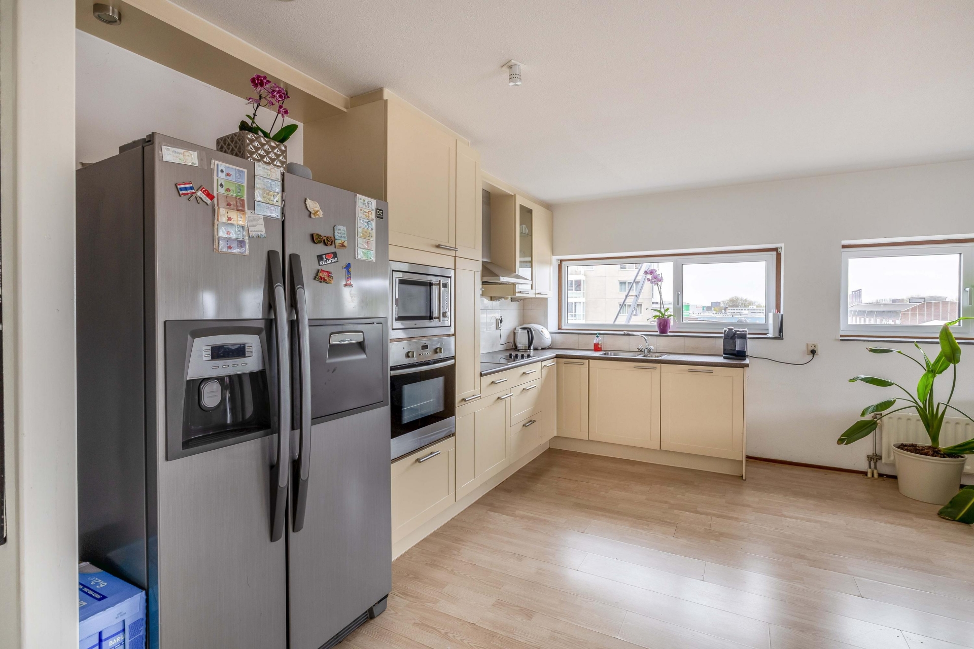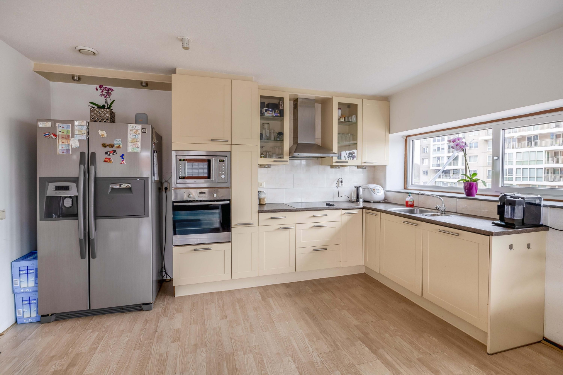 Zodra je de woonkamer binnenstapt valt het licht direct op. De grote raampartijen en de ligging op de vierde verdieping zorgen voor een open en vrij gevoel. Hier richt je met gemak een comfortabele zithoek en een eethoek in, zonder concessies te doen aan ruimte. De woonkamer staat in directe verbinding met het terras, wat echt een verlengstuk van je leefruimte vormt. Het terras is ruim opgezet en ligt op het zuiden, waardoor je hier een groot deel van de dag van de zon kunt genieten. Er is voldoende plek voor een loungeset én een eettafel, wat het ideaal maakt voor zowel ontspannen momenten als gezellige avonden met vrienden. De beschutte ligging en het vrije uitzicht geven het geheel extra kwaliteit. De open keuken sluit naadloos aan op de woonkamer en heeft een praktische L-opstelling. Hier heb je alles bij de hand tijdens het koken, terwijl je toch contact houdt met de woonkamer. De opstelling is overzichtelijk en functioneel, precies wat je zoekt in een appartement als dit.