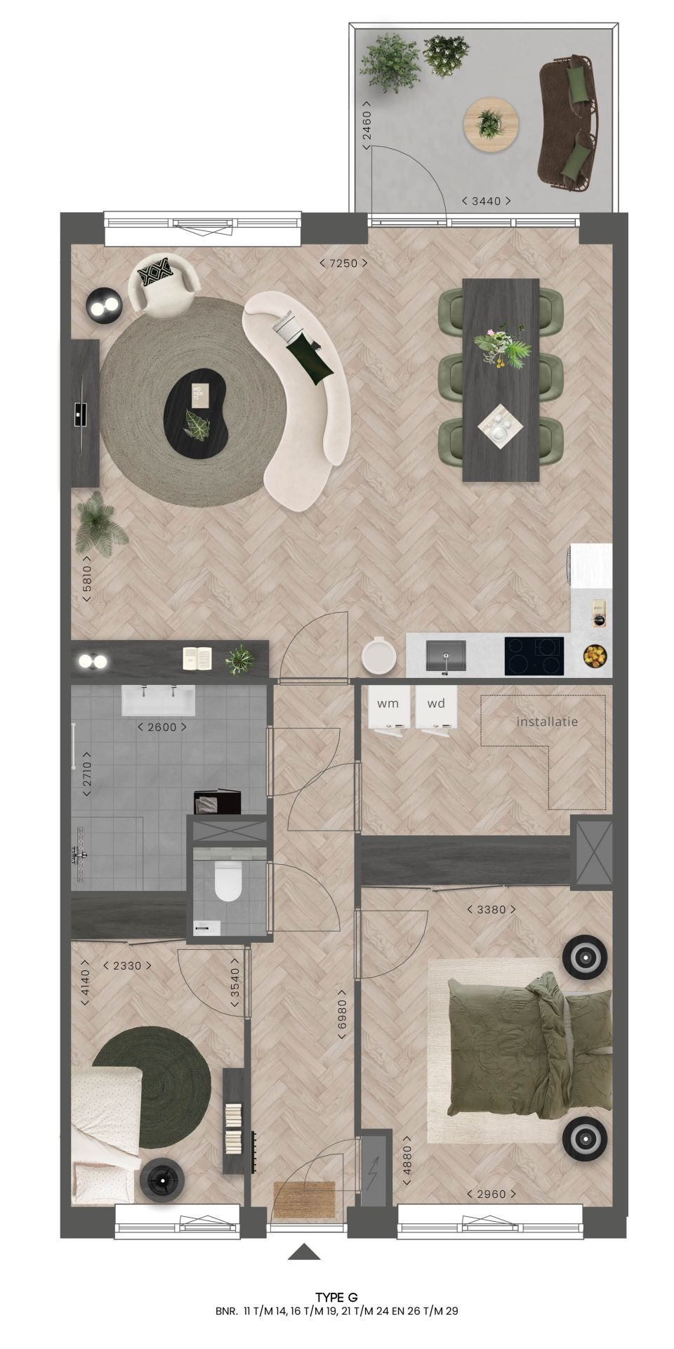 De indeling is doordacht en ideaal. Aan de entreezijde bevinden zich twee royale slaapkamers, terwijl aan het einde van de gang de royale woonkamer met open keuken ligt.
