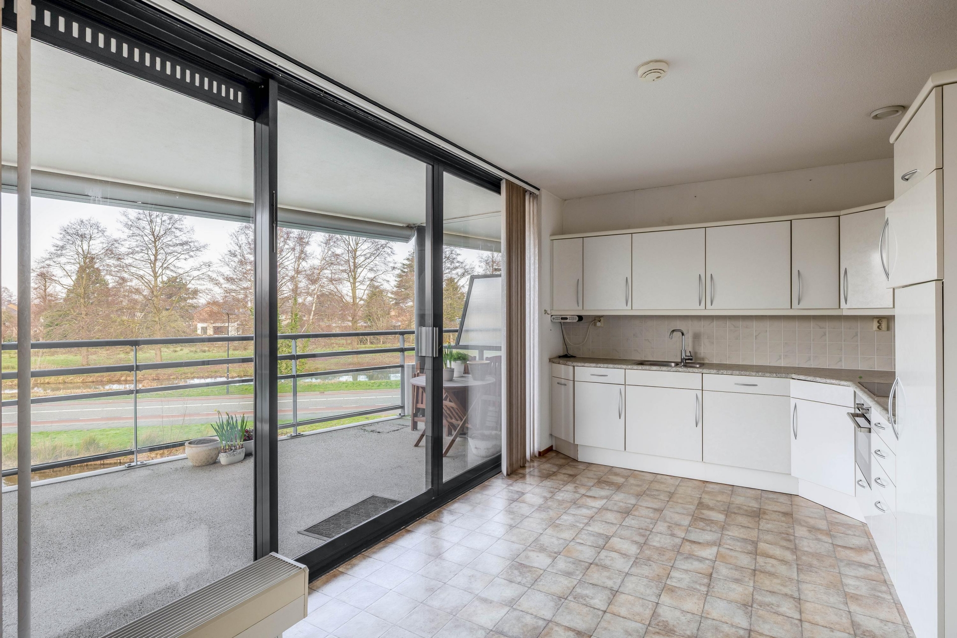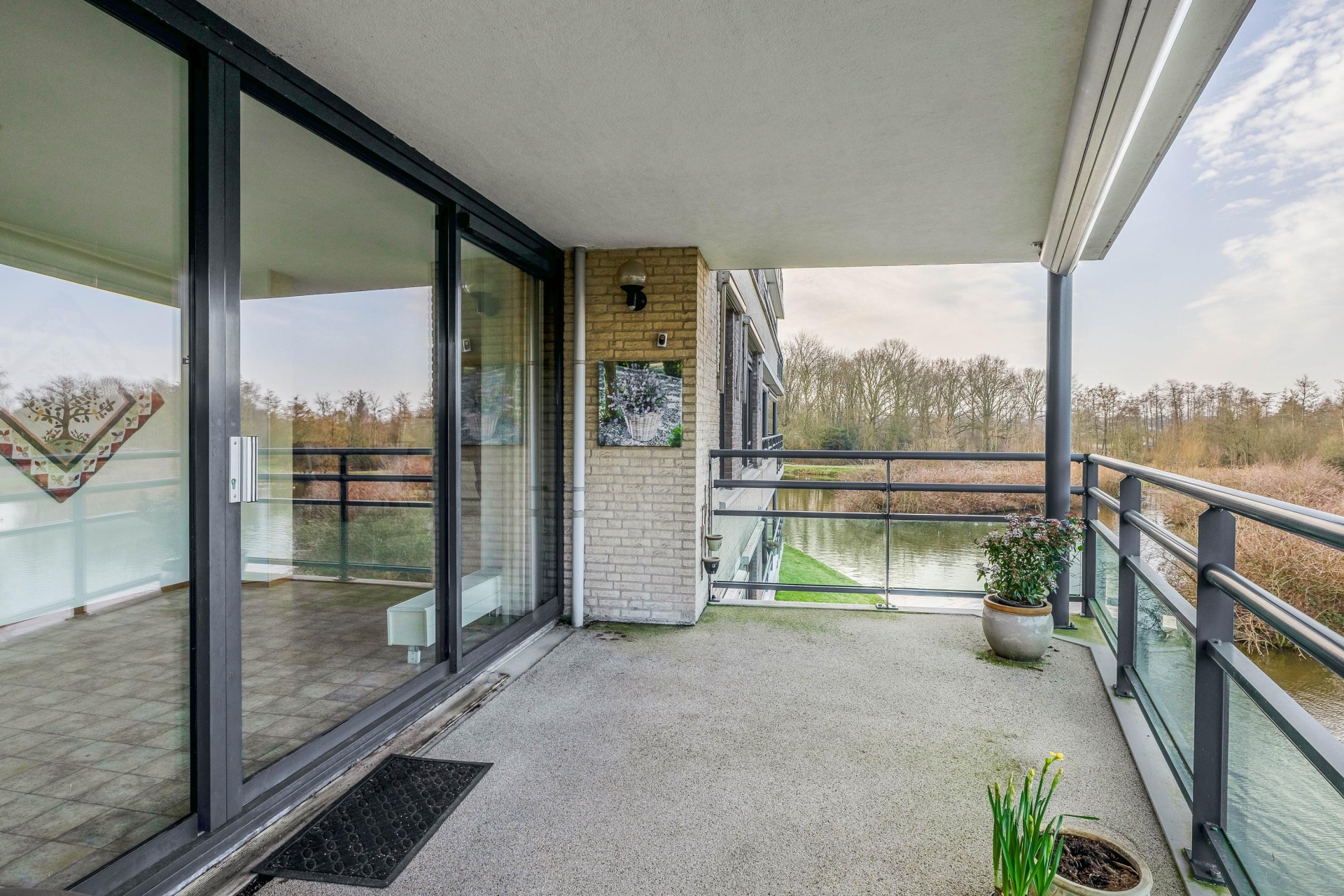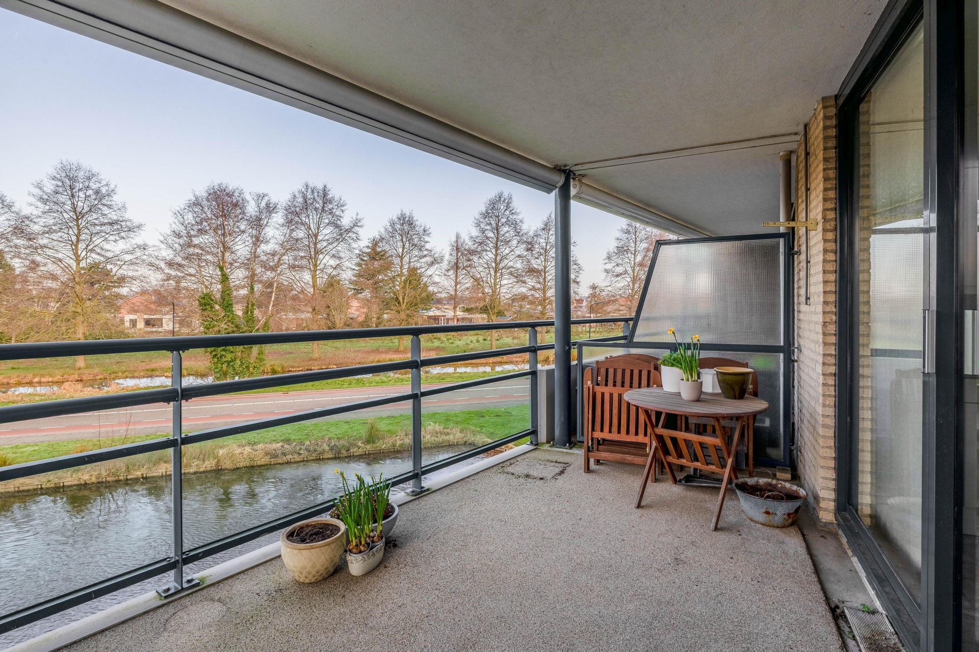Via de schuifpui stap je direct het royale balkon op. Dit balkon ligt op het noordwesten, waardoor je vanaf de middag tot in de avond van de zon geniet. Het vrije uitzicht over het water en de groene omgeving geeft een gevoel van rust en ruimte. Een heerlijke plek om buiten te zitten, met een kop koffie of een goed glas wijn.