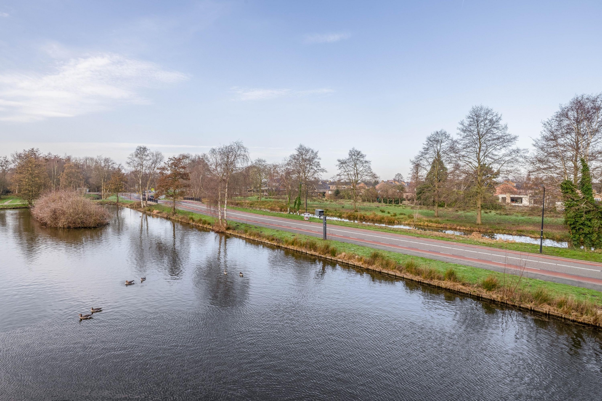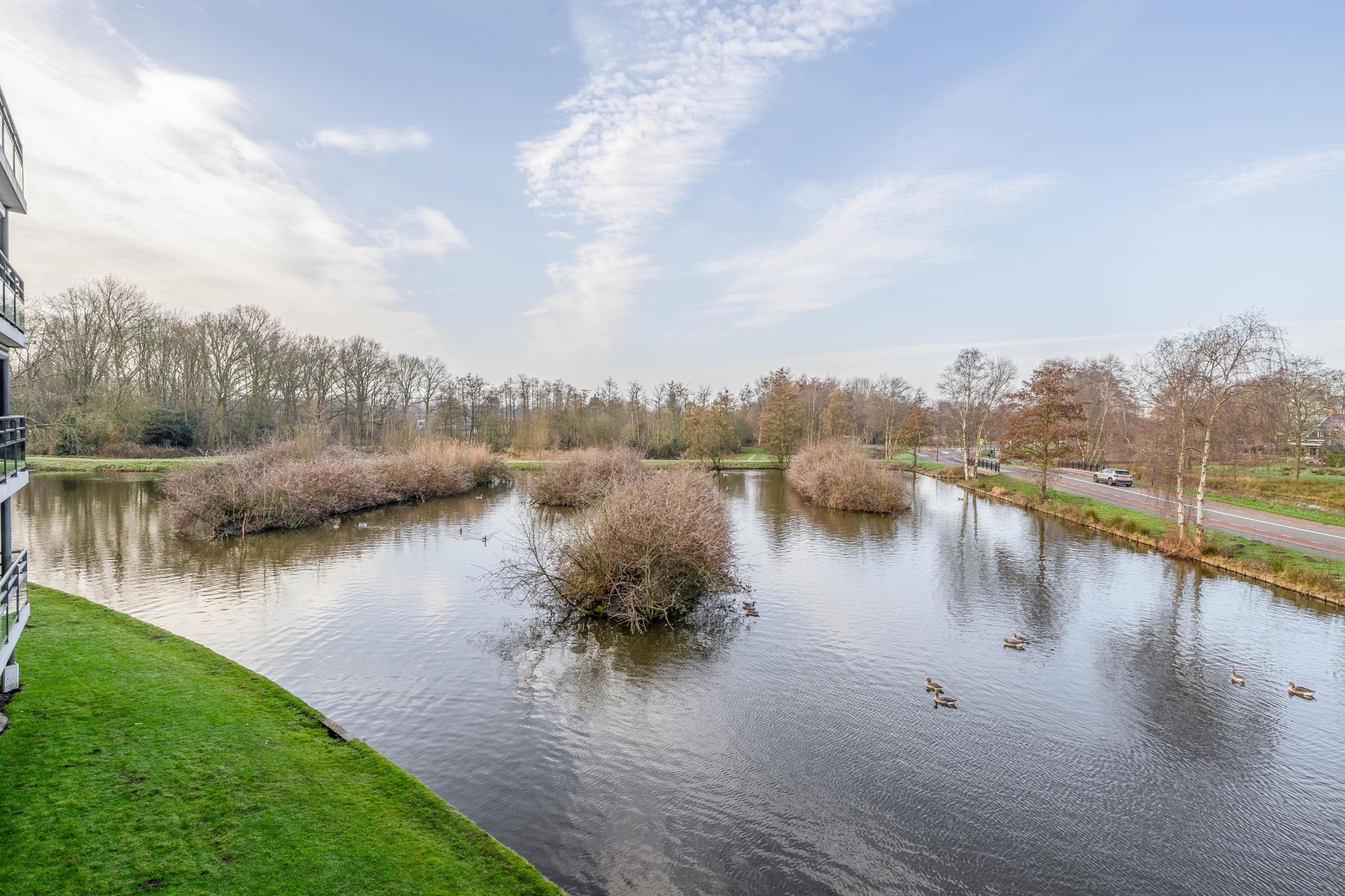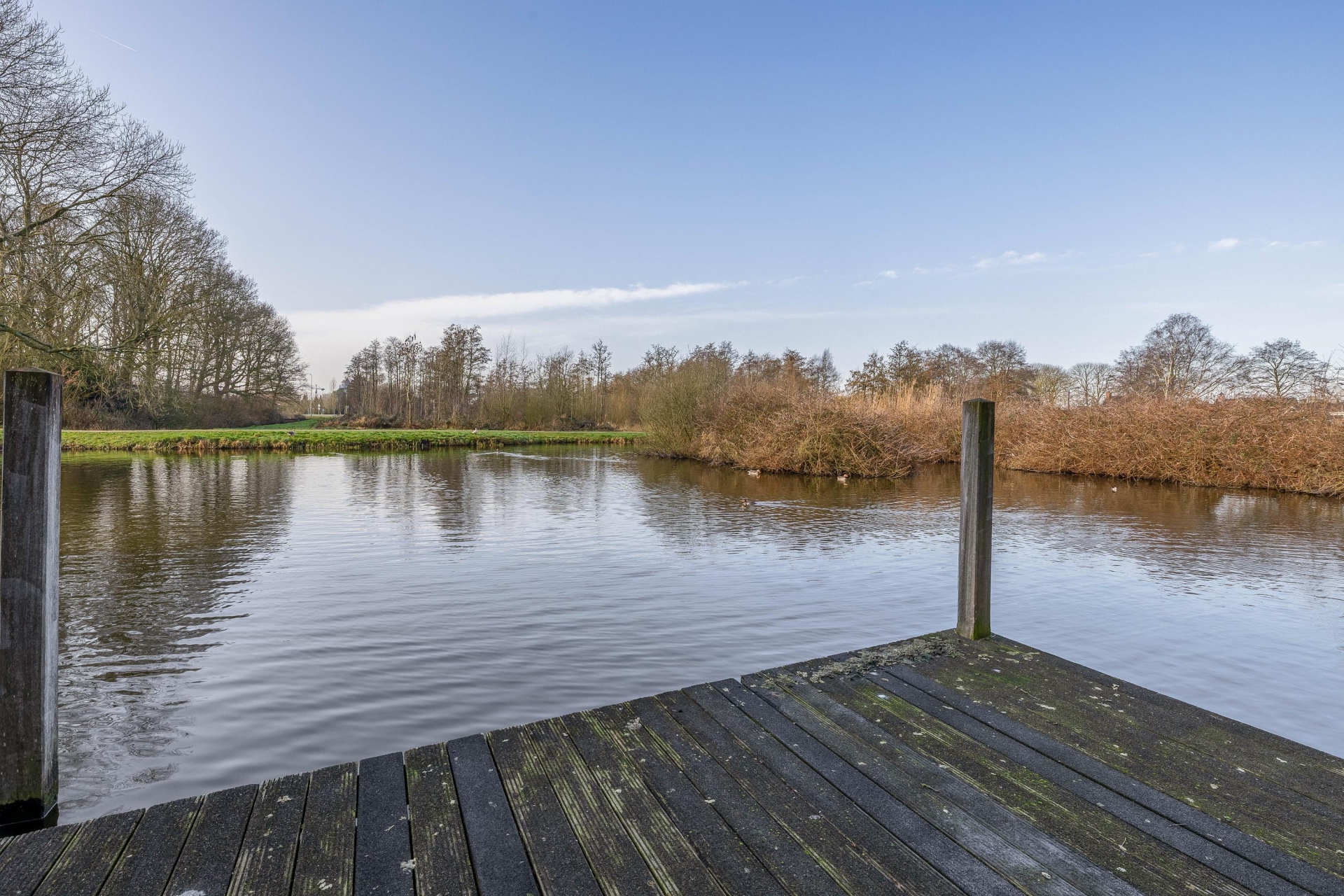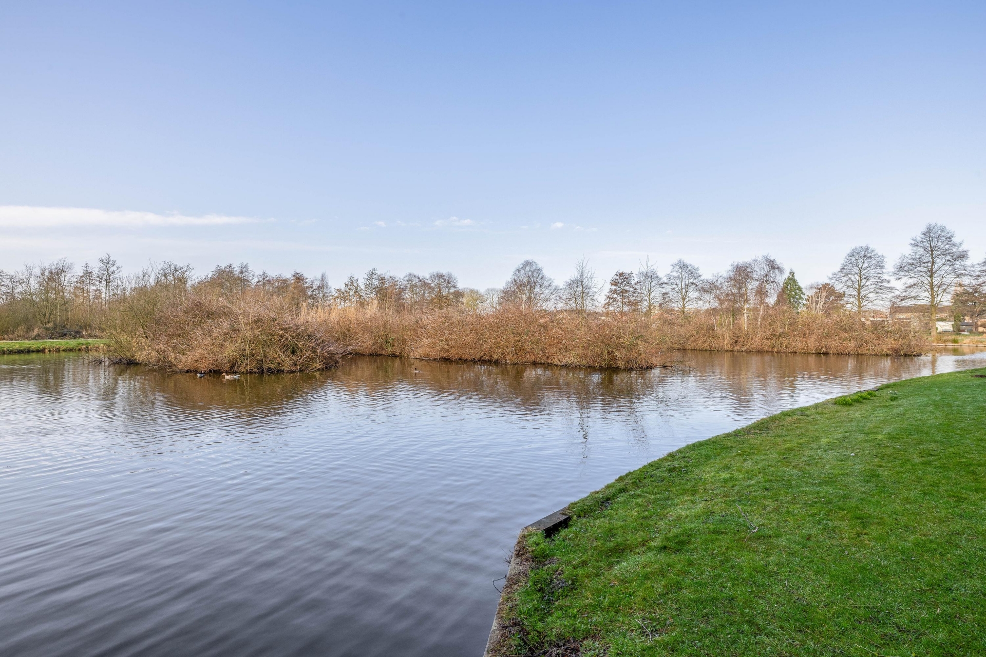 Bij binnenkomst ervaar je direct de ruimte. De woonkamer is royaal opgezet en dankzij de grote raampartijen bijzonder licht. Vanuit de zithoek kijk je vrij uit over het water, waar eenden rustig voorbij zwemmen en het groen zorgt voor een ontspannen sfeer.