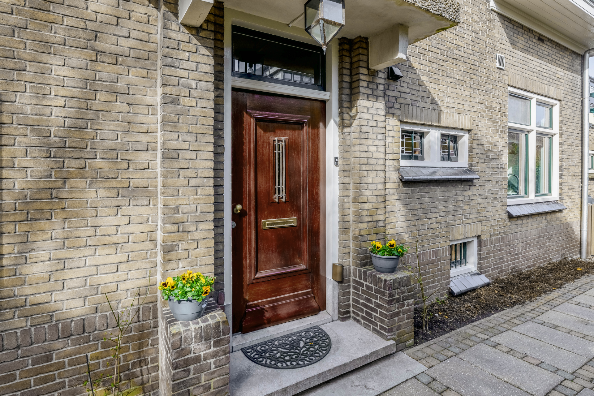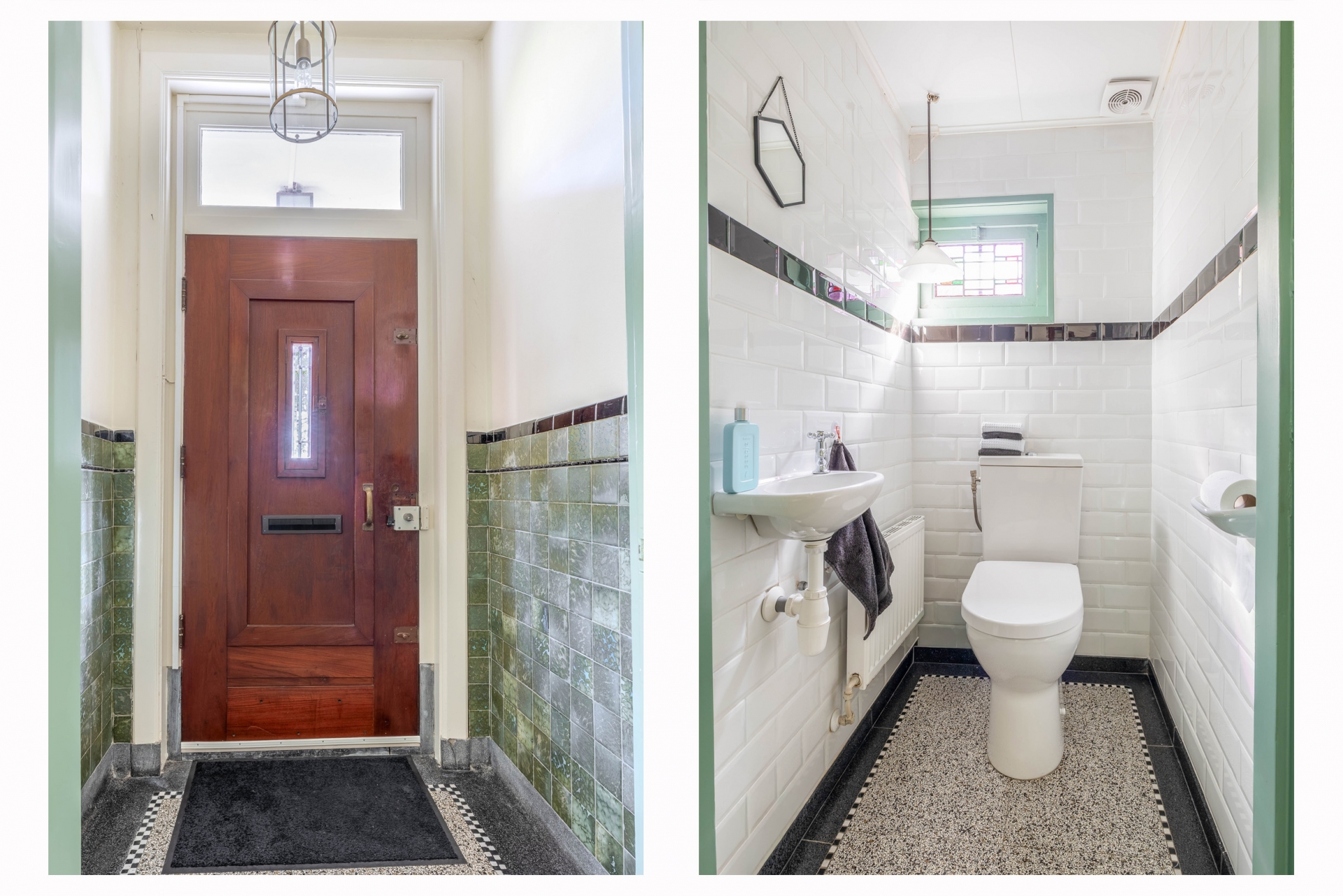Via de fraaie voordeur in jaren ’30 stijl betreedt u de entree met authentieke wandtegels en een geëtste tussendeur naar de hal. Hier ligt de originele doorlopende terrazzovloer en vindt u een garderobe en een toiletruimte met fonteintje en glas-in-loodraam.