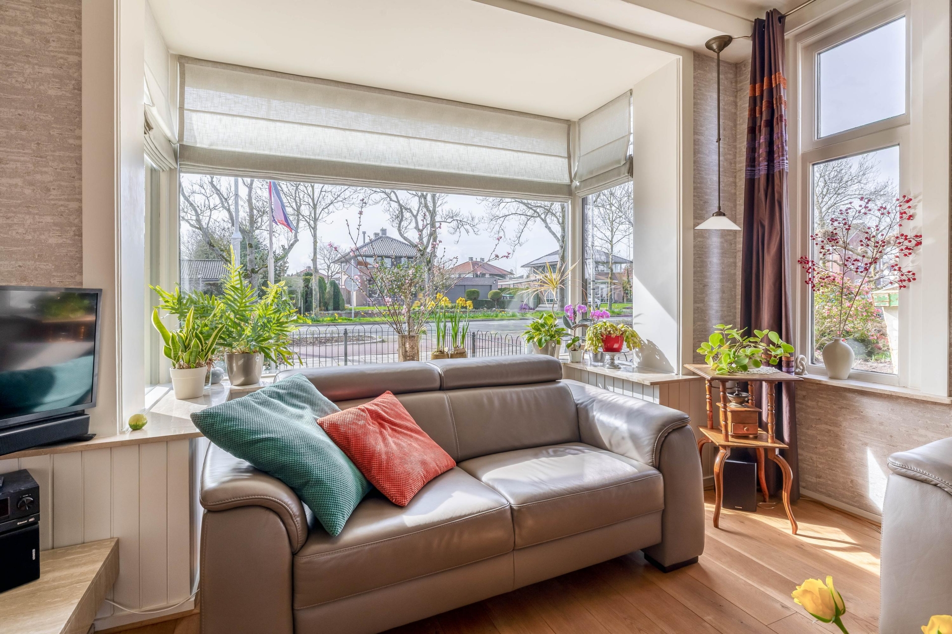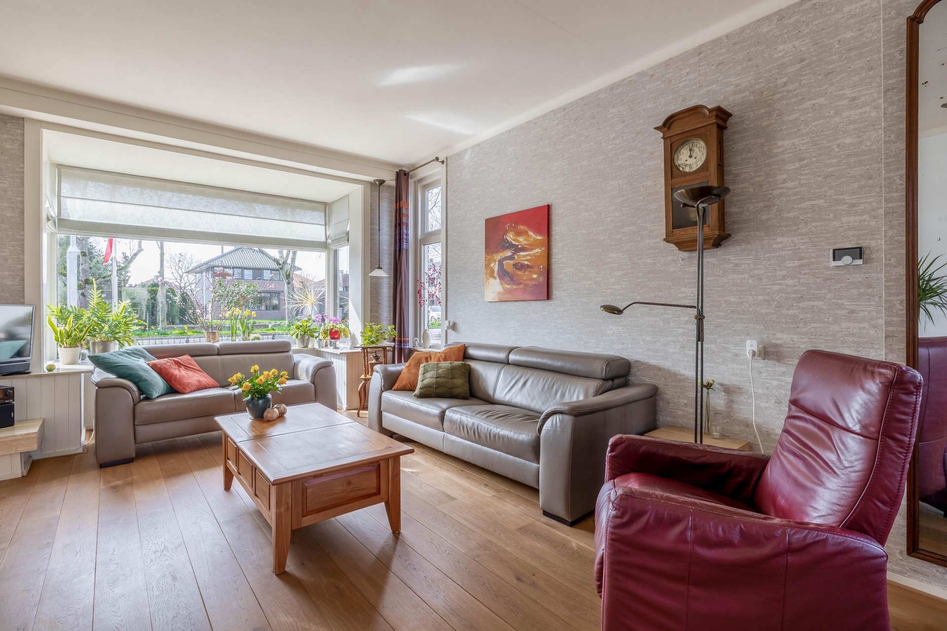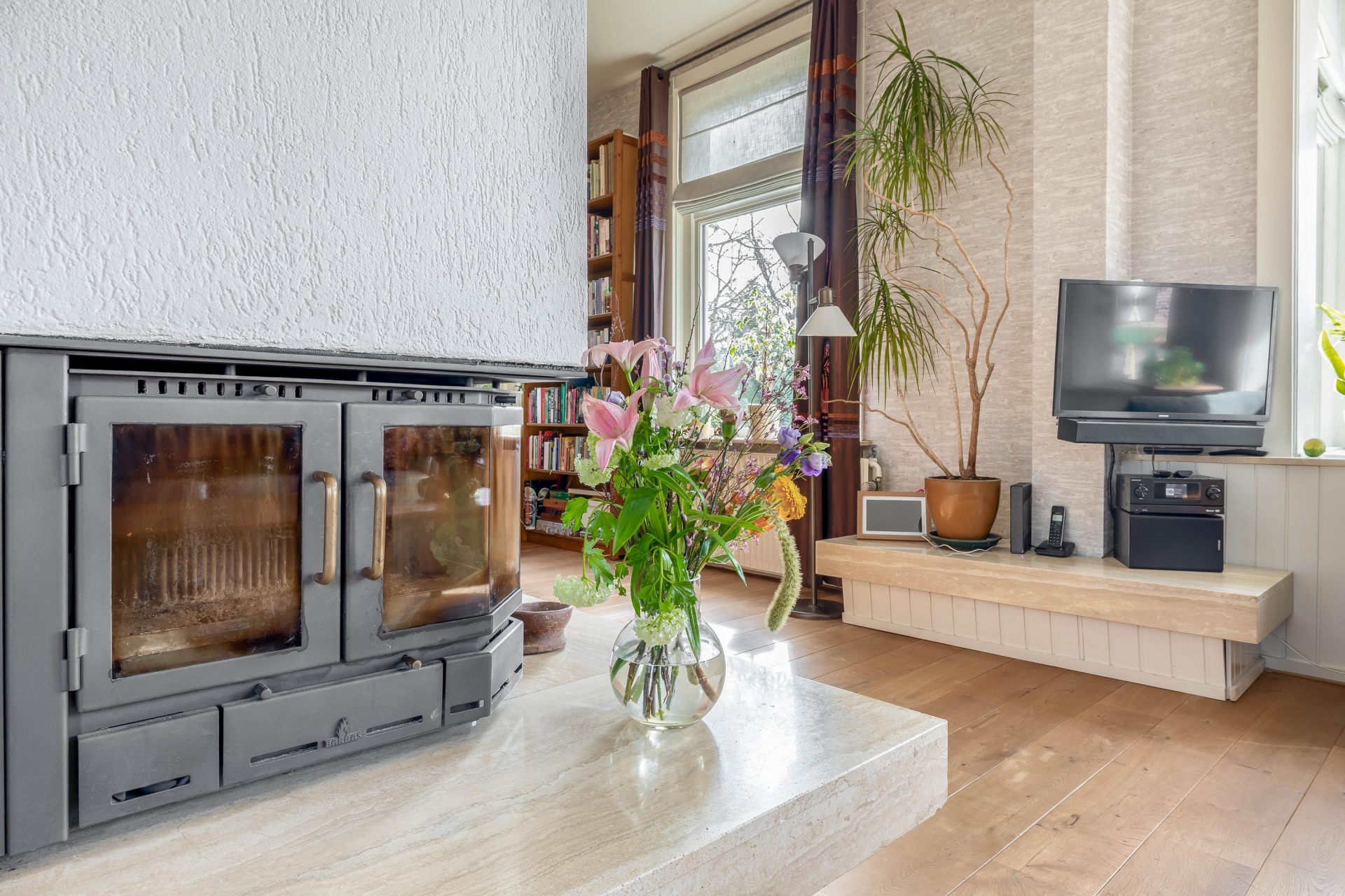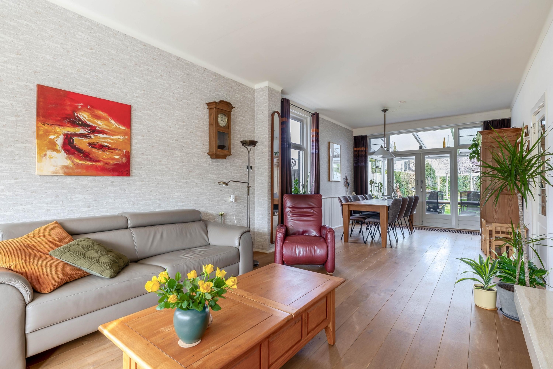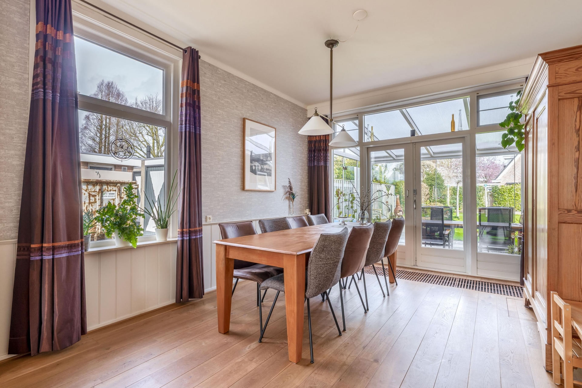 De hal geeft toegang tot de sfeervolle en royale L-vormige woonkamer. Deze ruimte valt direct op door het opvallend hoge plafond, dat zorgt voor een bijzonder ruimtelijk gevoel. De woonkamer beschikt over massief houten vloerdelen, een erker aan de voorzijde, zijramen en een gezellige houtgestookte open haard. Aan de achterzijde zorgen openslaande deuren en een convectorput voor een prettige overgang naar de aangebouwde glazen serre.