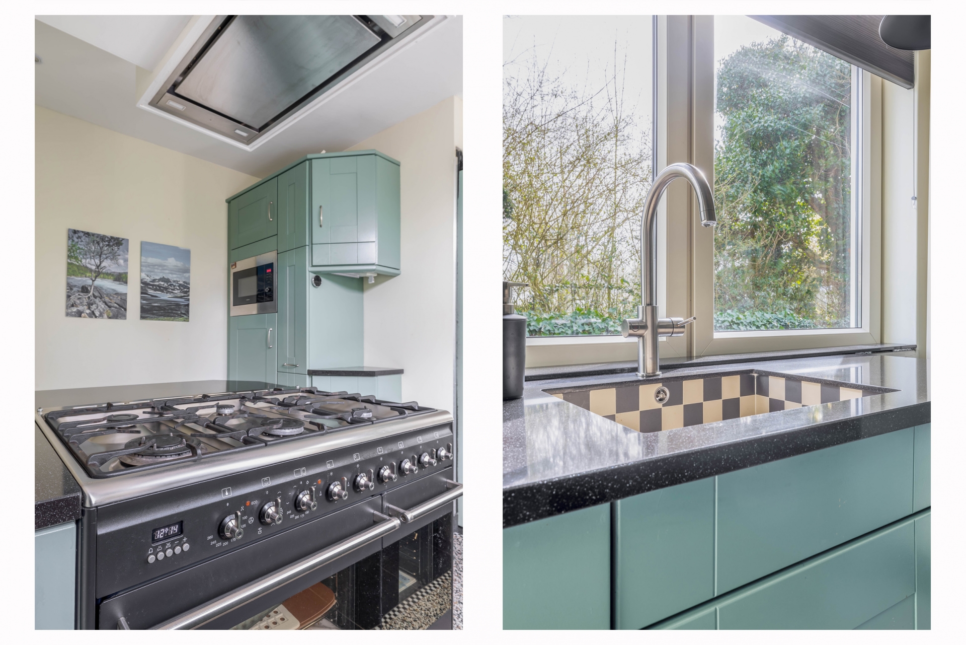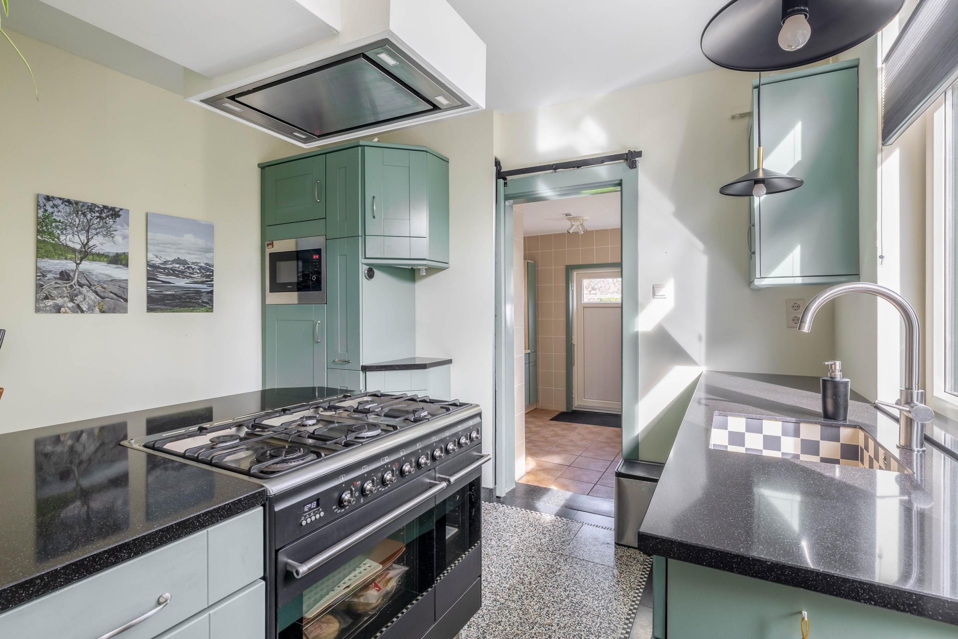 De dichte keuken is uitgevoerd met een luxe eilandopstelling (2020) met zwarte composiet werkbladen en diverse inbouwapparatuur, waaronder een koelkast, vaatwasser, magnetron en een 6-pits Smeg fornuis met dubbele oven. De afzuiging is stijlvol geïntegreerd in het plafond. Ook hier ligt een terrazzovloer, passend bij de authentieke sfeer van de woning.
