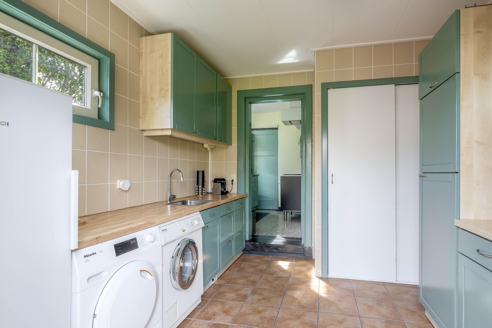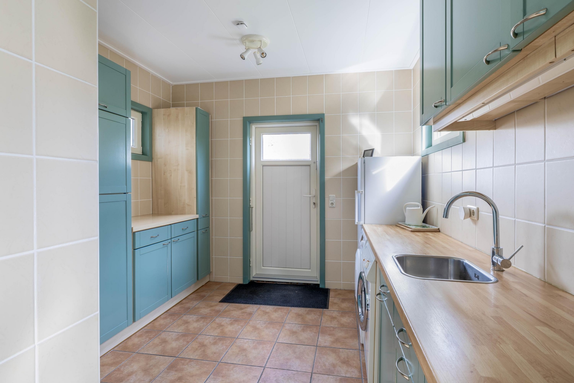 Vanuit de keuken bereikt u een provisiekelder op stahoogte. Tevens is er toegang tot een ruime bijkeuken/wasruimte met vaste schuifkasten, een keukenblok met spoelbak, daglicht via een raam en een deur naar de tuin. Hier bevindt zich tevens de CV-combiketel en de 3-fase meterkast.