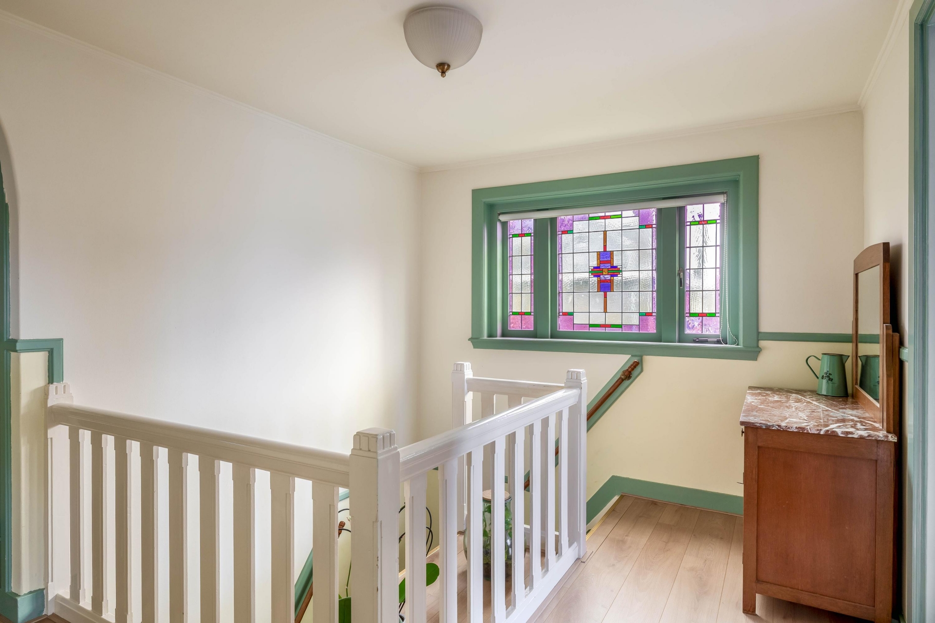Via een vaste trap bereikt u de ruime Z-vormige overloop met een glas-in-loodraam.