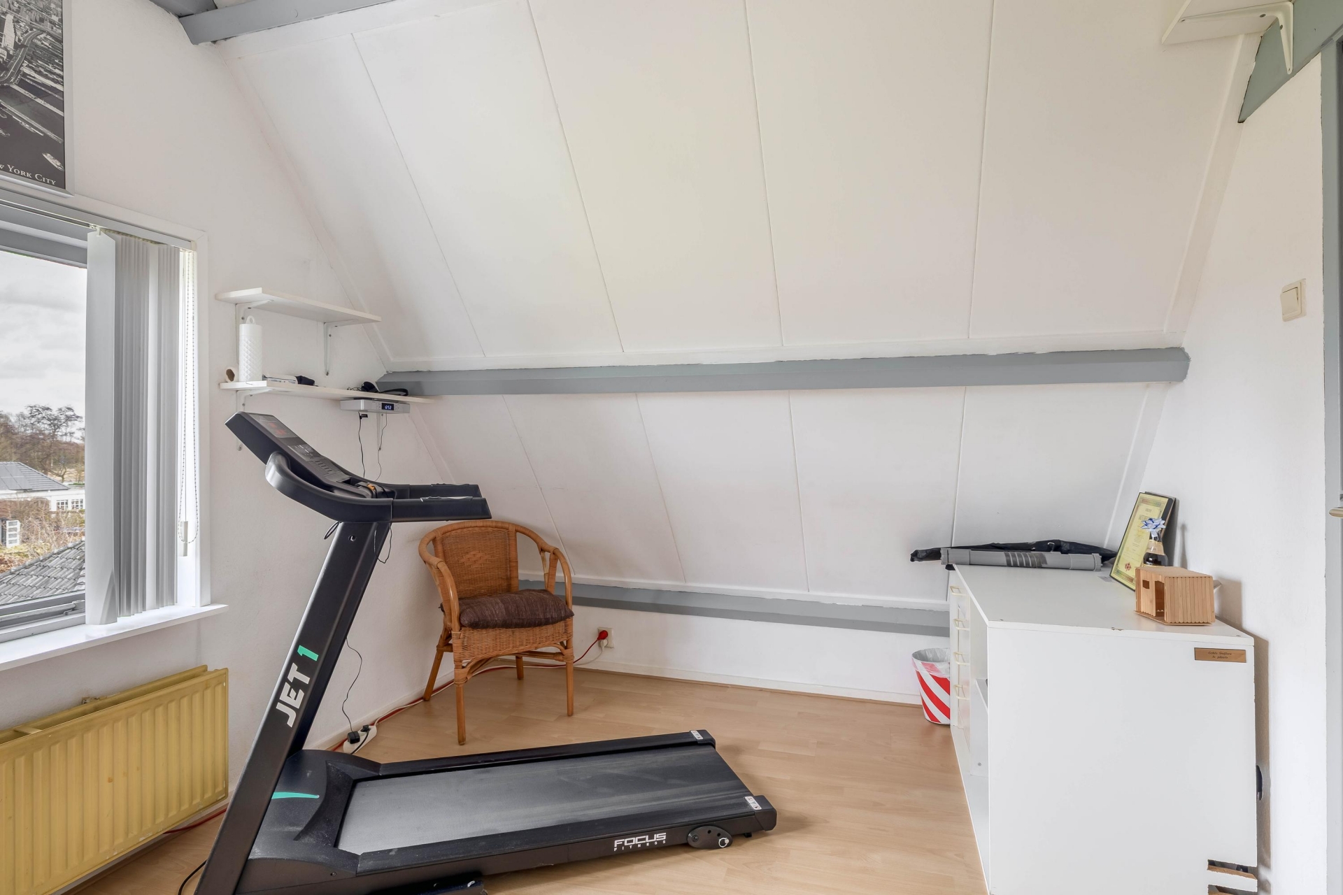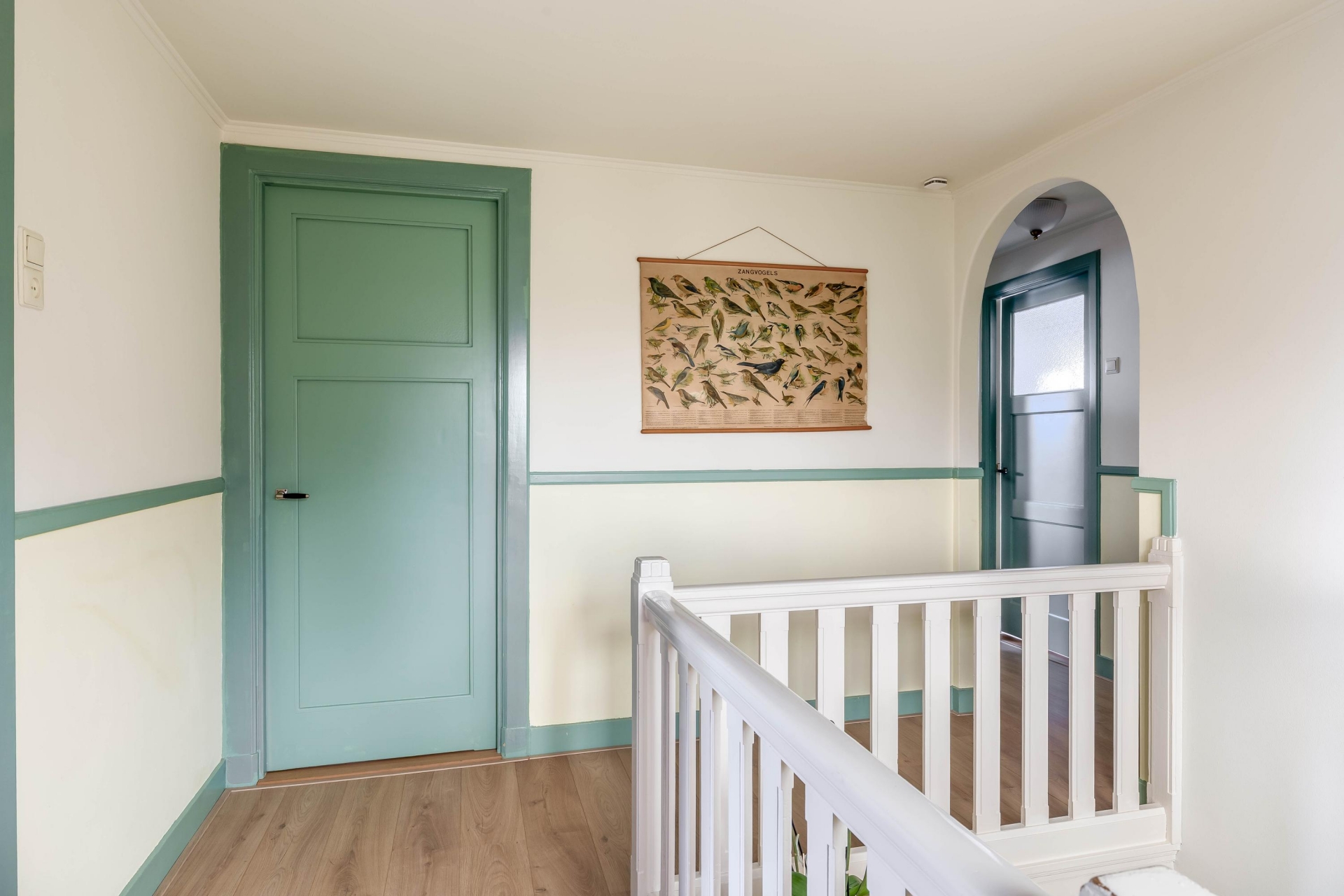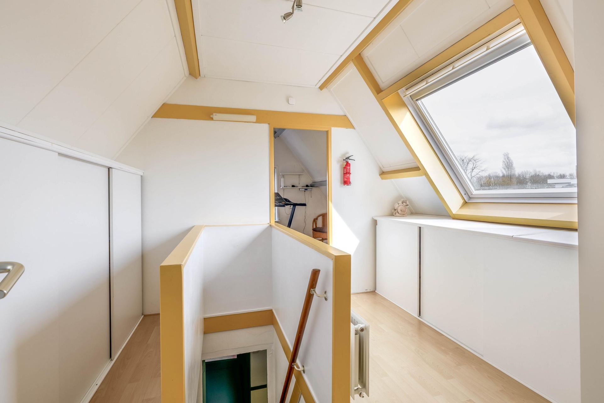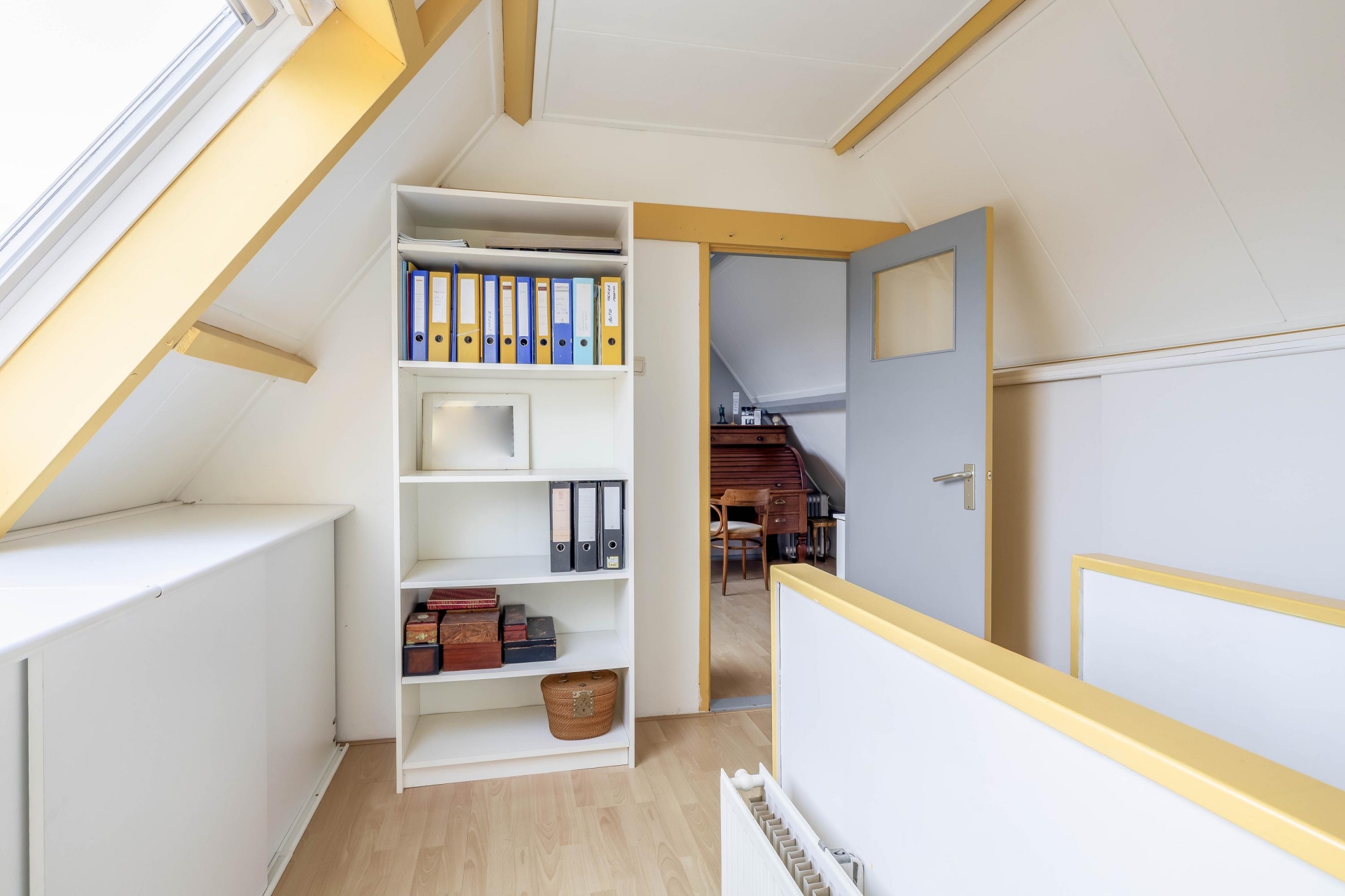Via een vaste trap bereikt u de tweede verdieping met een overloop met dakraam en bergruimte onder de schuine kap.