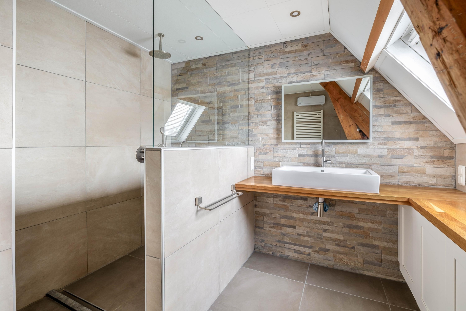 De luxe badkamer is sfeervol en praktisch ingericht en beschikt over een ruime inloopdouche met glazen wand, hand- en stortdouche, een wastafelmeubel met houten blad, maatwerk opbergkasten en een tweede toilet. Daglicht komt binnen via een dakraam.