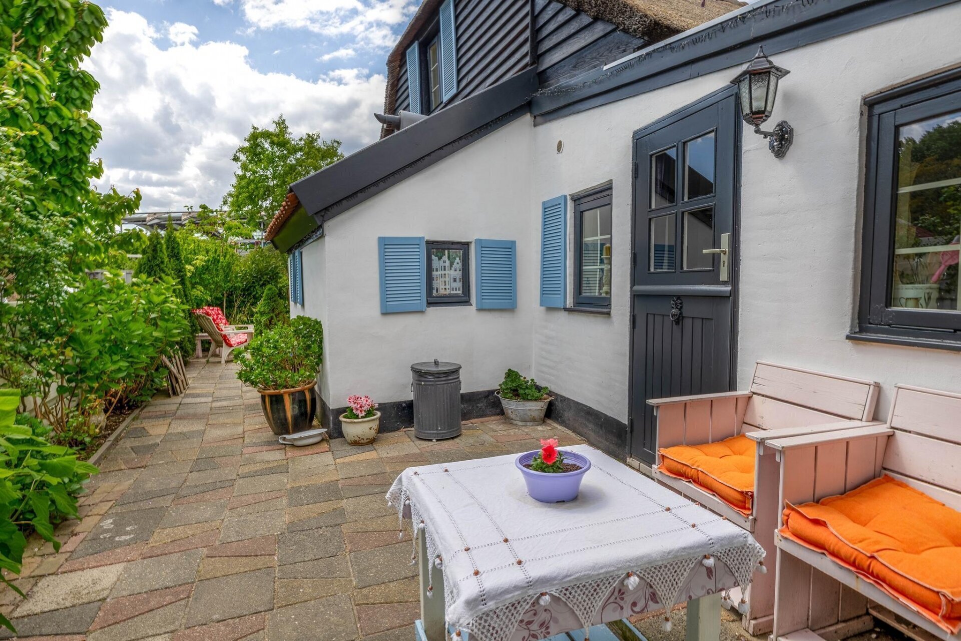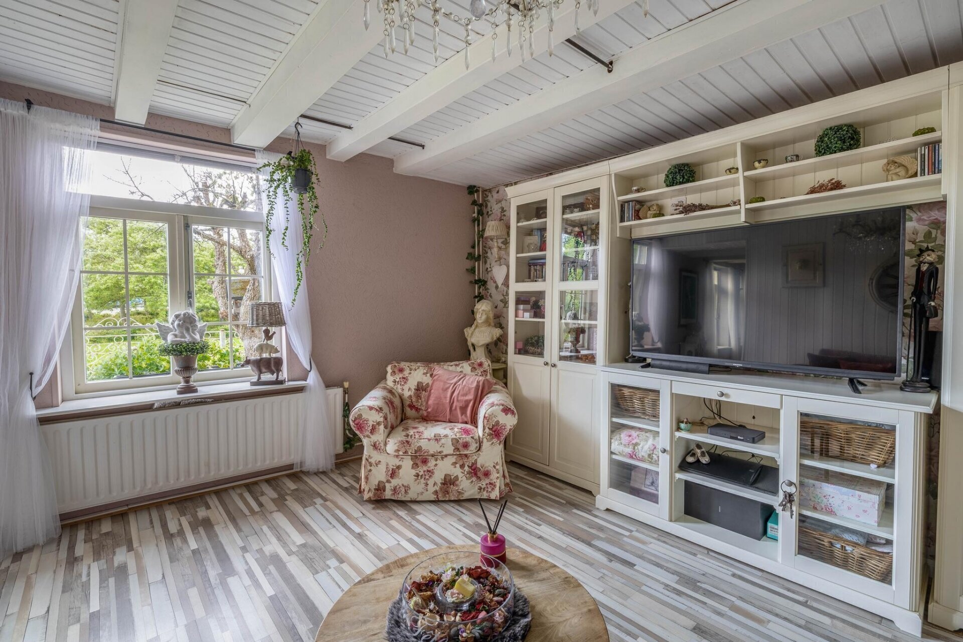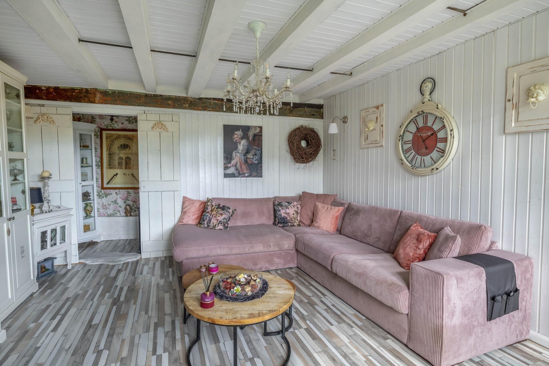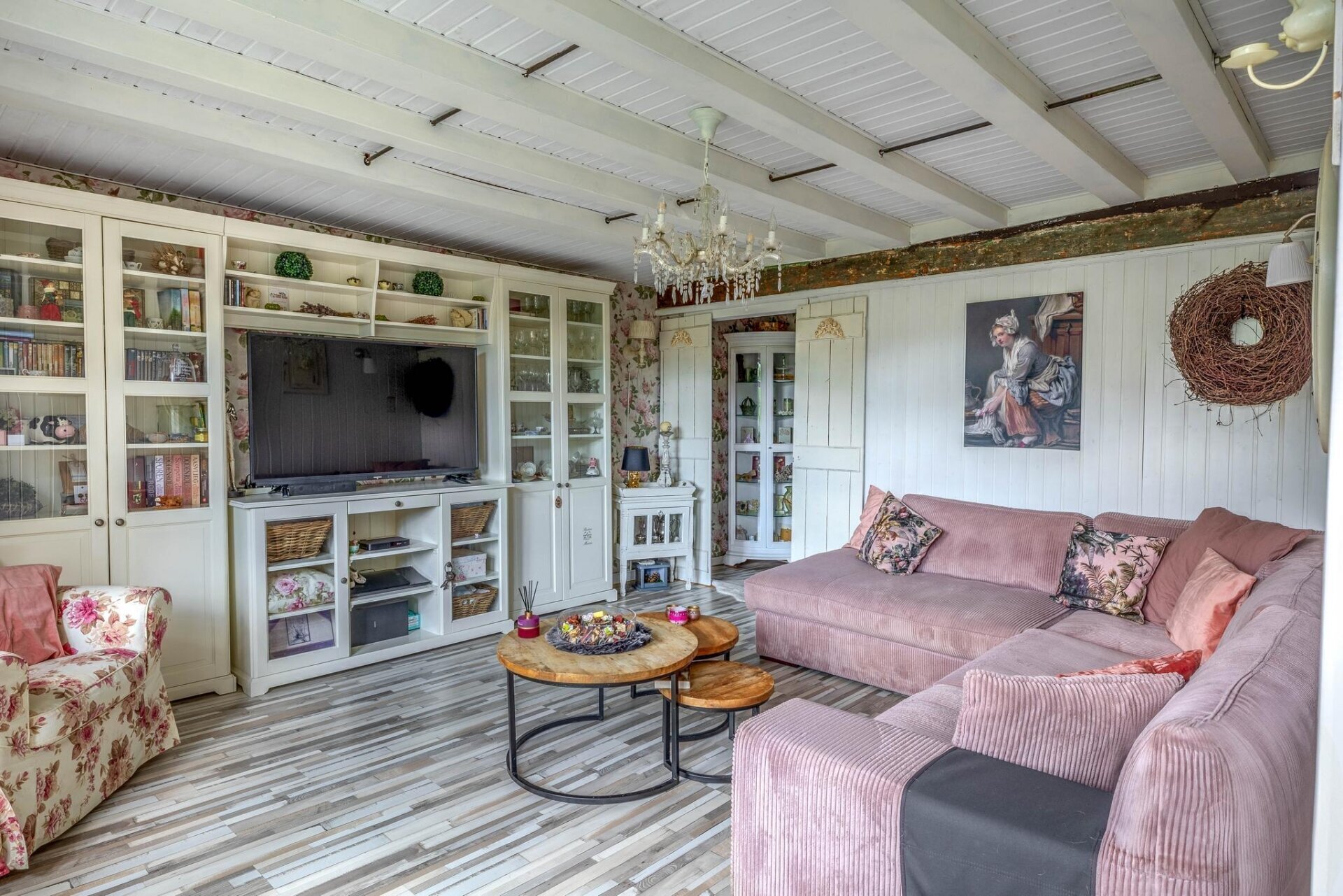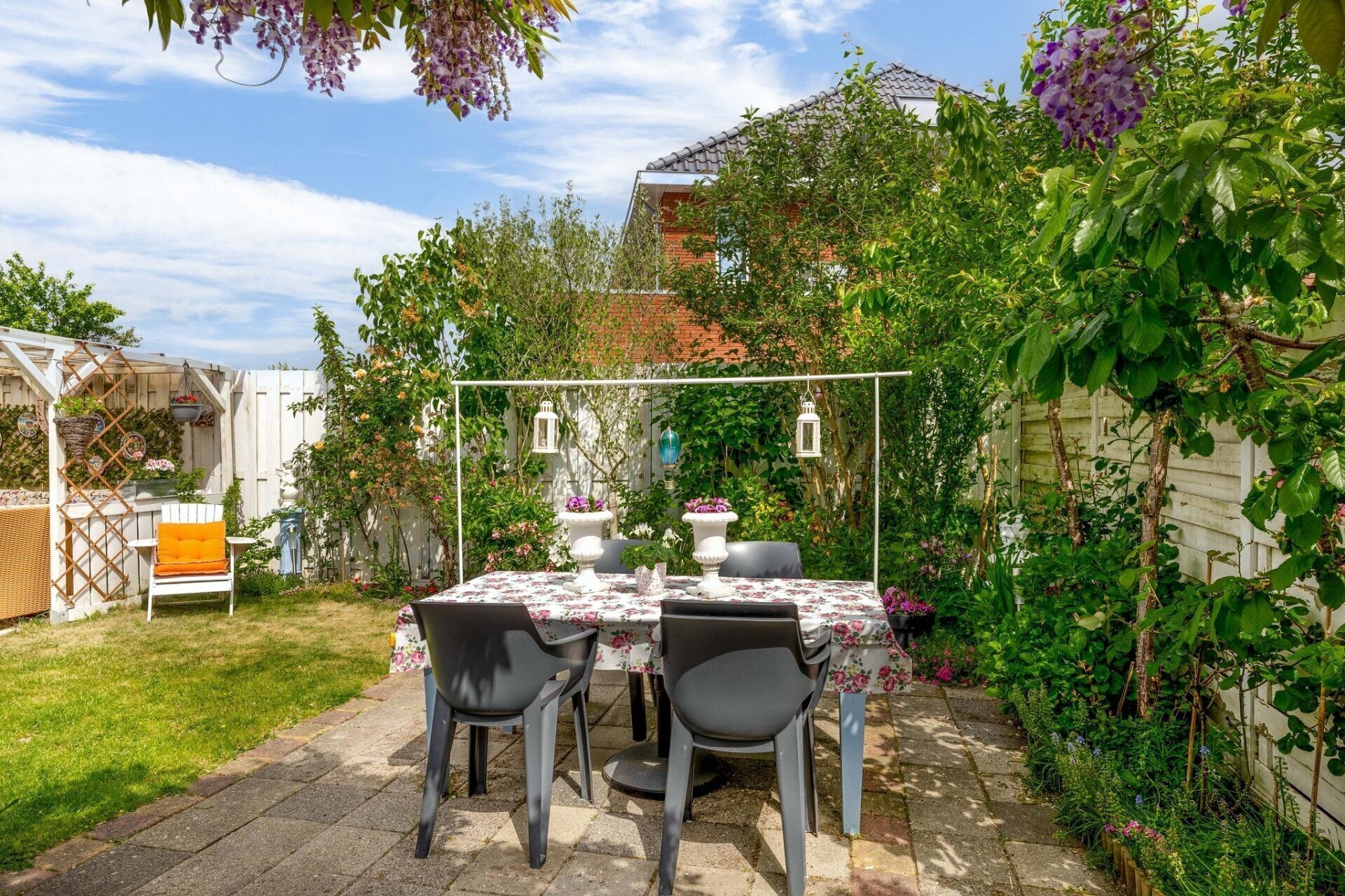 Buiten is minstens zo sfeervol als binnen. Rondom het huis ligt een verzorgde tuin met meerdere terrassen, waar je op elk moment van de dag een plekje in de zon of schaduw kunt kiezen. Dankzij de vrije ligging aan de rand van het dorp geniet je hier van rust, privacy en groen om je heen. Achterin de tuin staat een vrijstaande houten berging van ca. 10 m² – handig voor je fietsen, gereedschap of als werkruimte.