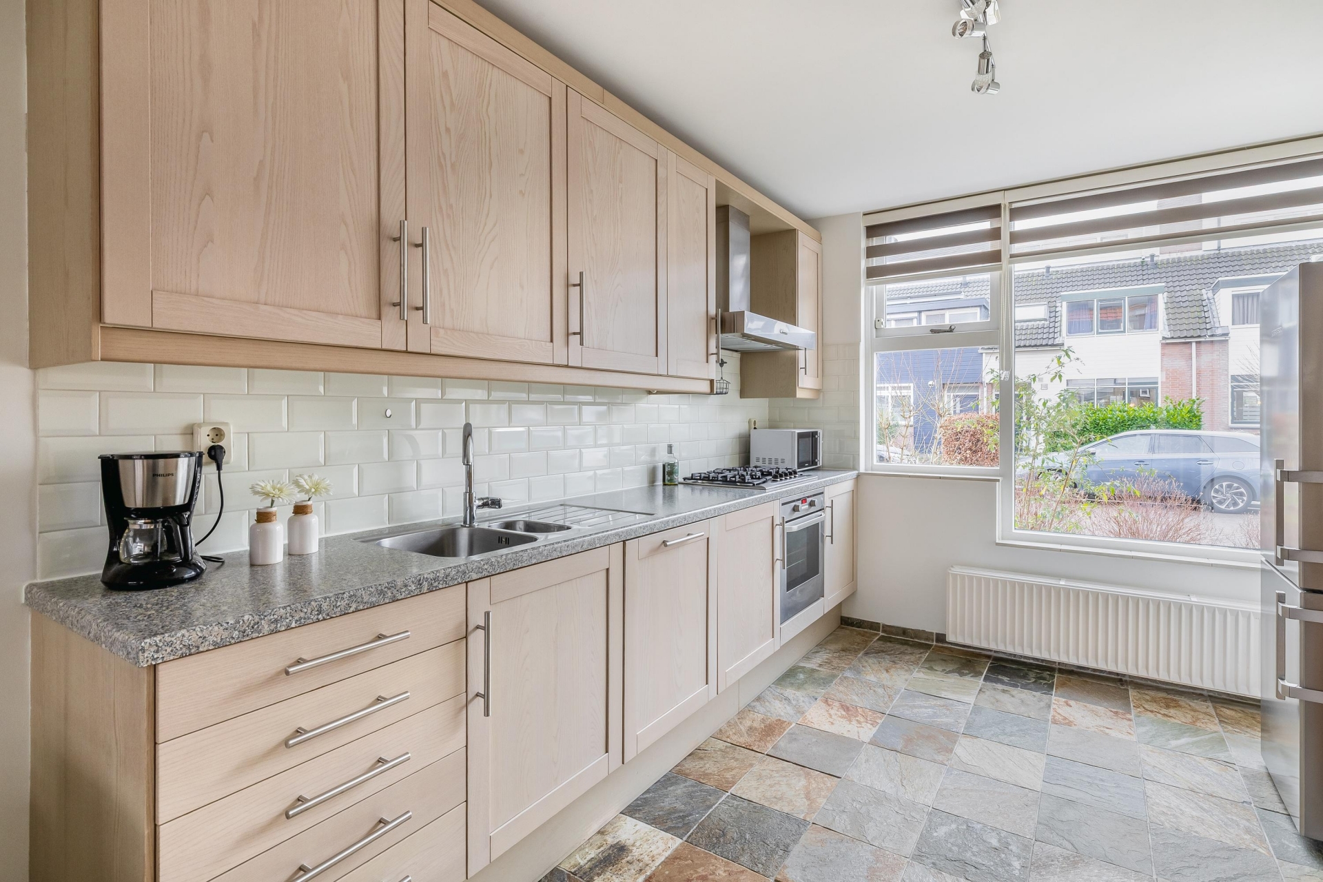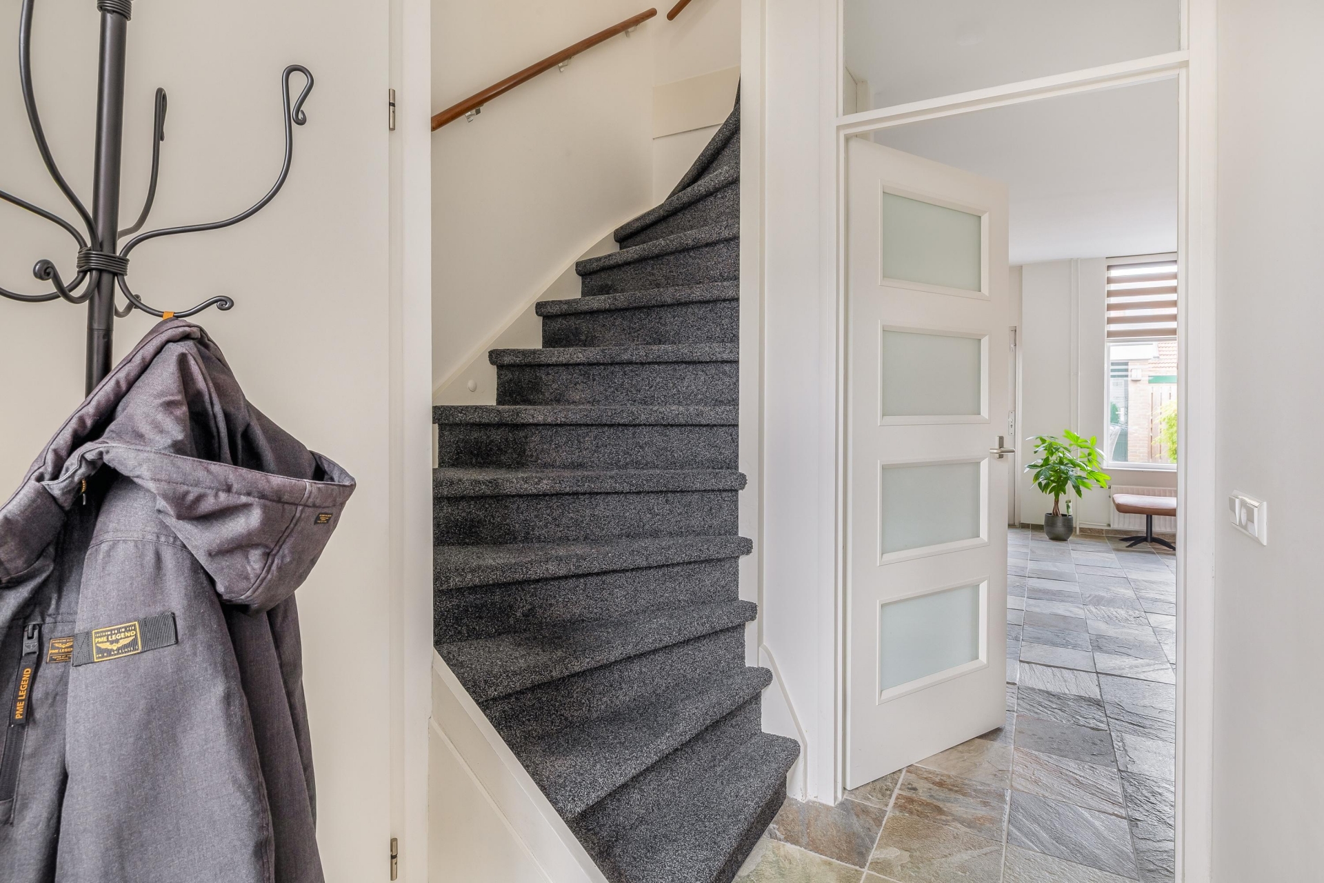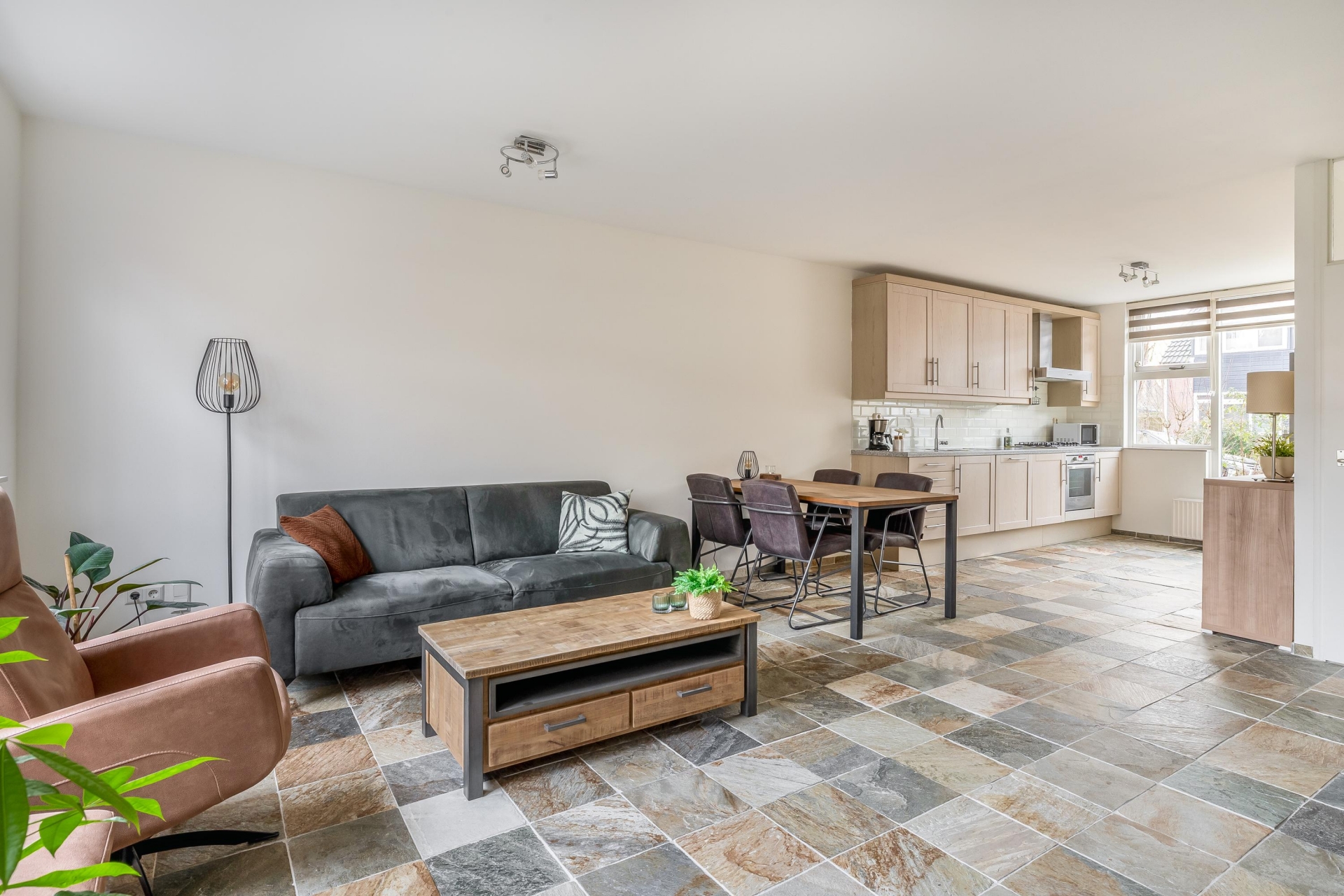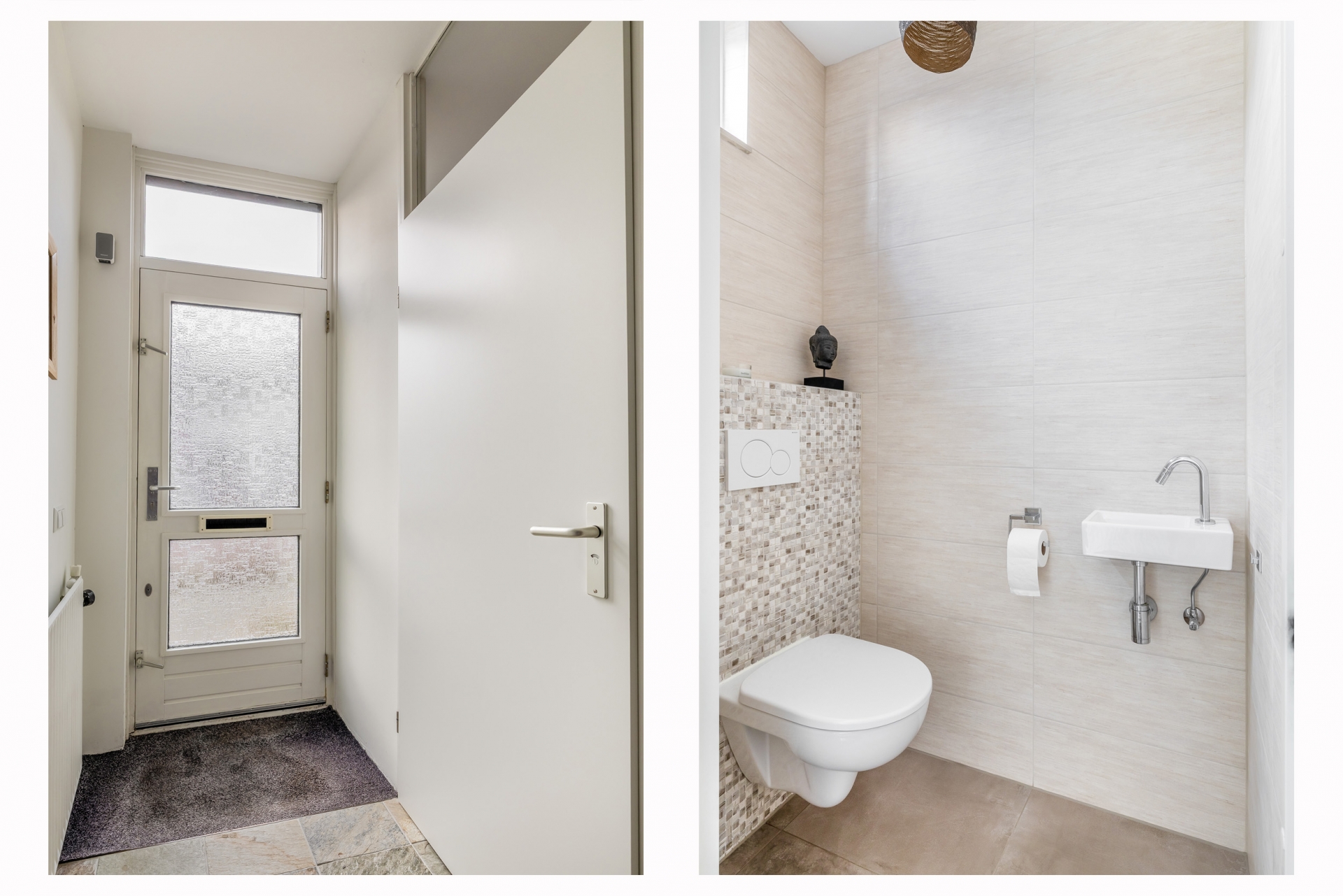 Entree woning met een lichte hal met meterkast (vernieuwd) en een licht betegeld toilet met hangend closet en fonteintje. Nette woonkamer met een trapkast, toegang tot de achtertuin en een halfopen keuken aan de voorzijde van de woning met diverse inbouwapparatuur waaronder een 5-pits gaskookplaat, afzuigkap, oven en vaatwasser. De achtertuin is uitgevoerd met een stenen berging met elektra en achterom. De gehele begane grond is voorzien van een natuurstenen vloer.