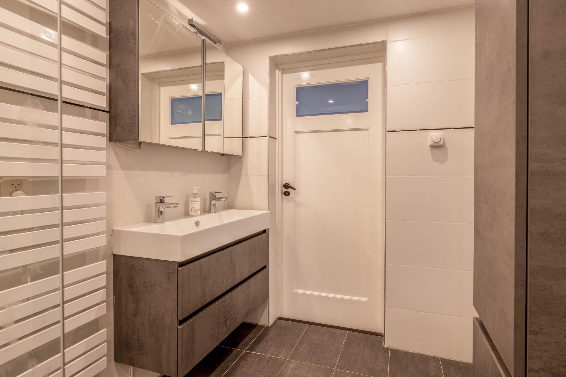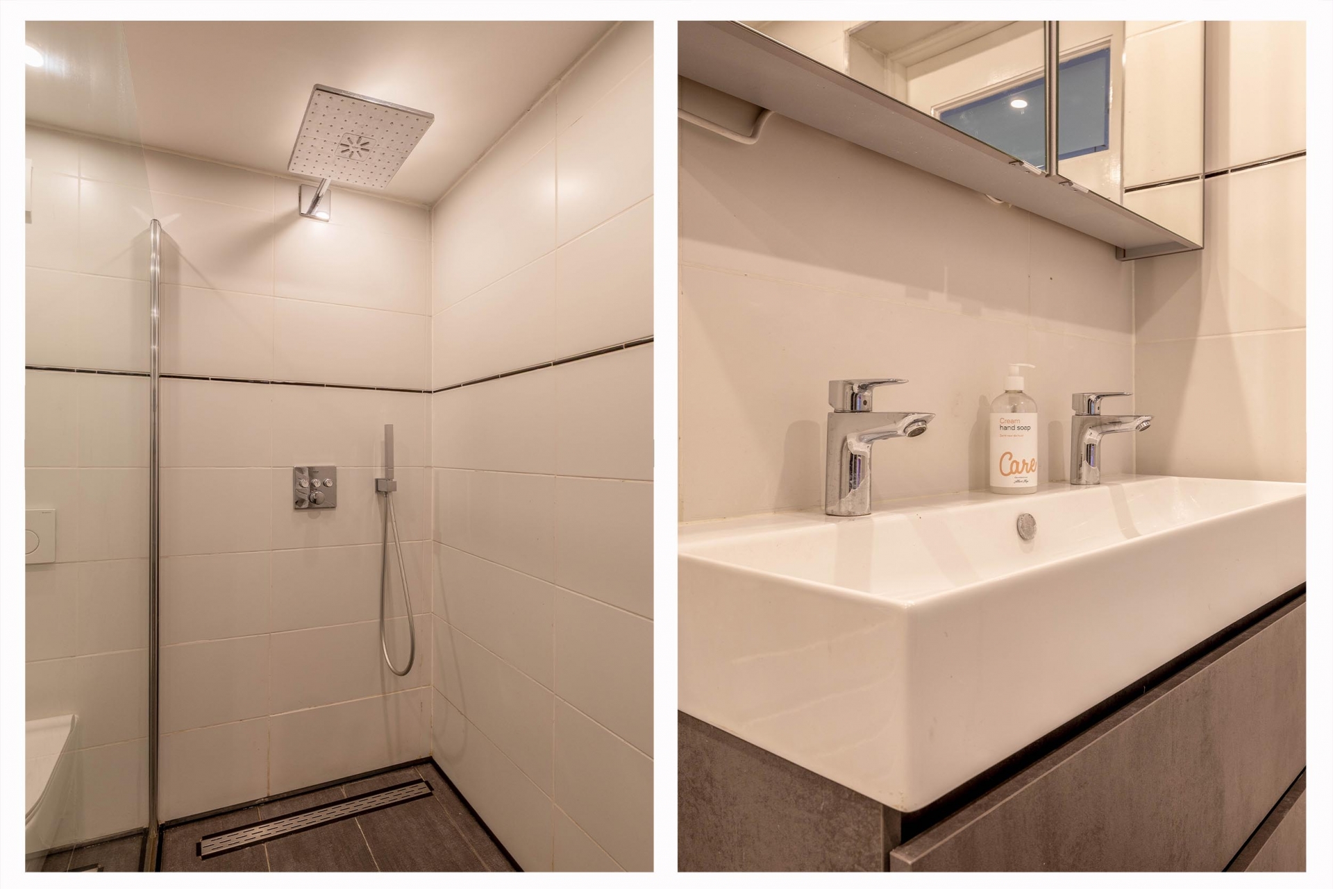 De recent vernieuwde badkamer is een oase van rust, uitgevoerd in warme tinten met een ruime inloopdouche, dubbele wastafel en strak tegelwerk.