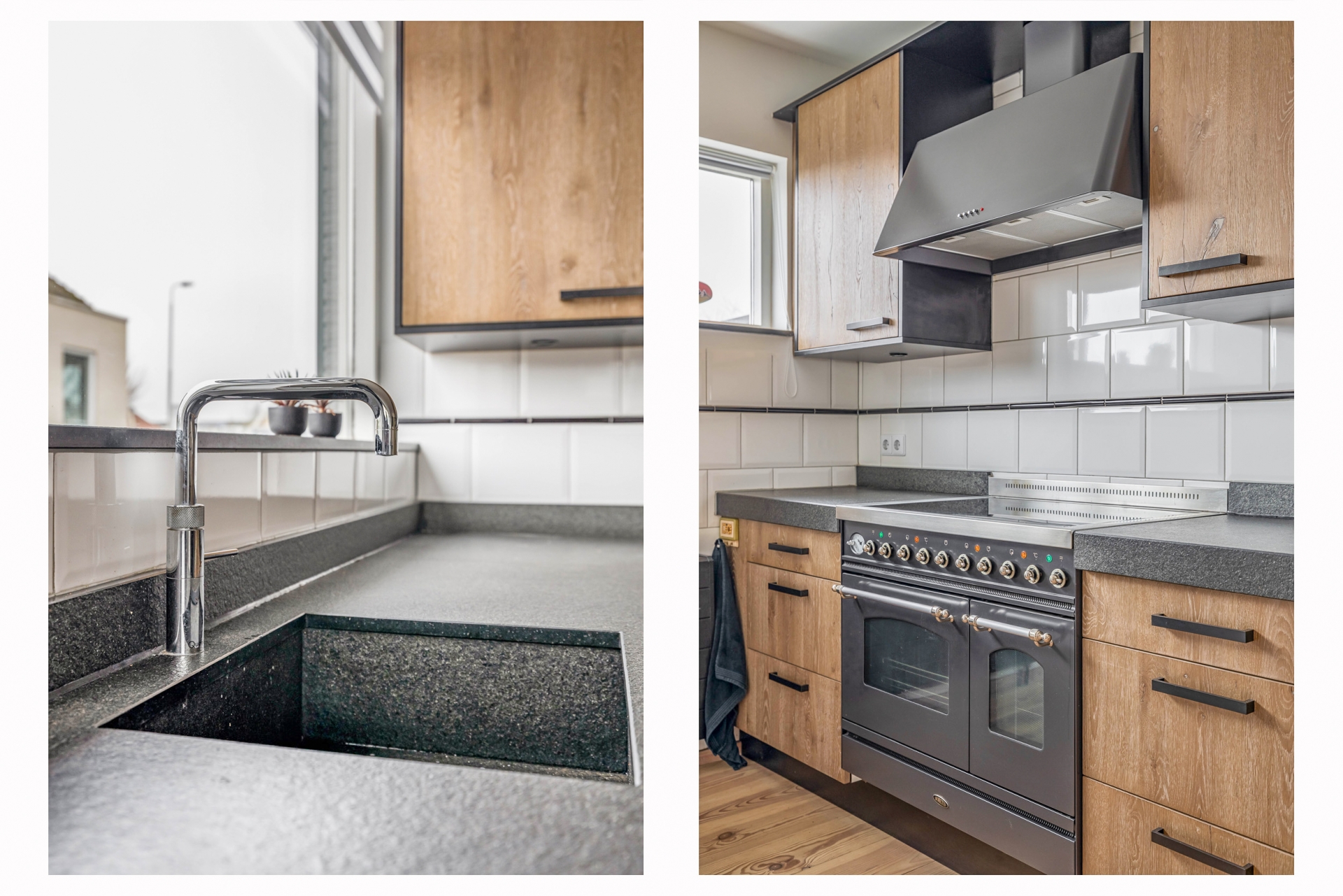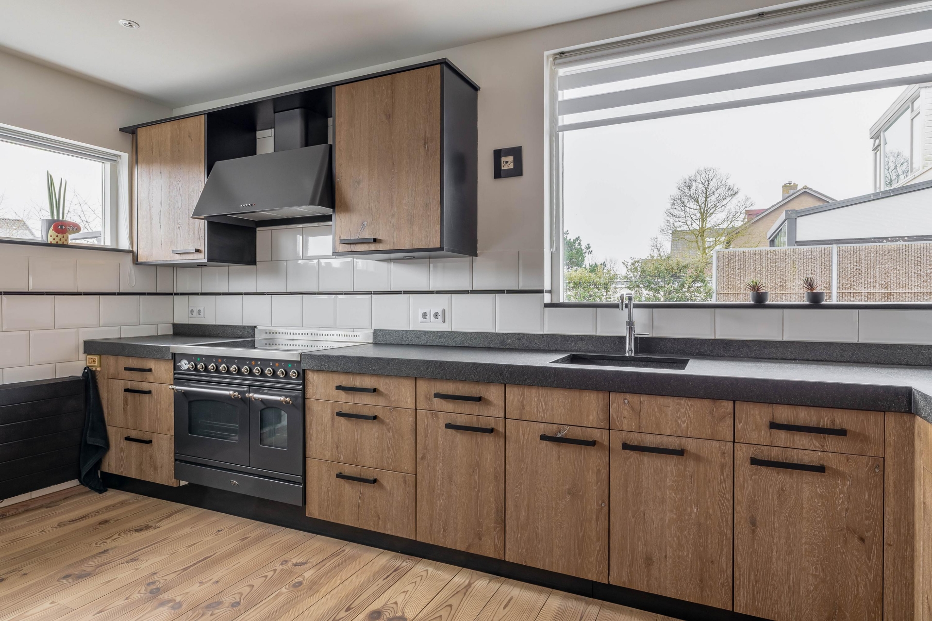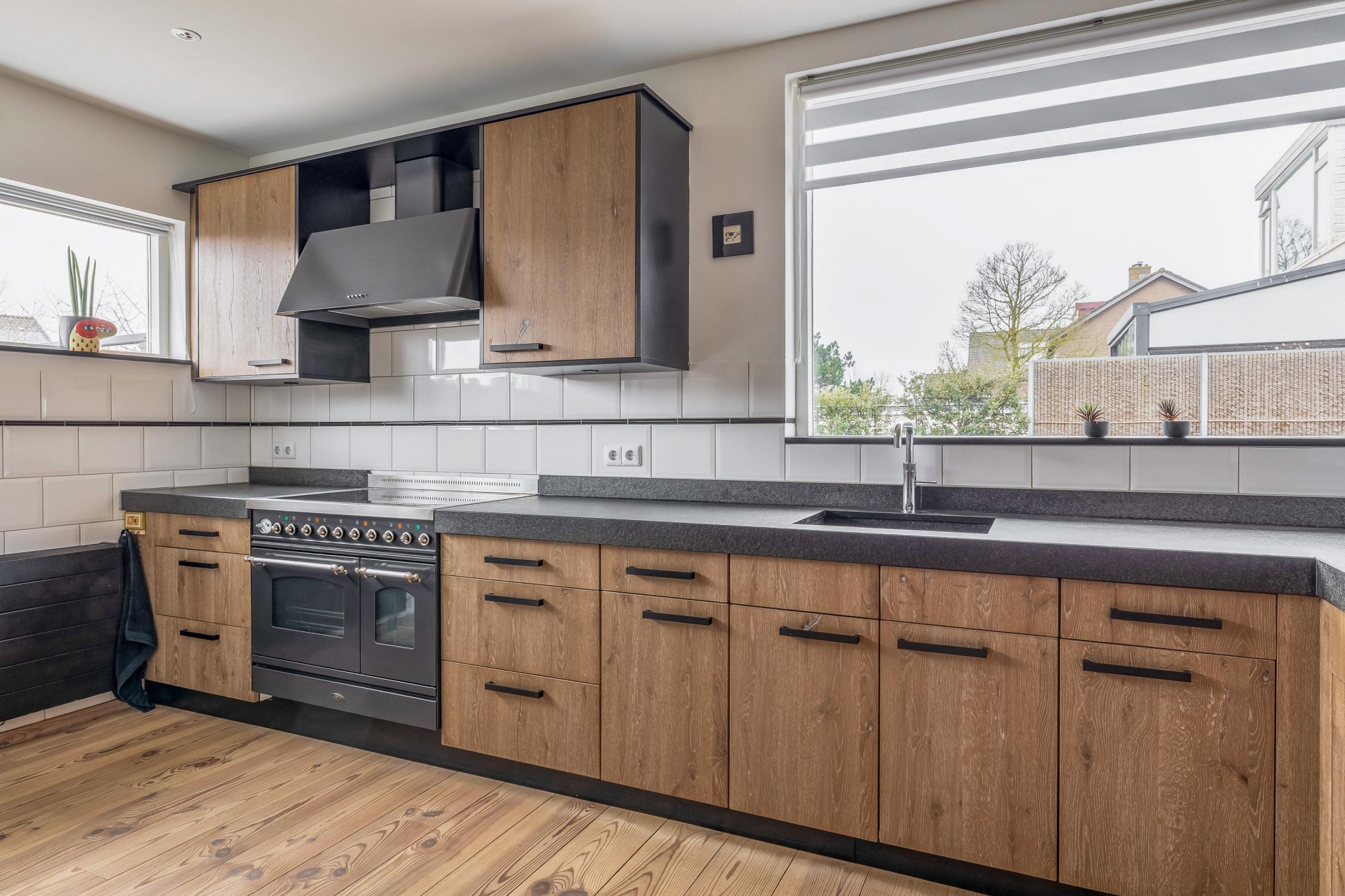 De keuken sluit mooi aan op de leefruimte en heeft een stoere, landelijke uitstraling. Het grote fornuis springt direct in het oog en nodigt uit om uitgebreid te koken. Er is veel werkblad en kastruimte aanwezig, waardoor functionaliteit en uitstraling hier hand in hand gaan. Vanuit het raam kijk je uit op de tuin, wat zorgt voor een fijne connectie met buiten tijdens het koken.