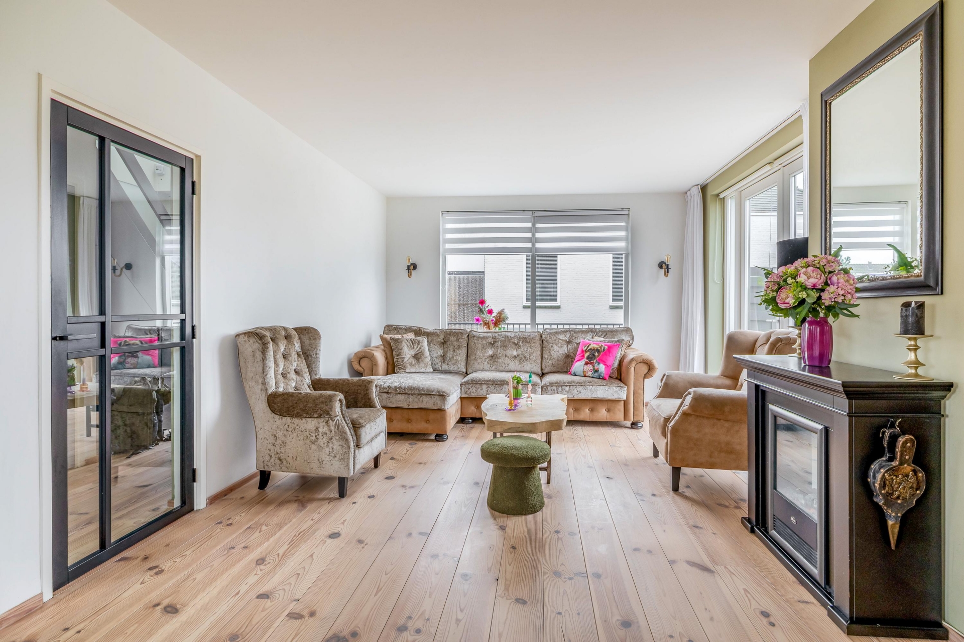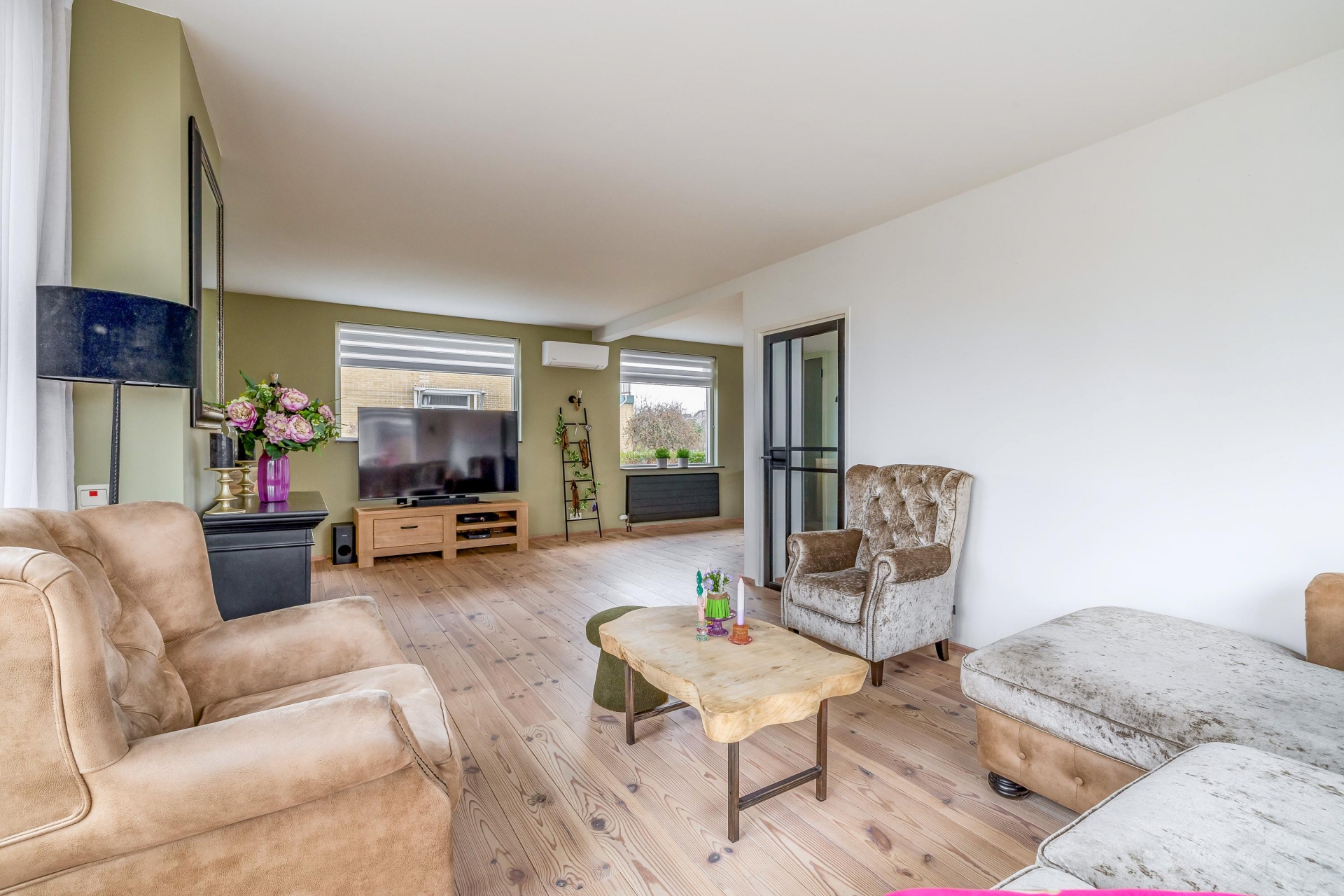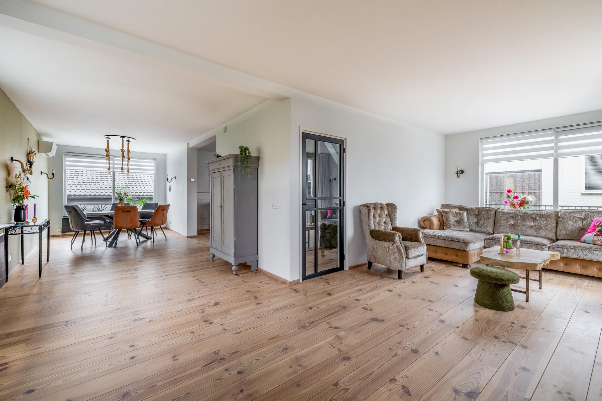 Binnen valt direct de prettige lichtinval op. De woonkamer is royaal opgezet en voorzien van brede houten vloerdelen die warmte en karakter toevoegen. Grote raampartijen zorgen voor een open verbinding met buiten en laten het daglicht rijkelijk binnenstromen.