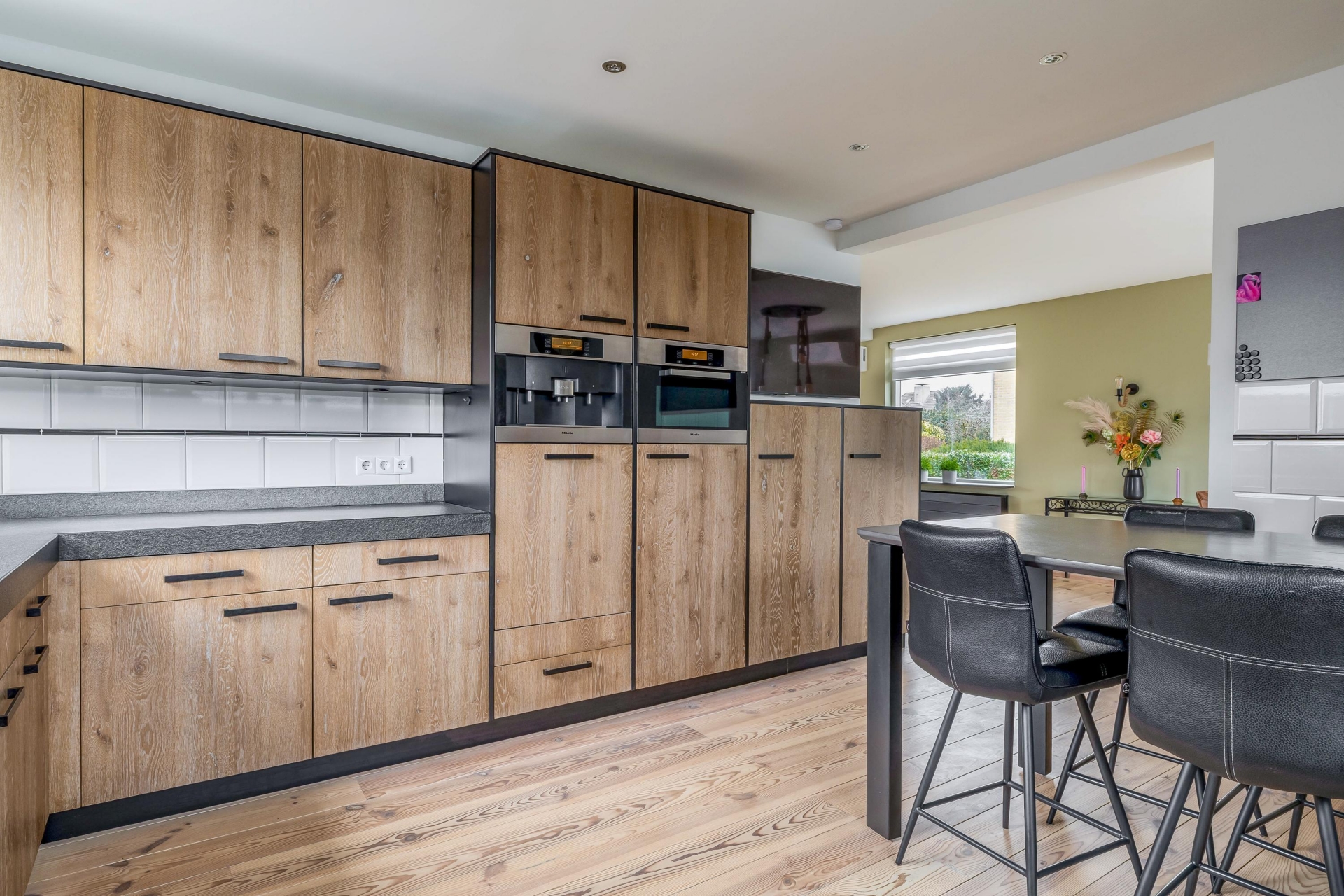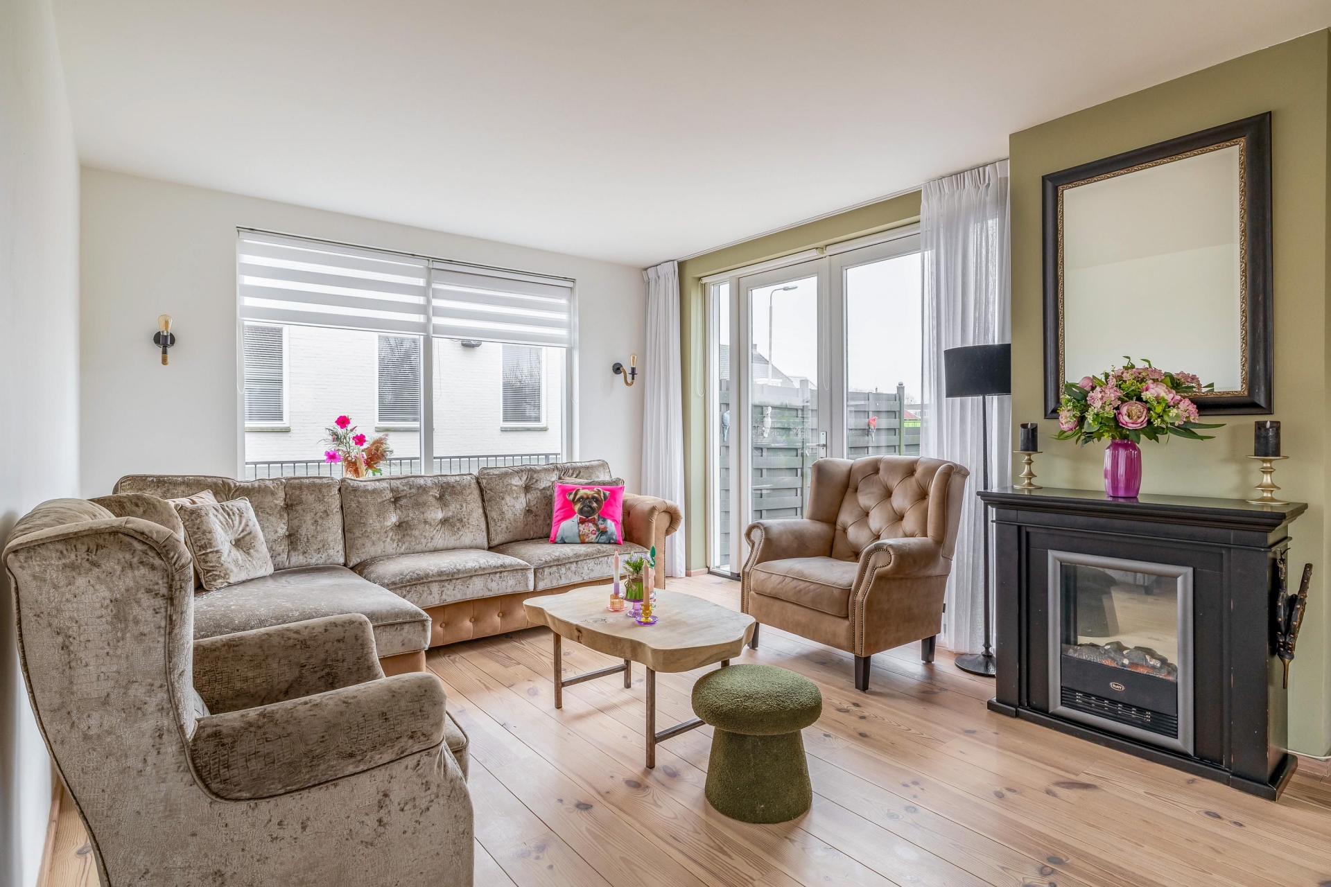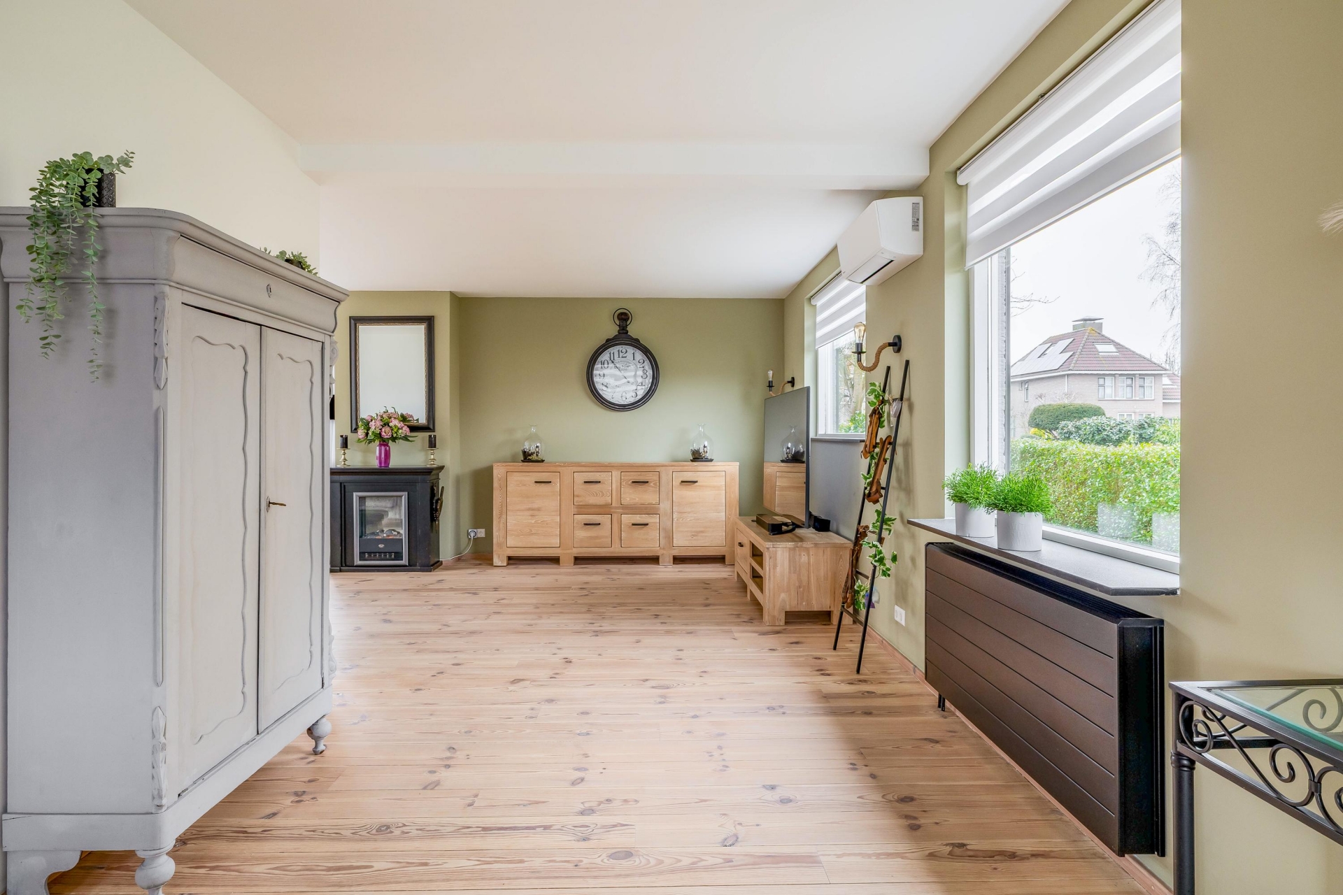Binnen valt direct de prettige lichtinval op. De woonkamer is royaal opgezet en voorzien van brede houten vloerdelen die warmte en karakter toevoegen. Grote raampartijen zorgen voor een open verbinding met buiten en laten het daglicht rijkelijk binnenstromen.
