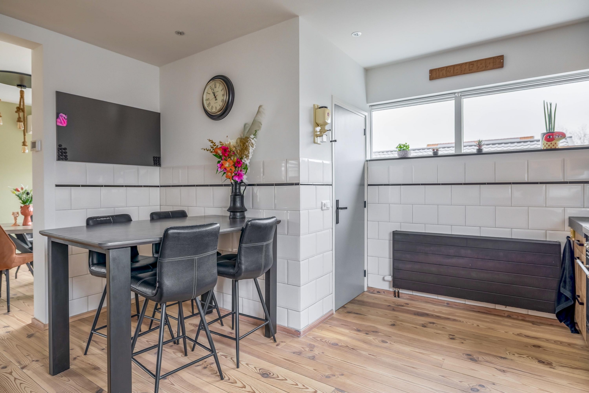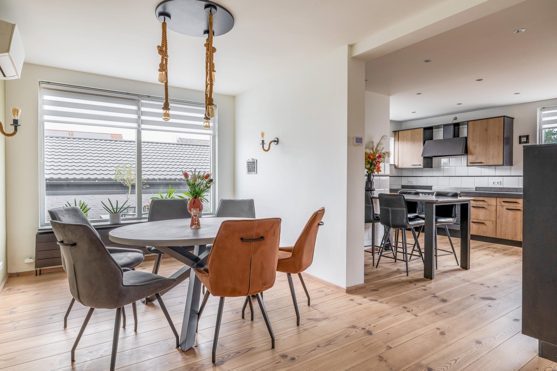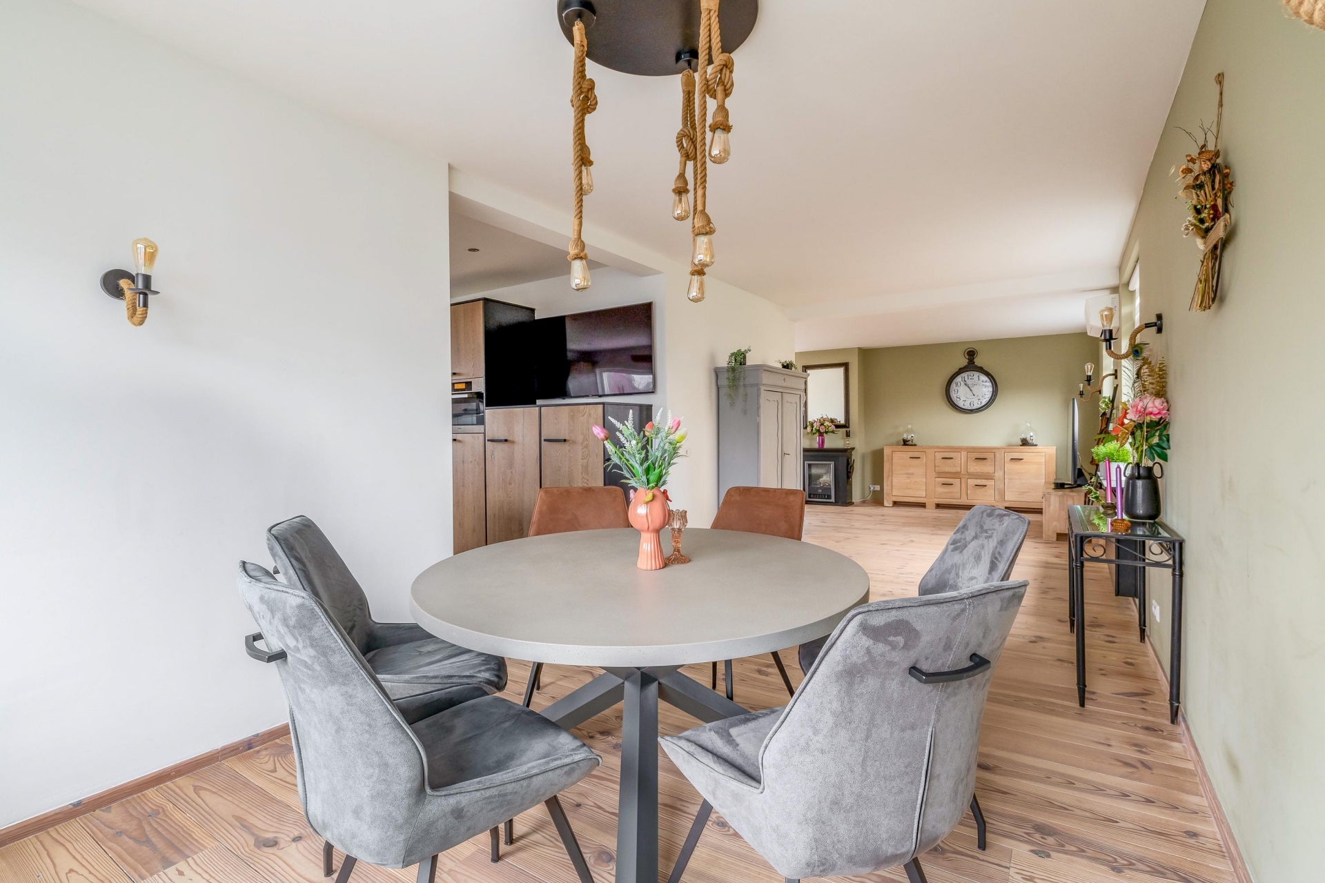 De indeling is logisch en comfortabel, met een duidelijke zithoek en een ruime plek voor de eettafel. Dit is een leefruimte waar je met gemak gasten ontvangt, maar waar je je ook terugtrekt met een goed boek. De openheid tussen de verschillende woonfuncties maakt het geheel prettig en overzichtelijk – ideaal voor wie gelijkvloers comfort belangrijk vindt, maar toch ruimte wil ervaren.