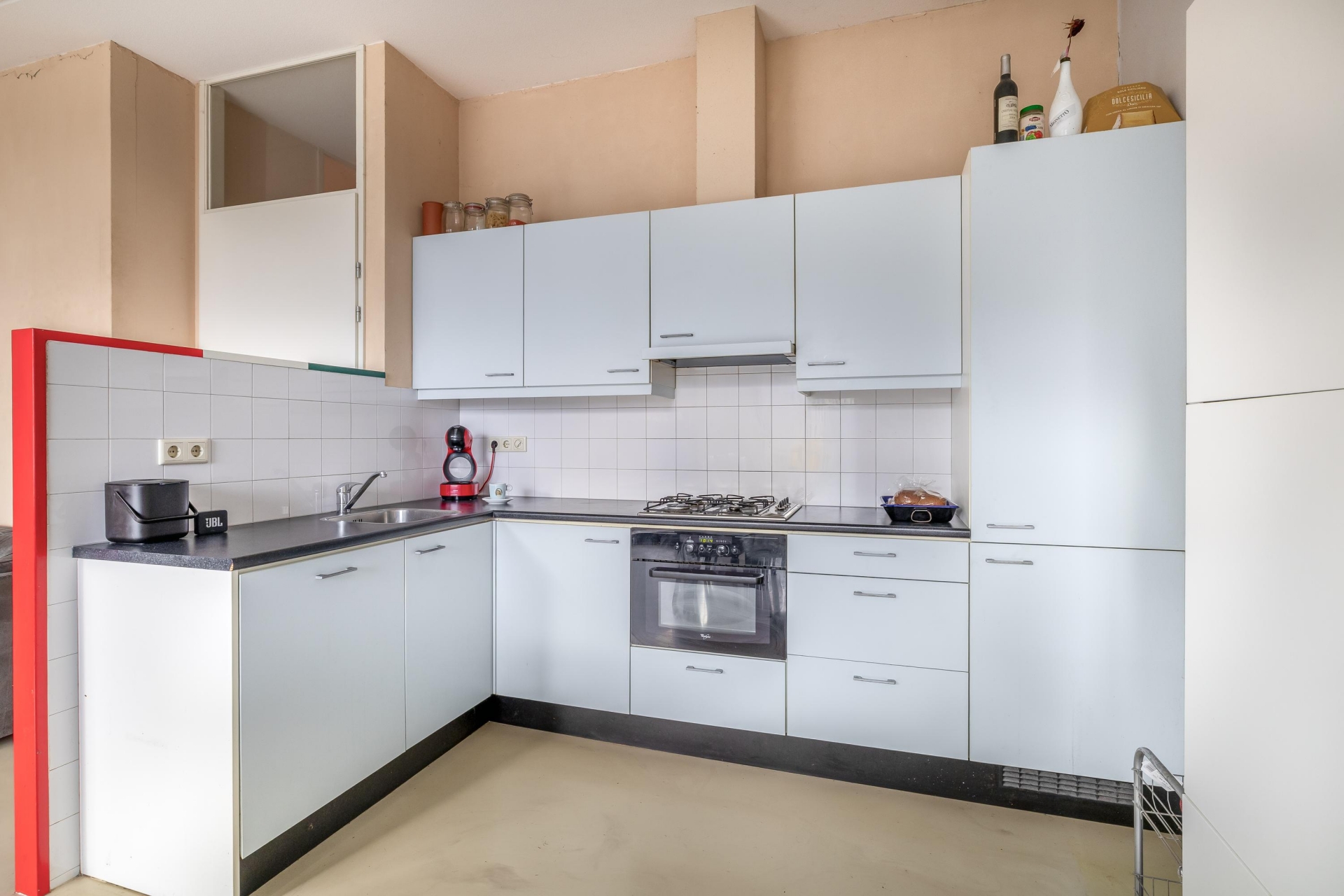 De woonkamer is zonder twijfel het hart van het huis. Dankzij de grote raampartijen en de schuifpui naar het balkon komt er veel natuurlijk licht binnen. Je hebt hier meer dan genoeg ruimte voor een royale zithoek én een flinke eettafel. De open keuken sluit hier mooi op aan en is uitgevoerd in een praktische L-opstelling met veel kastruimte, een gaskookplaat, oven en koel-vriescombinatie. Alles wat je nodig hebt om lekker te koken of gewoon een snelle maaltijd klaar te maken. Vanuit de woonkamer kijk je uit over de rustige straat en zie je de levendigheid van het dorp aan je voorbijtrekken, zonder dat het onrustig wordt.