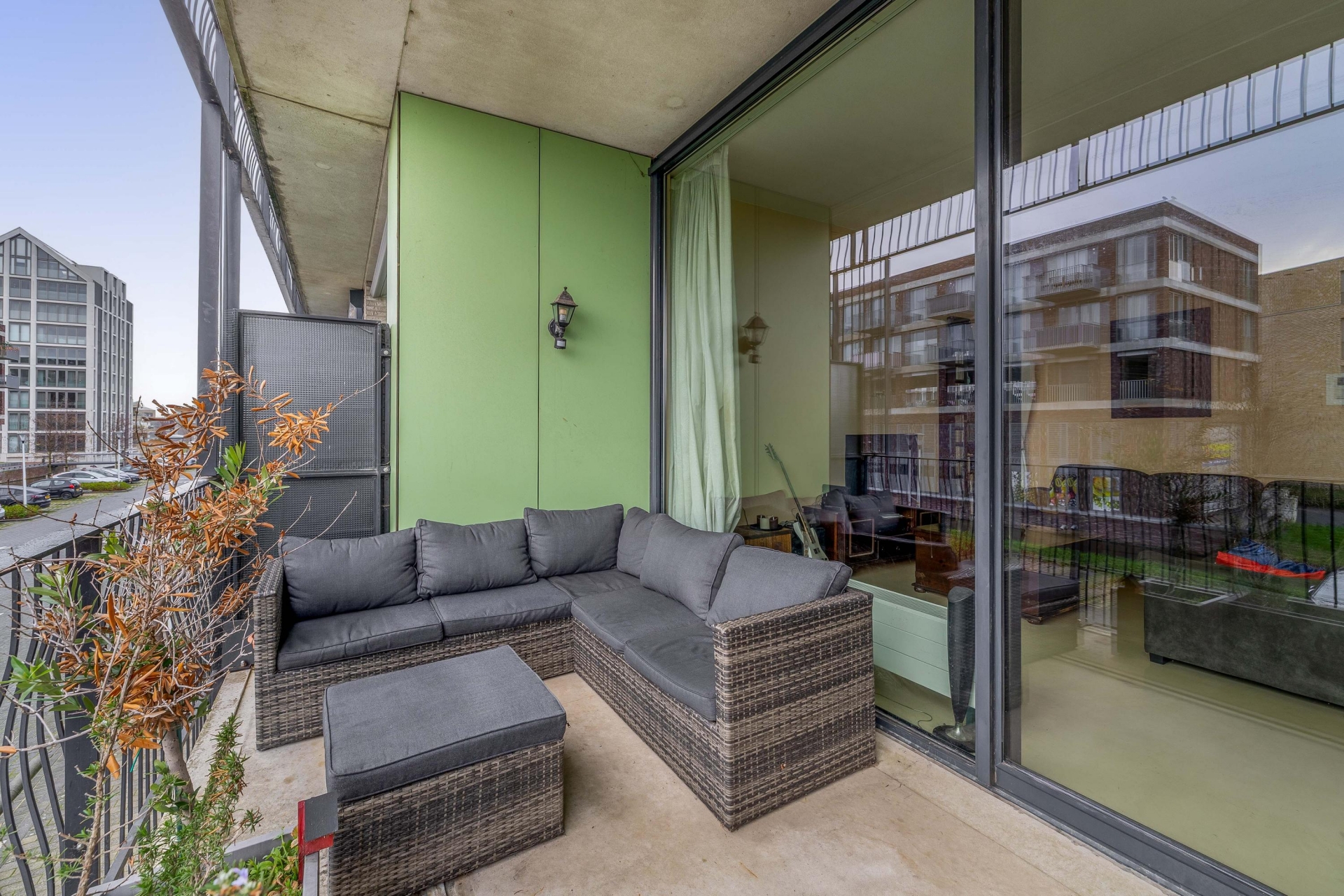 Een van de grootste pluspunten van dit appartement is het balkon op het zuidoosten. Je kunt hier in de ochtend heerlijk ontbijten in het zonnetje en ook in de middag is het hier goed toeven. Dankzij de ligging op de eerste verdieping kijk je vrij uit, maar heb je nog wel het gevoel van contact met de omgeving. Met genoeg plek voor een loungeset of een bistrotafel is dit een ideale buitenruimte om te ontspannen, lezen of borrelen met vrienden.