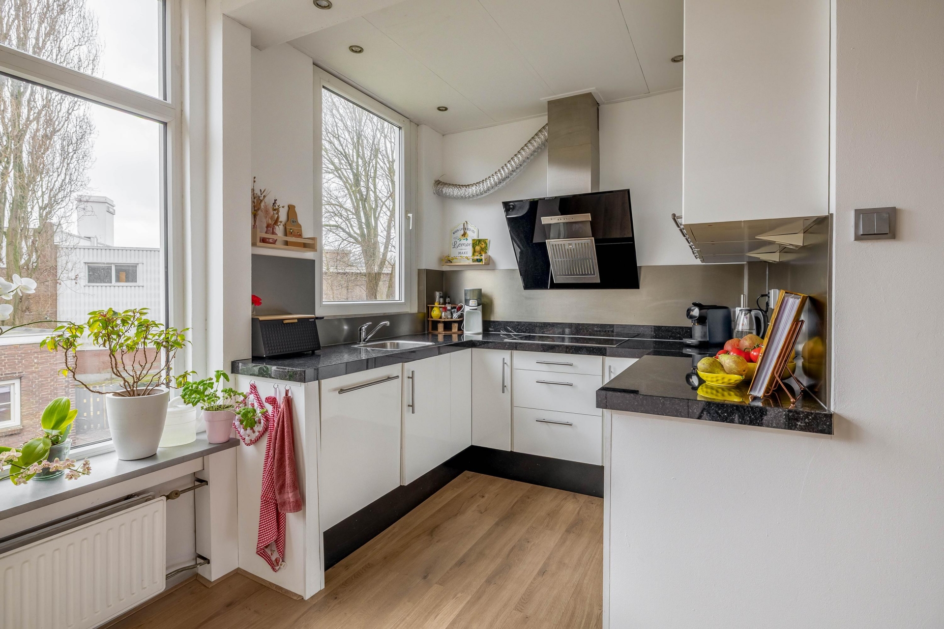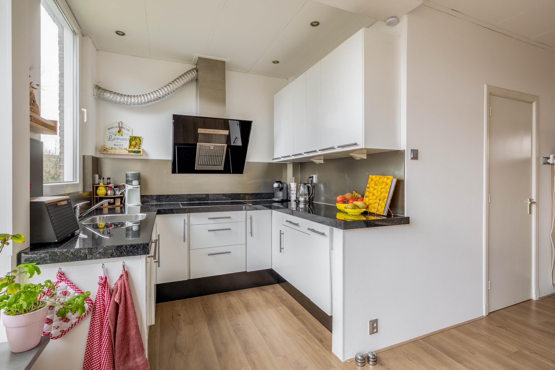 De keuken is opgesteld in een praktische hoekopstelling met donkere werkbladen en veel kastruimte. Door het raam valt prettig daglicht naar binnen en kijk je uit over de achtergelegen bebouwing.
