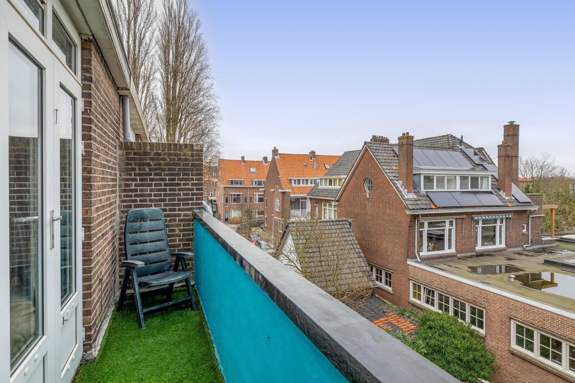 Aan de achterzijde, op de tweede verdieping, bevindt zich het balkon op het zuidoosten. Hier zit je heerlijk in de ochtend- en vroege middagzon met uitzicht over karakteristieke jaren ’30 bebouwing. Een fijne plek voor een kop koffie in de zon of om na een werkdag even buiten te zitten.