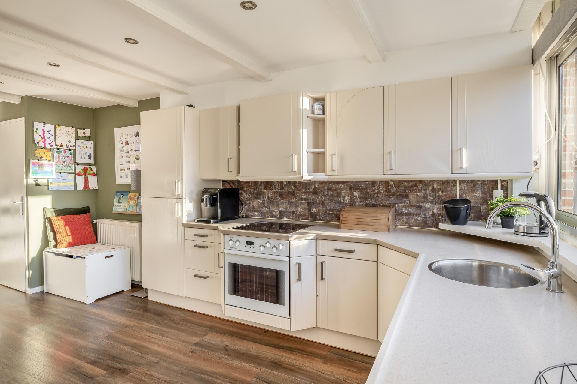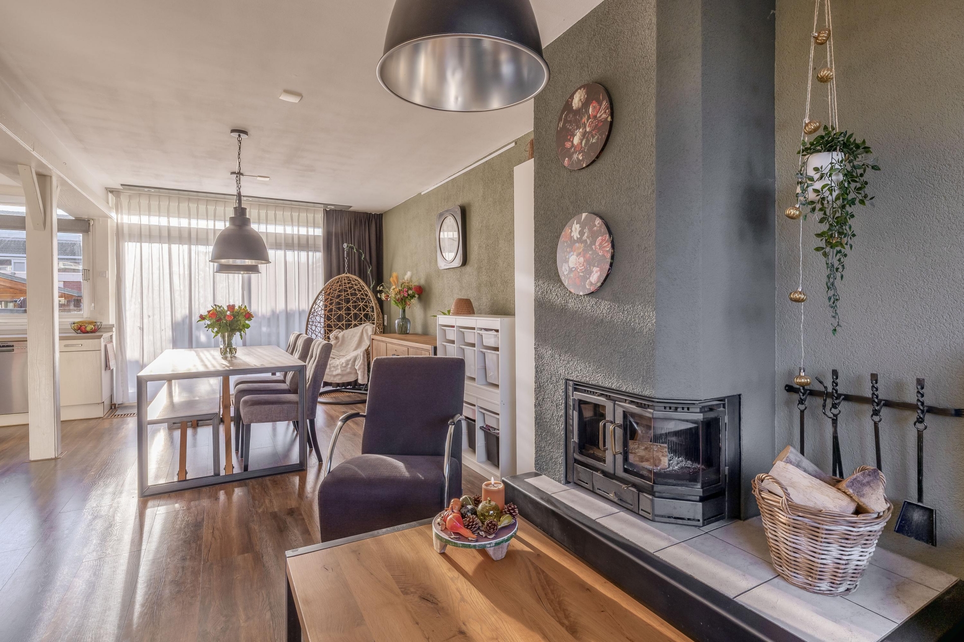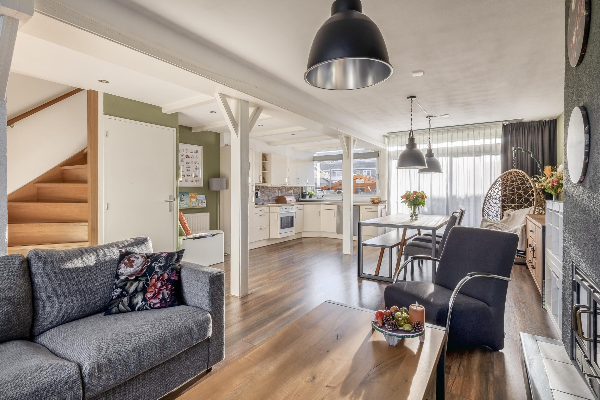 Binnenkomend in de woonkamer valt de lichtinval meteen op. De grote ramen aan beide zijden zorgen voor een fijne, open sfeer. De laminaat vloer, de lichte wanden en het open karakter maken de begane grond tot een gezellige leefruimte waar je je snel thuis voelt. De gesloten openhaard zorgt voor extra sfeer in de woonkamer. Aan de achterzijde bevindt zich de open keuken in L-opstelling, welke je volledig naar eigen smaak kan inrichten.