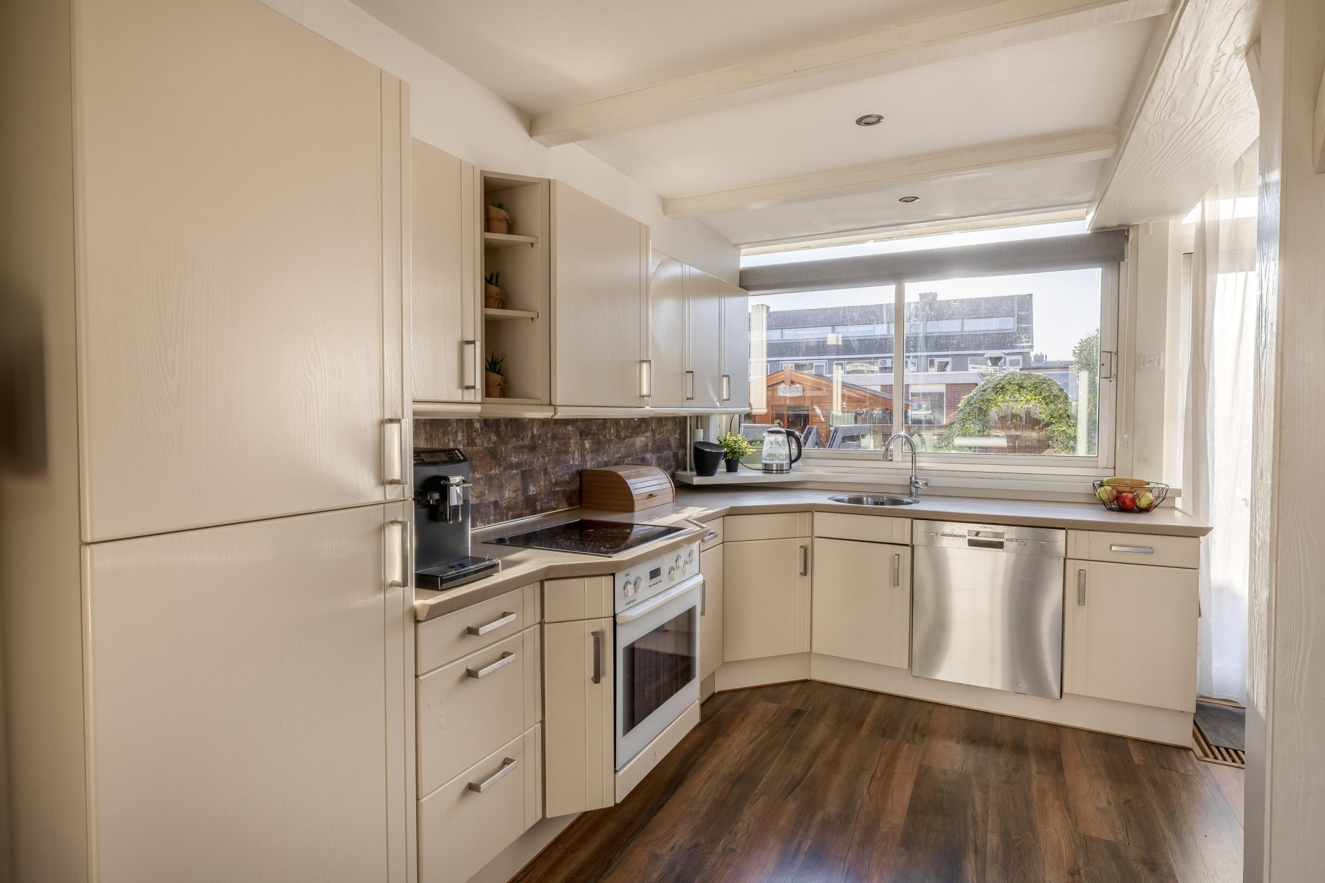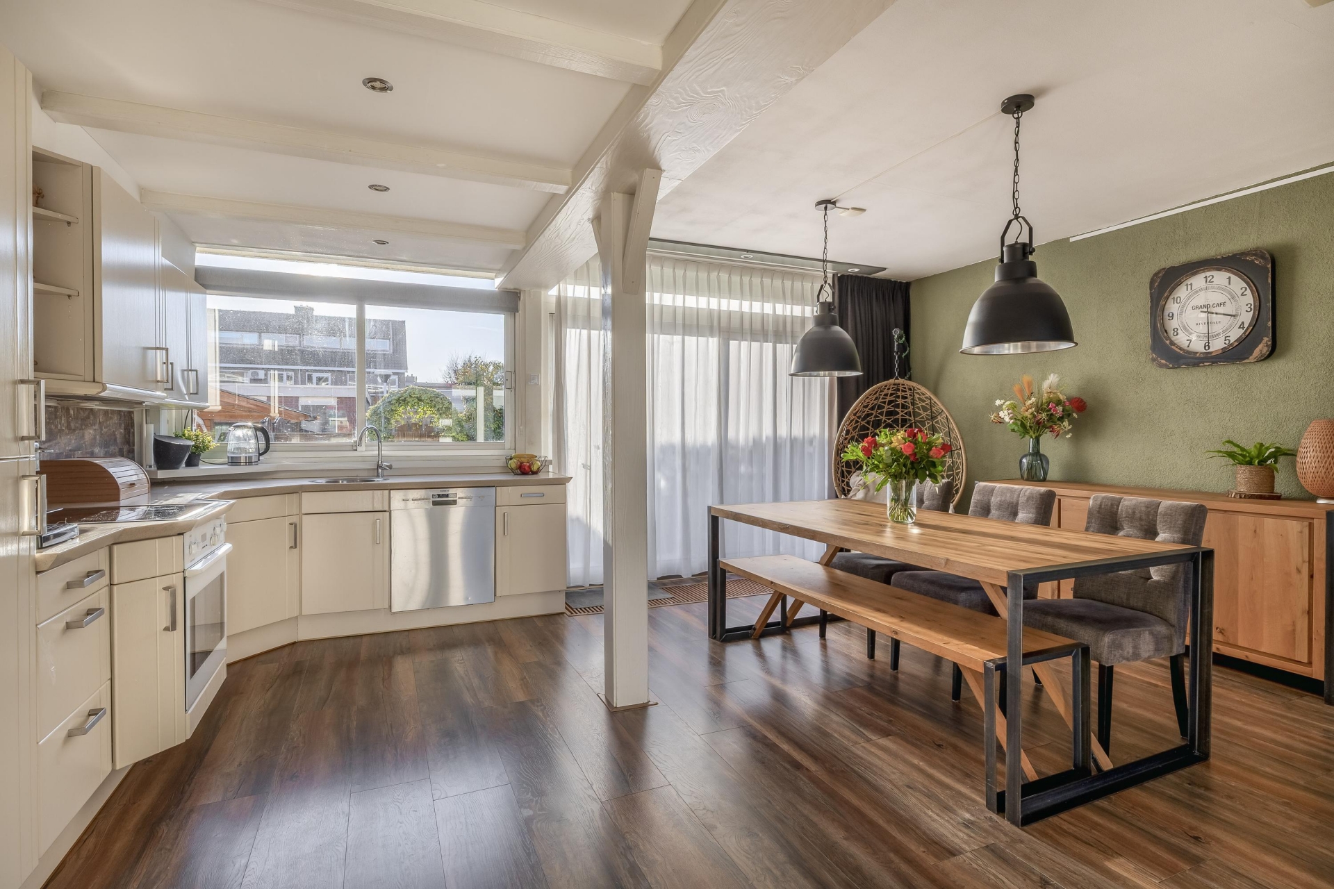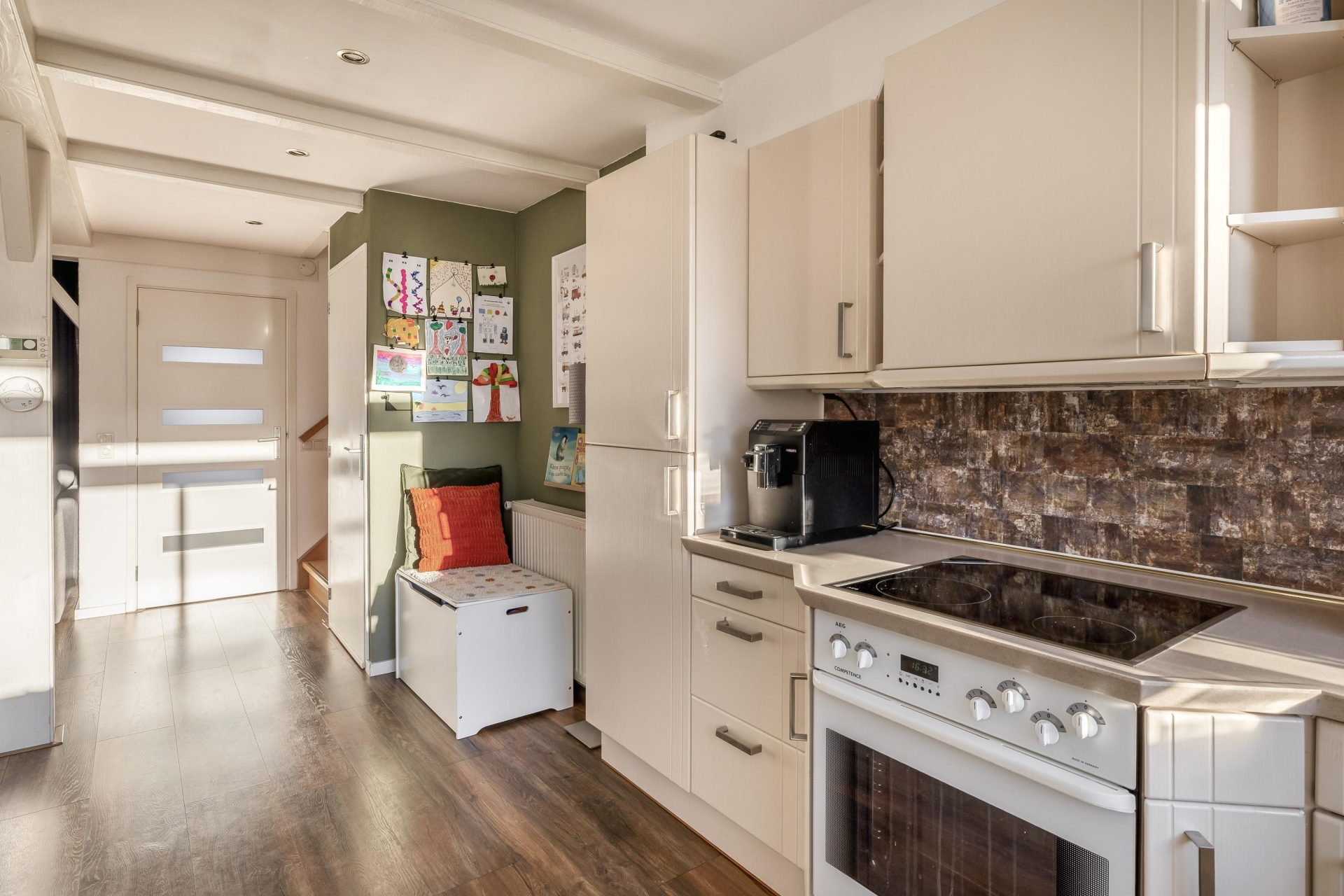 Binnenkomend in de woonkamer valt de lichtinval meteen op. De grote ramen aan beide zijden zorgen voor een fijne, open sfeer. De laminaat vloer, de lichte wanden en het open karakter maken de begane grond tot een gezellige leefruimte waar je je snel thuis voelt. De gesloten openhaard zorgt voor extra sfeer in de woonkamer. Aan de achterzijde bevindt zich de open keuken in L-opstelling, welke je volledig naar eigen smaak kan inrichten.