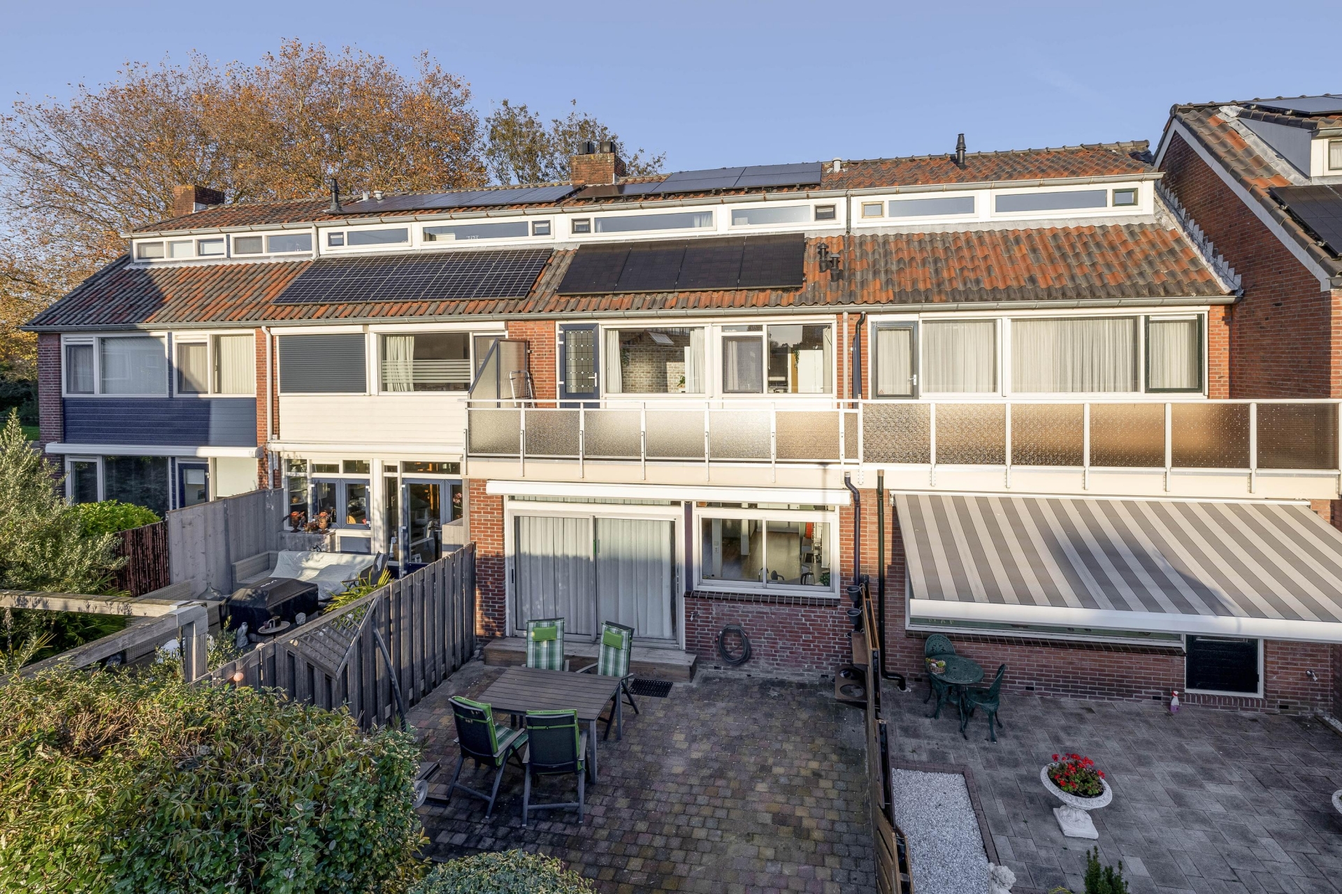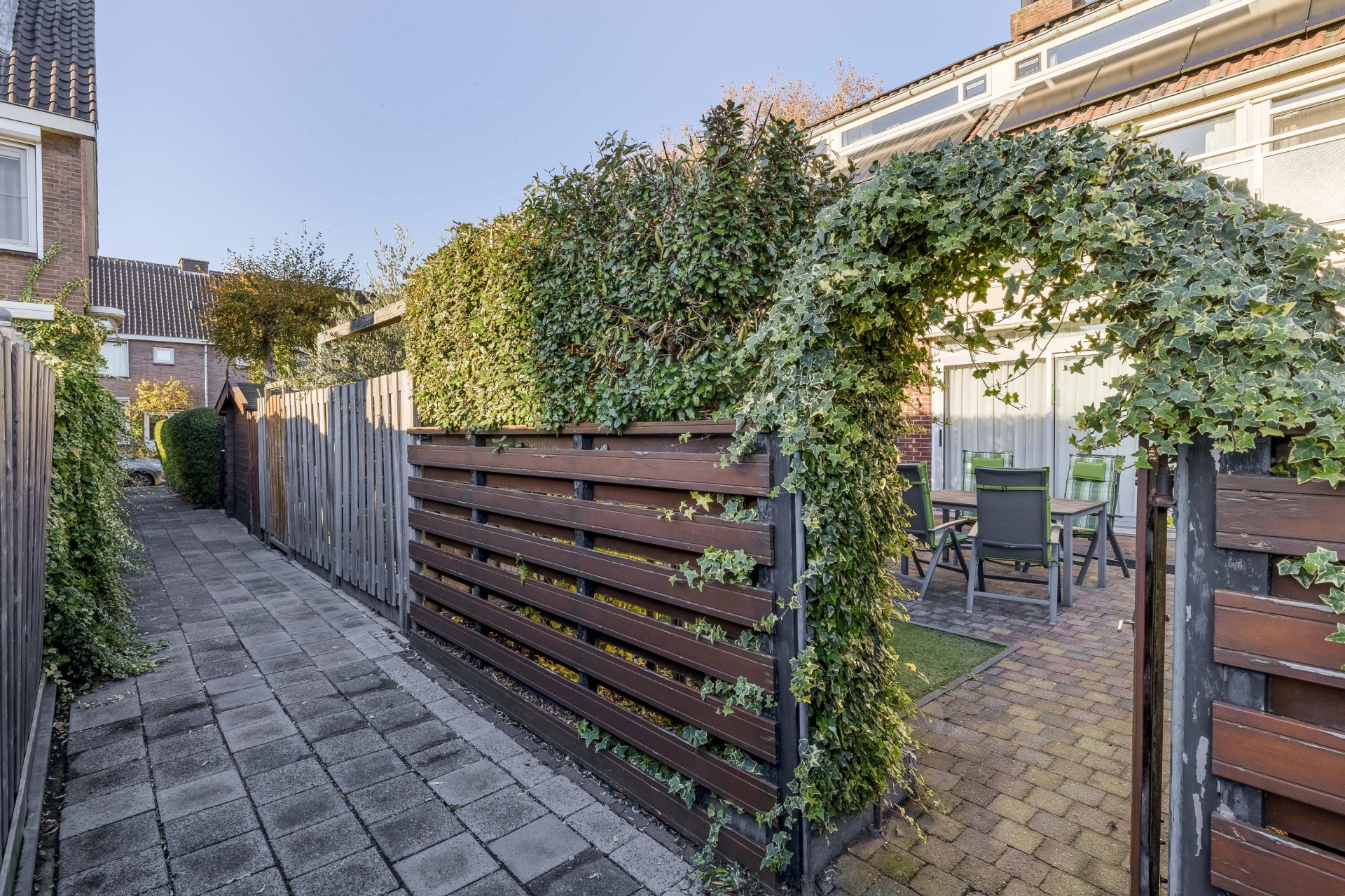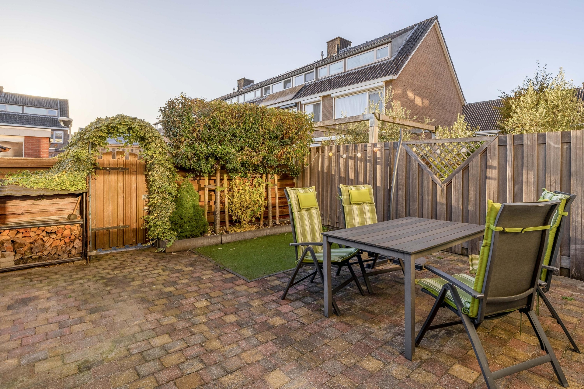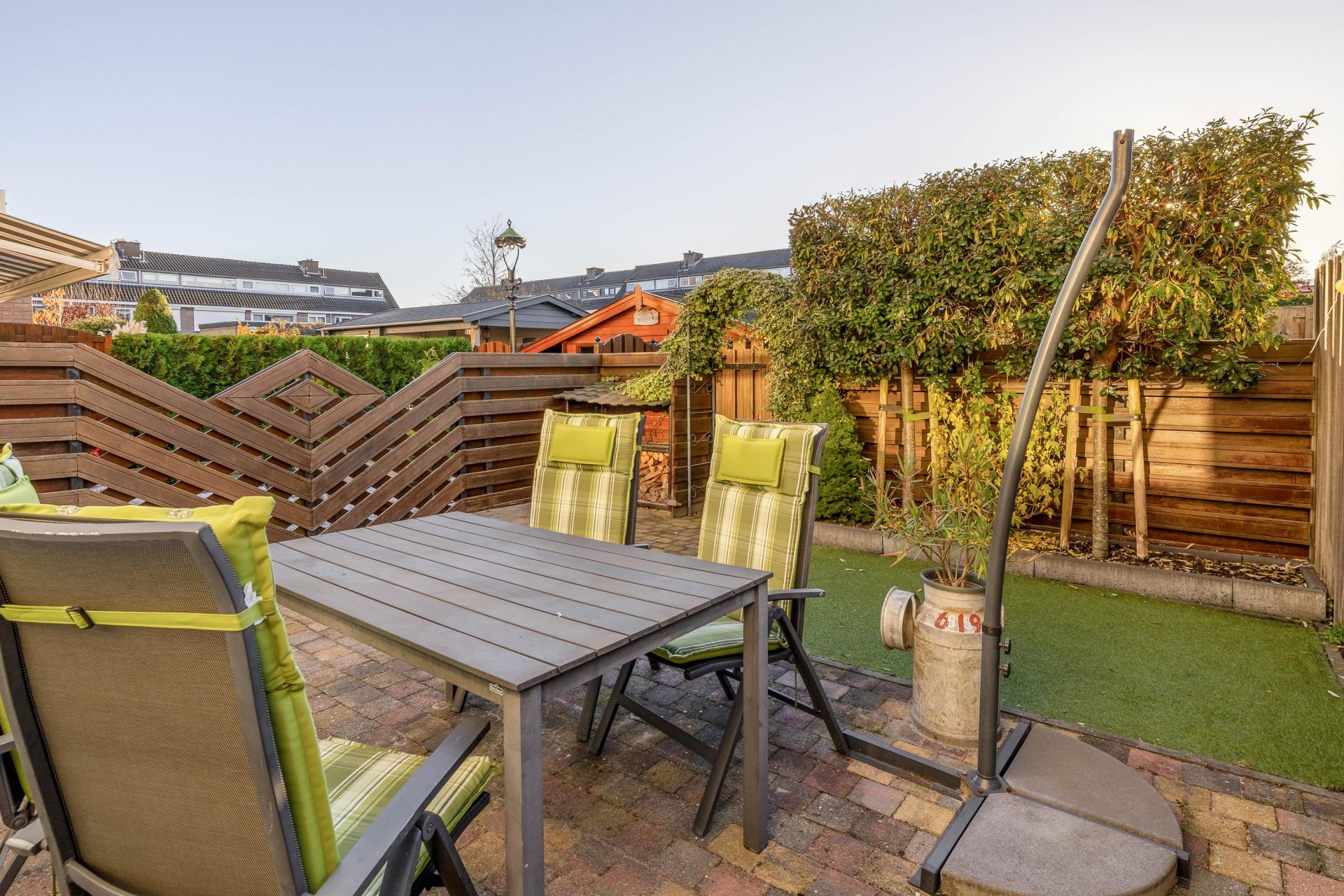 Via de schuifpui loop je zo de zonnige achtertuin in. Die is grotendeels betegeld, dus onderhoudsarm, maar ook aangekleed met groen. De ligging op het zuidwesten zorgt ervoor dat je hier vanaf de middag tot in de avond van de zon kunt genieten. Een fijne plek om te borrelen, barbecueën of gewoon even niets te doen. Enkele meters achter de tuin bevindt zich de berging.