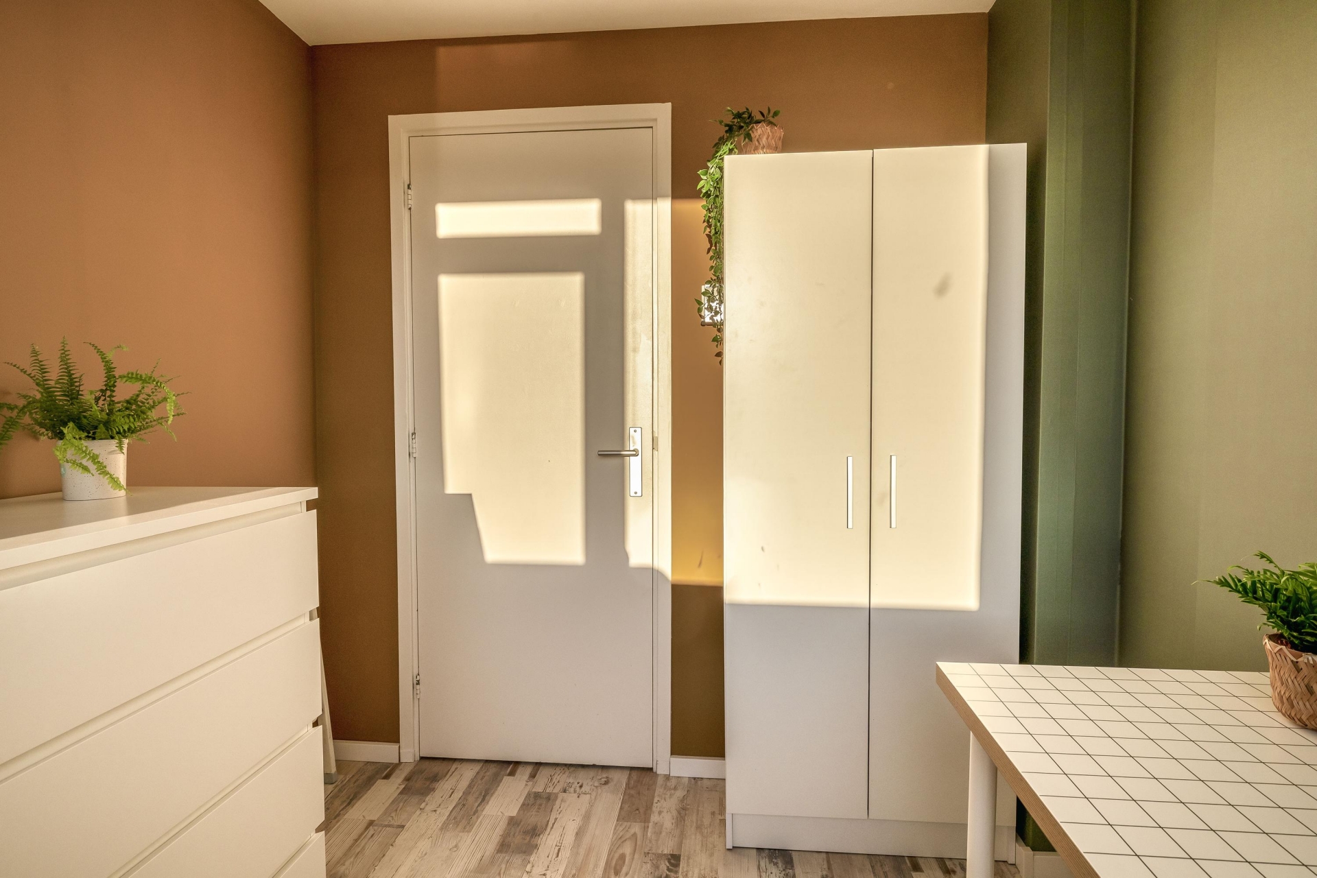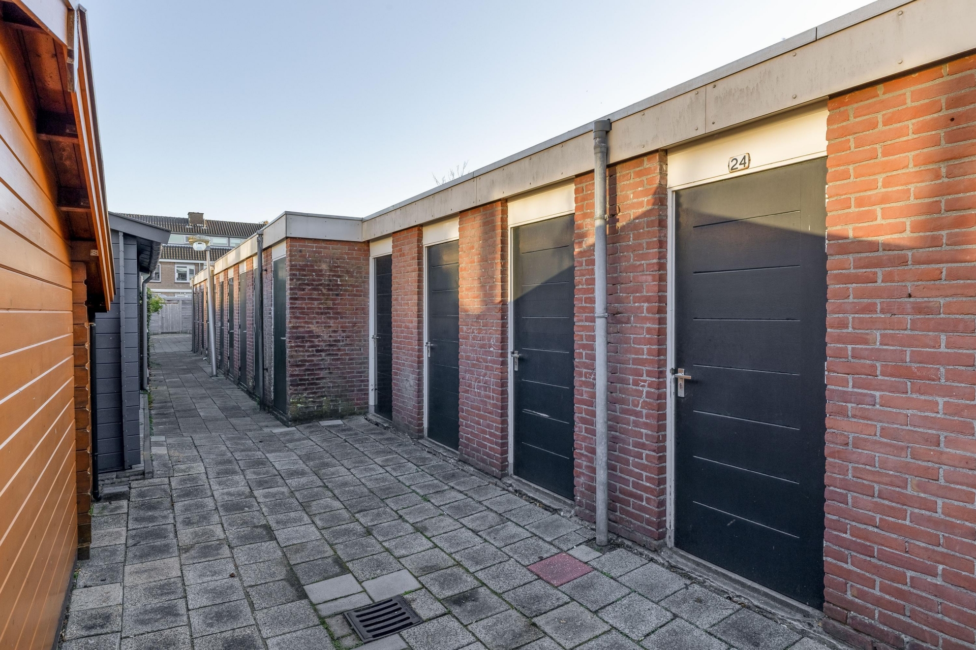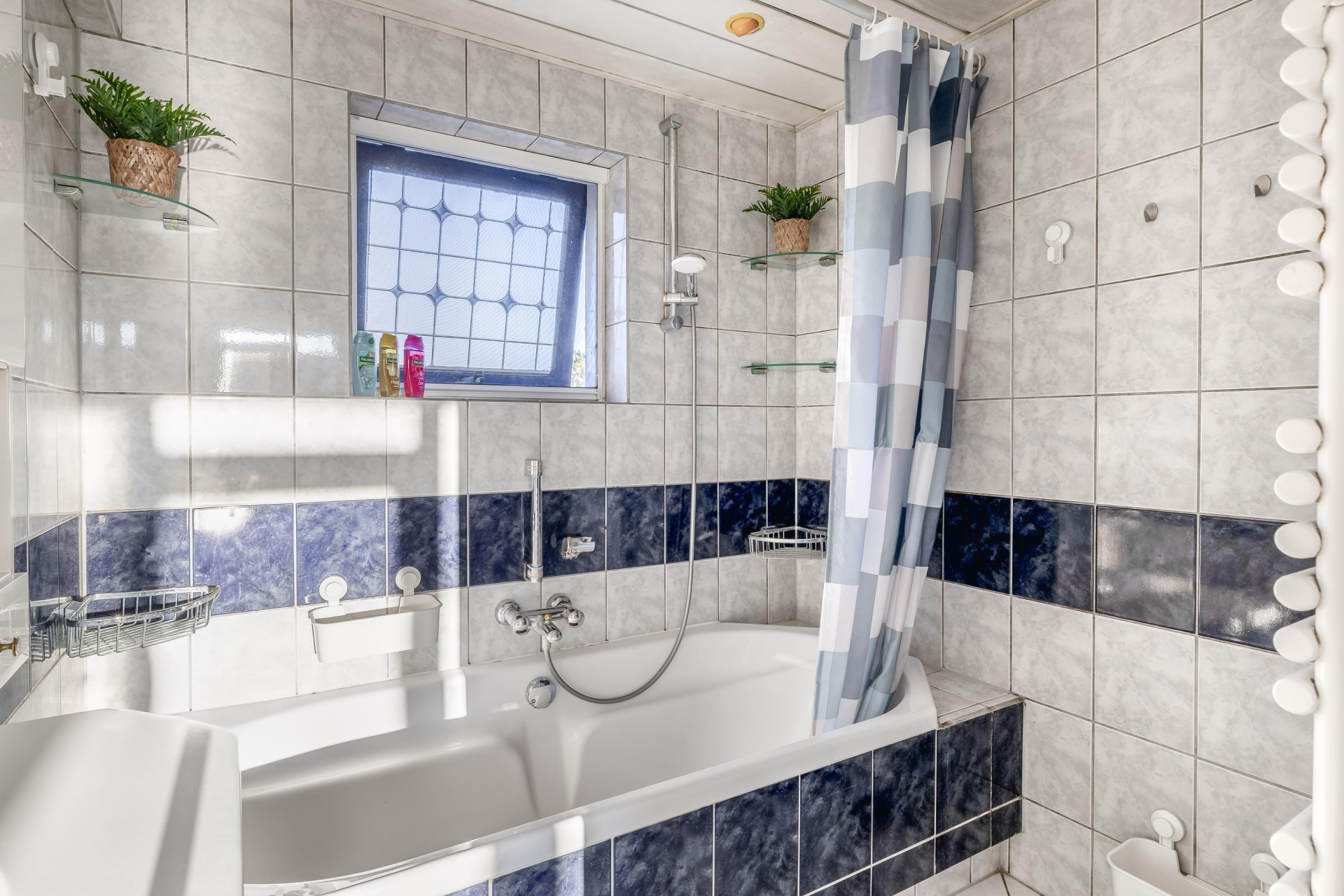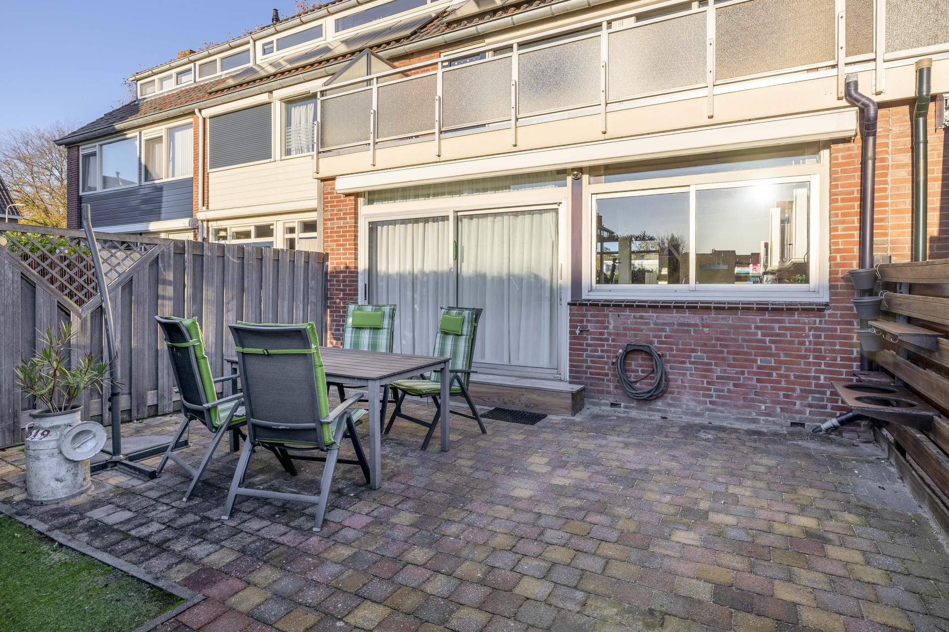 Via de schuifpui loop je zo de zonnige achtertuin in. Die is grotendeels betegeld, dus onderhoudsarm, maar ook aangekleed met groen. De ligging op het zuidwesten zorgt ervoor dat je hier vanaf de middag tot in de avond van de zon kunt genieten. Een fijne plek om te borrelen, barbecueën of gewoon even niets te doen. Enkele meters achter de tuin bevindt zich de berging.